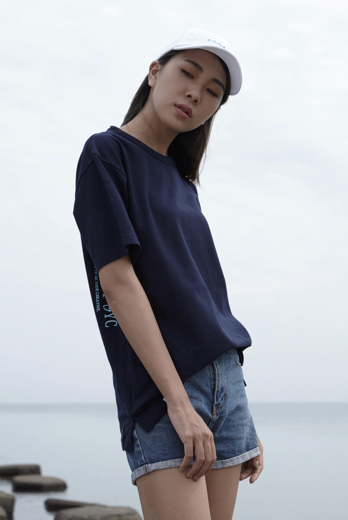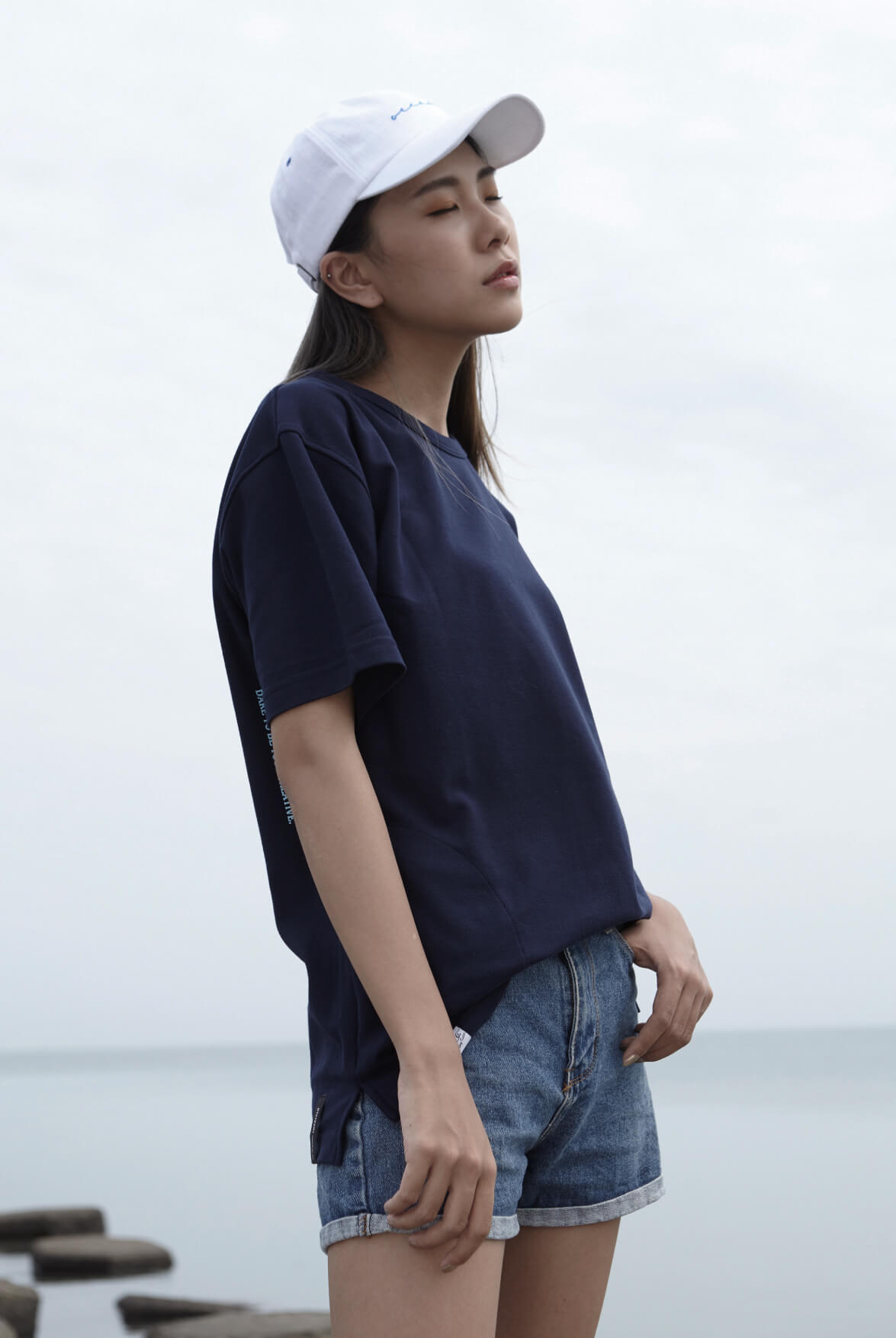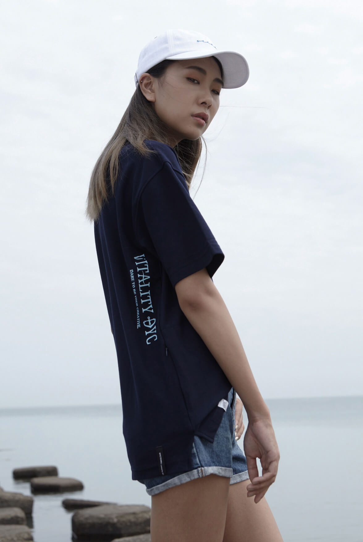 2. 正面胸口精緻繡花、背面右側印花設計。