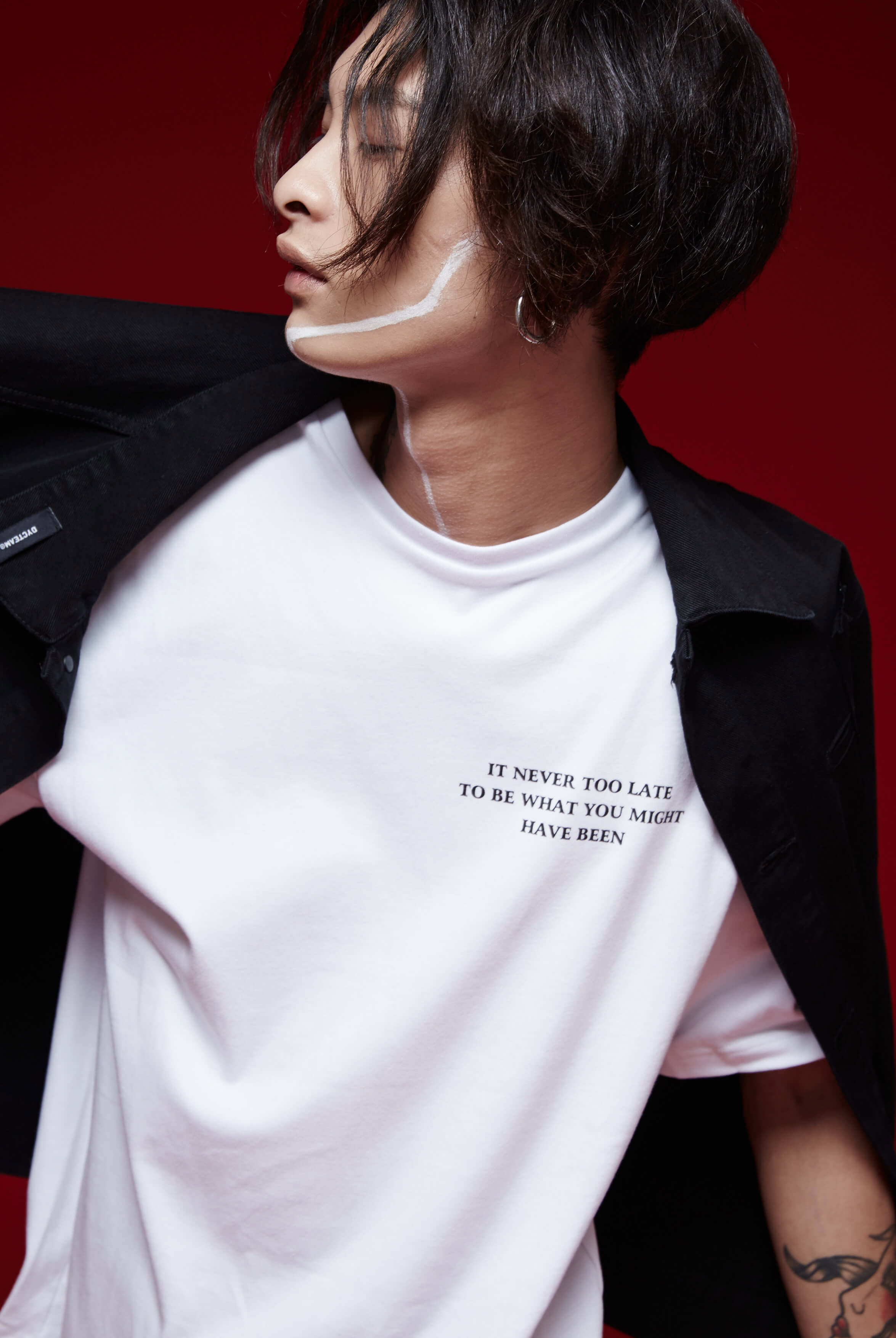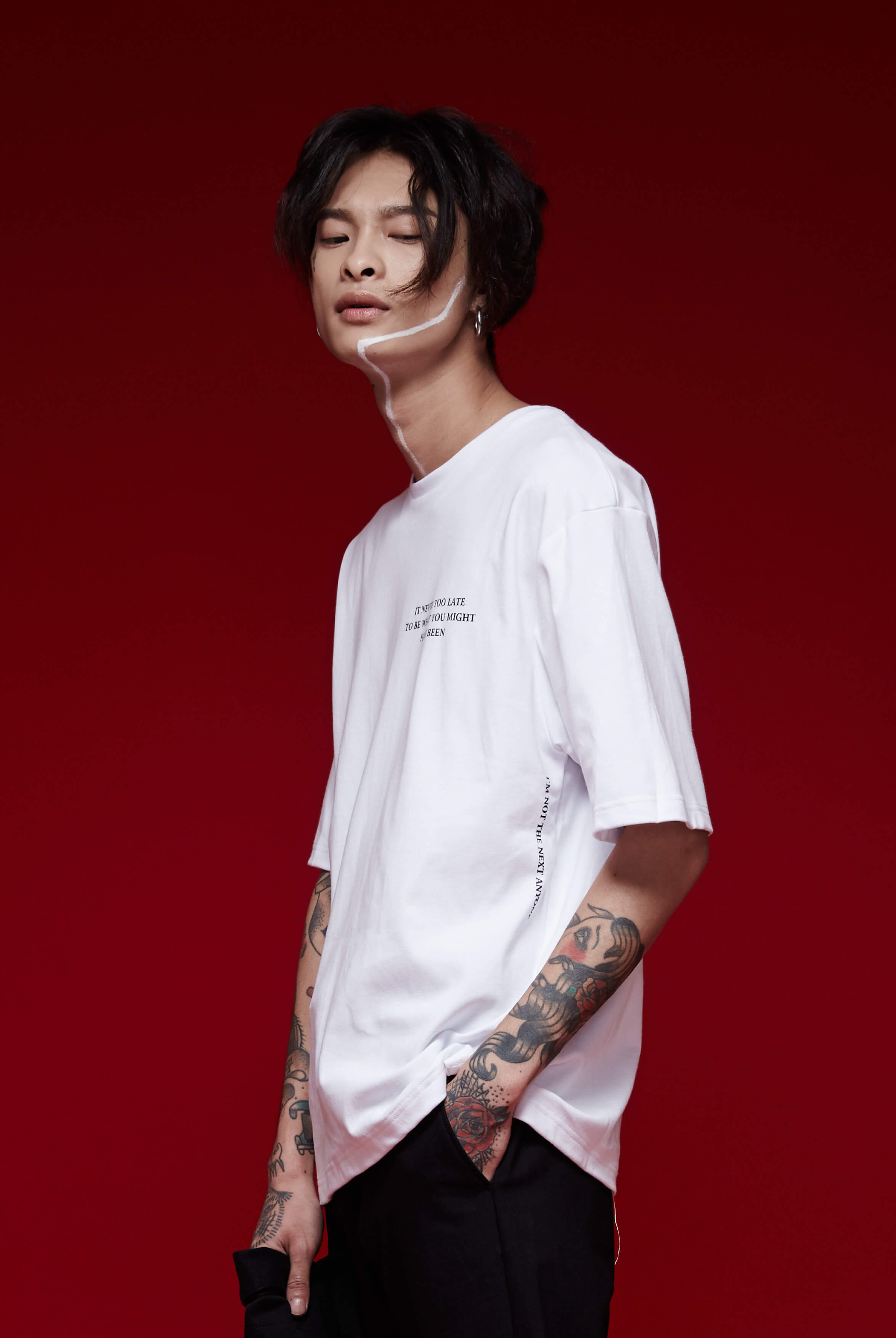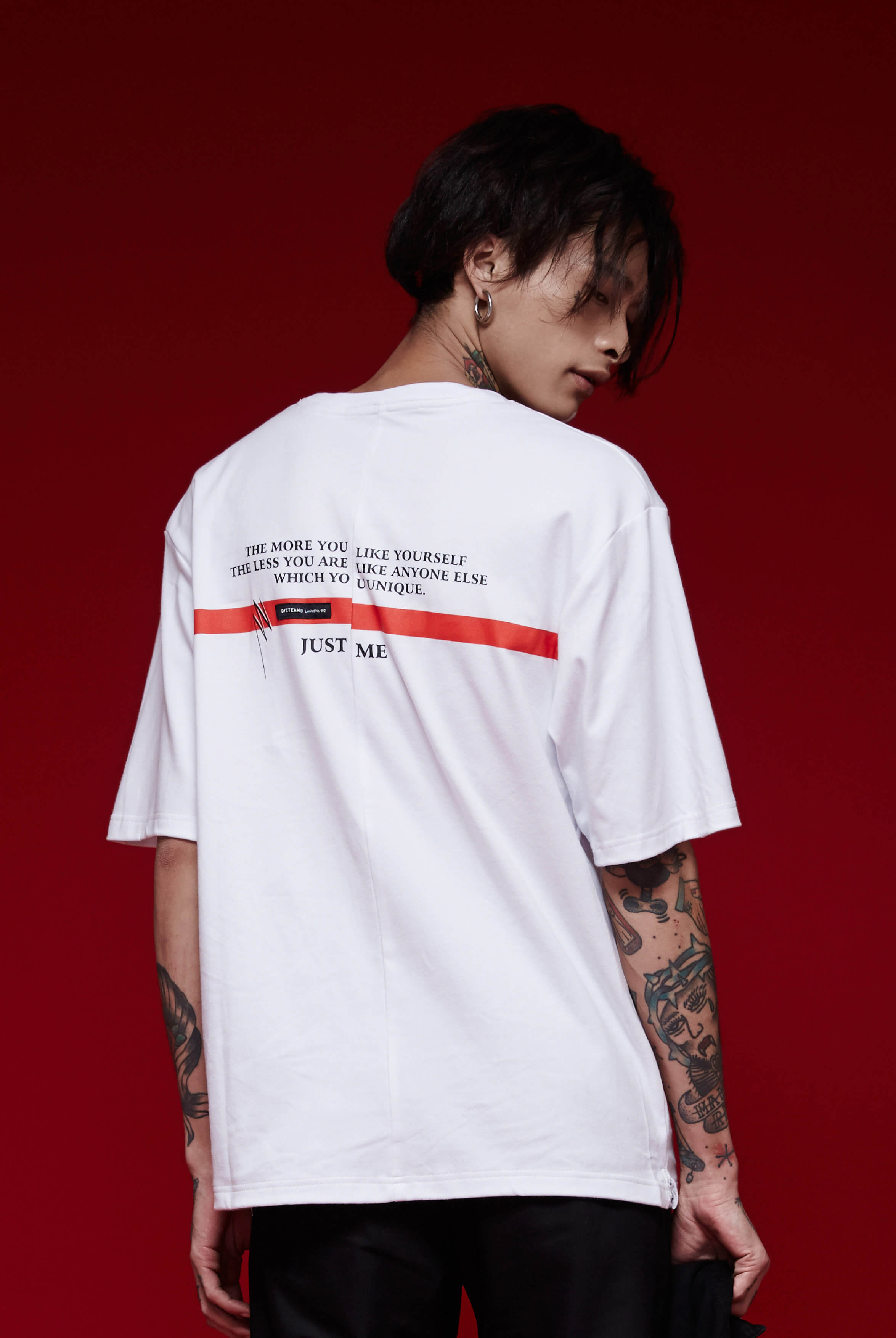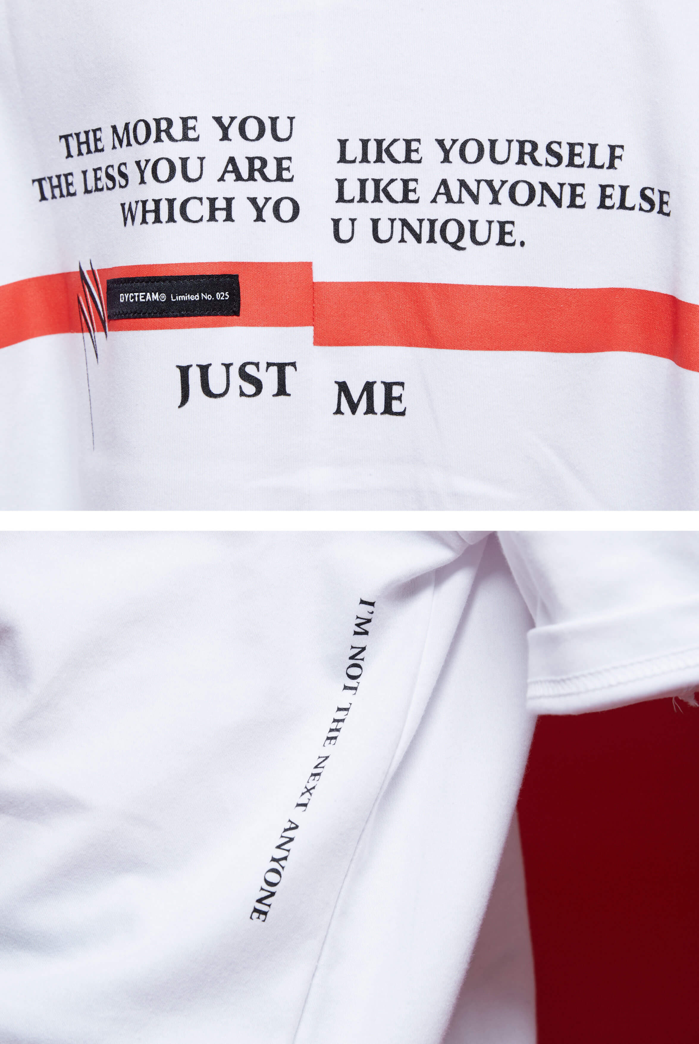 在這次的商品規劃上,結合了時下流行元素的過長袖,不收邊車縫、細緻的刷破處理,並大量運用「 I am not the next anyone.」、「You are looking fly today.」 等標語,同時結合鮮明紅色點綴細節,突顯此系列衷於自我的強烈性格展現。