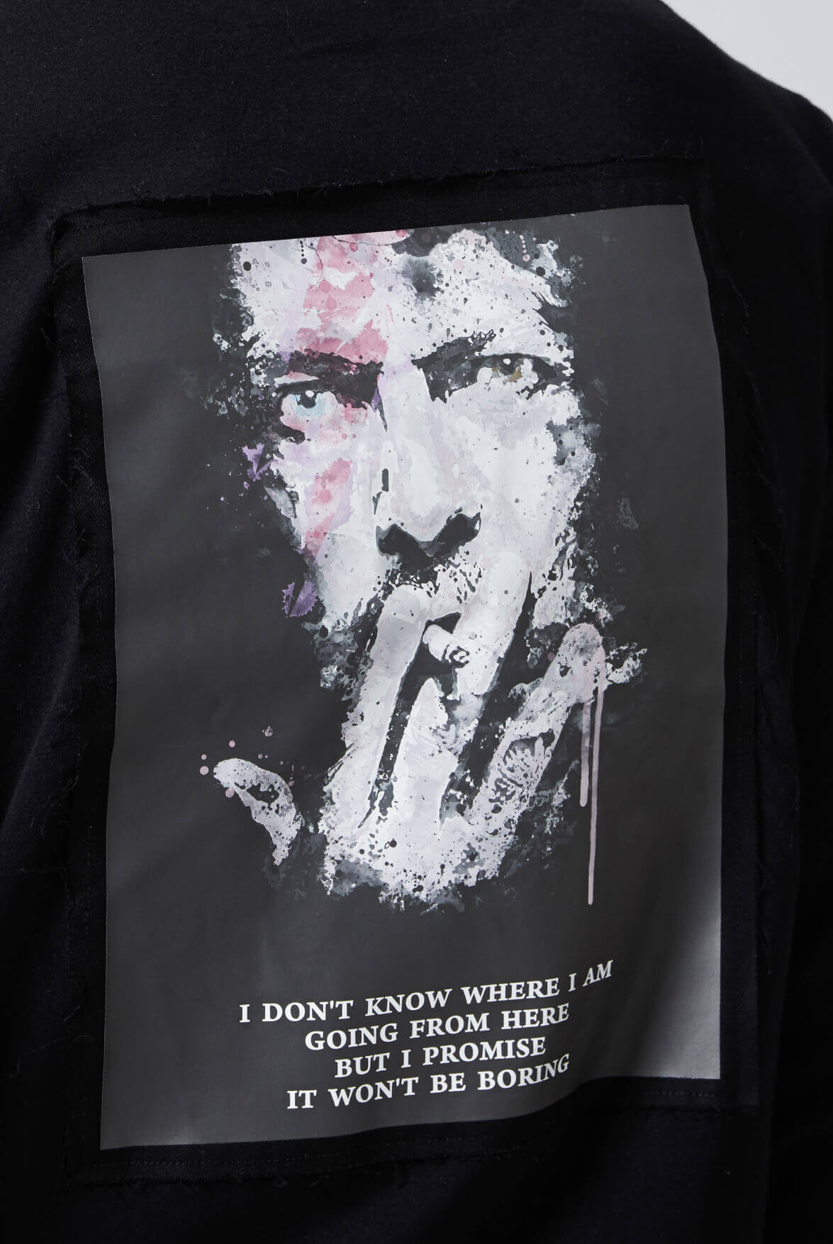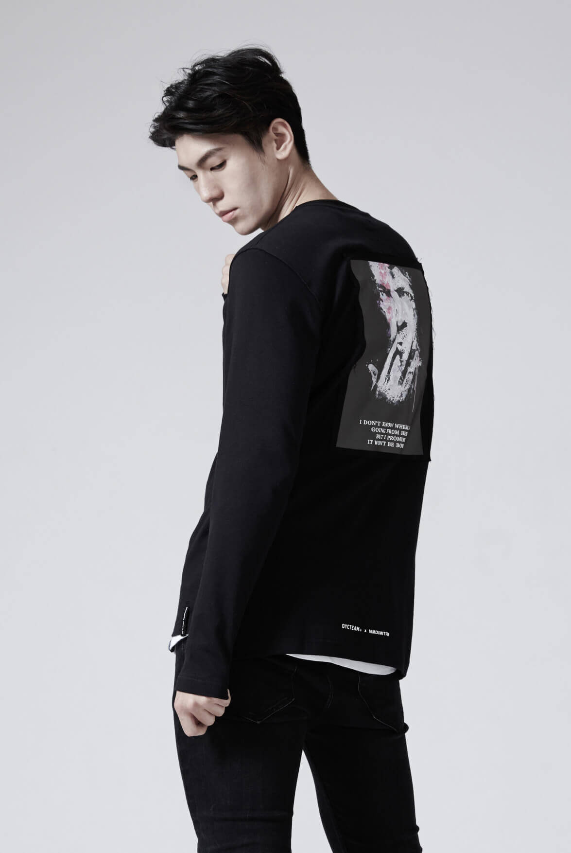 此系列以特別的貼布貫穿-將大衛‧ 鮑伊圖像先印製在異材質布片上,再以不收布邊車縫呈現自然的毛鬚感,呼應主角一生追求自我定義不受時代約束的開創性風格,也正是DYCTEAM品牌 Define Your Character 的核心精神。