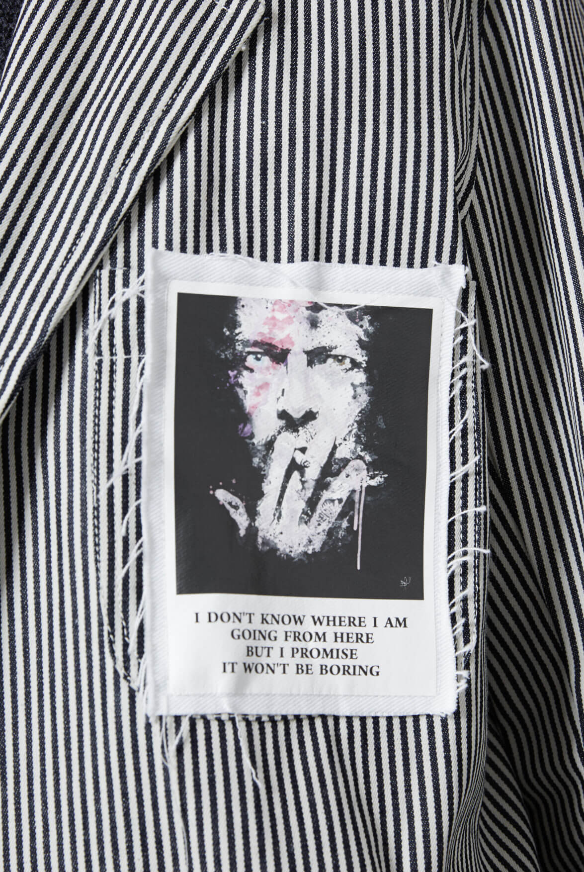 此系列以特別的貼布貫穿-將大衛‧ 鮑伊圖像先印製在異材質布片上,再以不收布邊車縫呈現自然的毛鬚感,呼應主角一生追求自我定義不受時代約束的開創性風格,也正是DYCTEAM品牌 Define Your Character 的核心精神。
