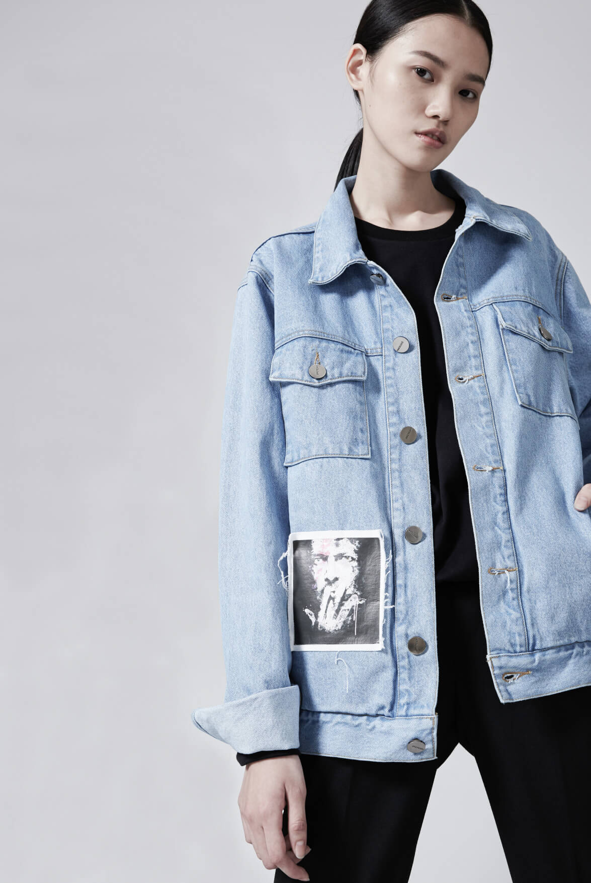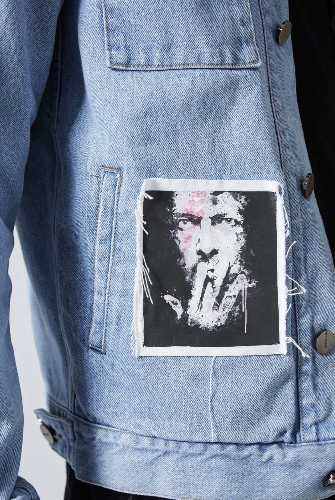 此系列以特別的貼布貫穿-將大衛‧ 鮑伊圖像先印製在異材質布片上,再以不收布邊車縫呈現自然的毛鬚感,呼應主角一生追求自我定義不受時代約束的開創性風格,也正是DYCTEAM品牌 Define Your Character 的核心精神。