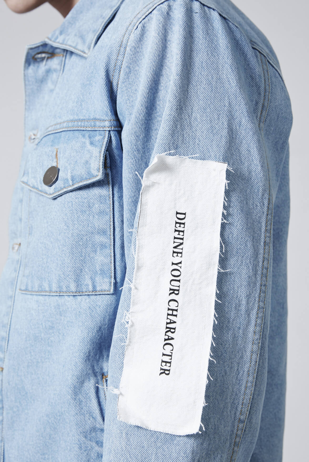 - 左袖不收邊貼布標語印花設計。