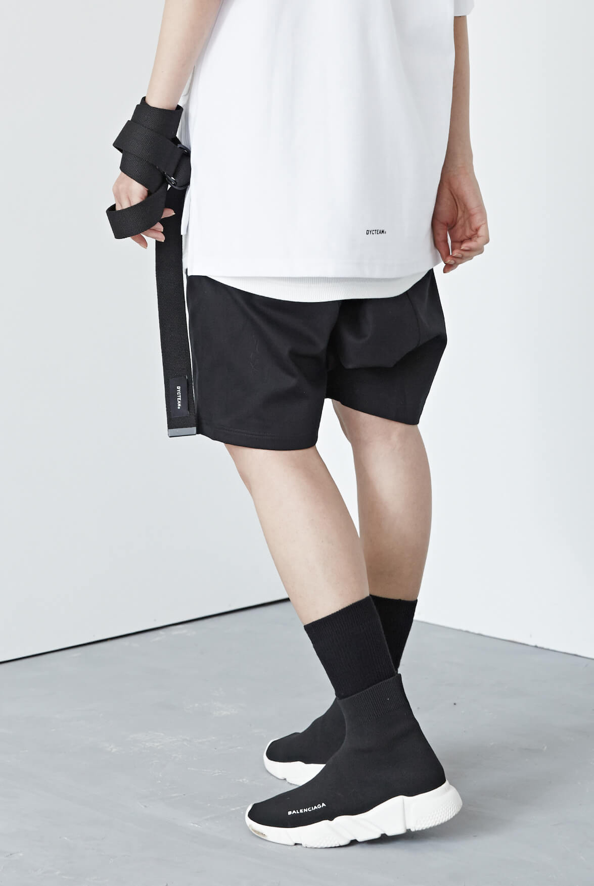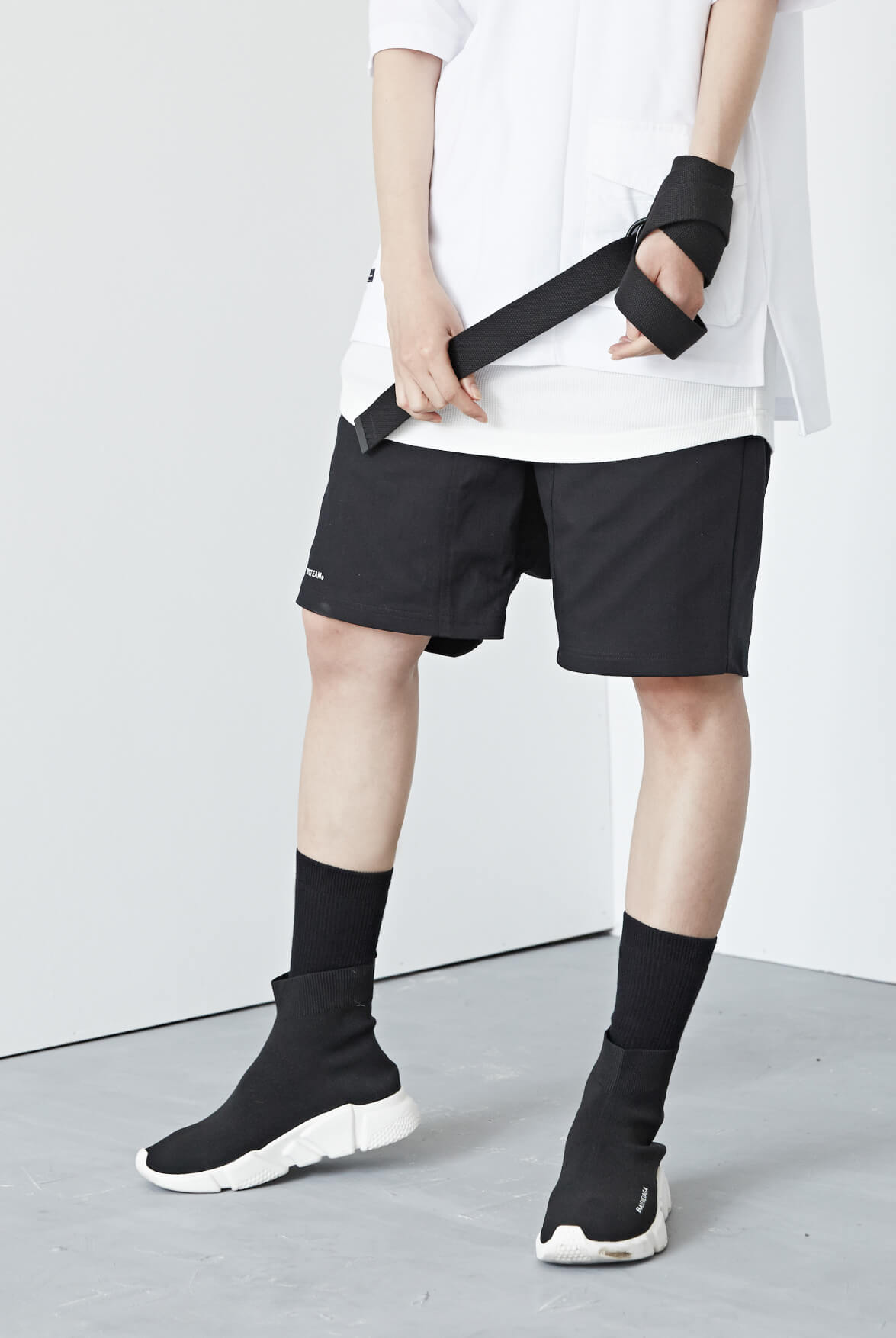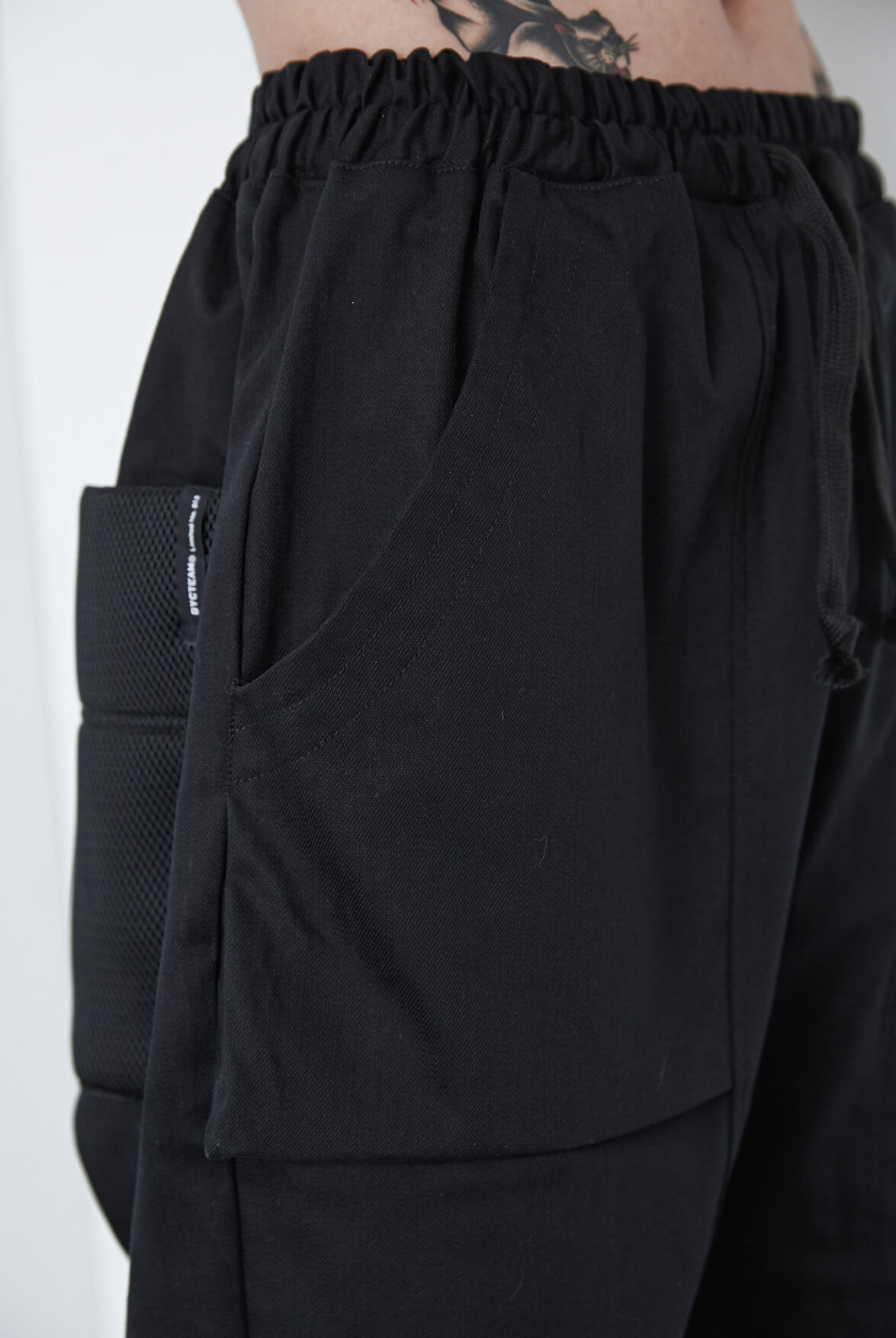 - 鬆緊褲頭、兩側大口袋剪裁、後口袋異材質網洞拼接。