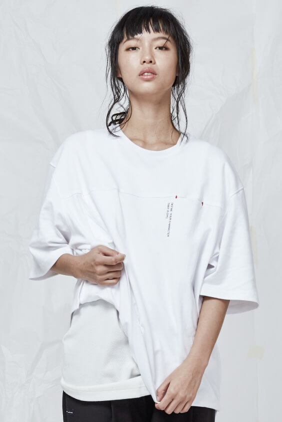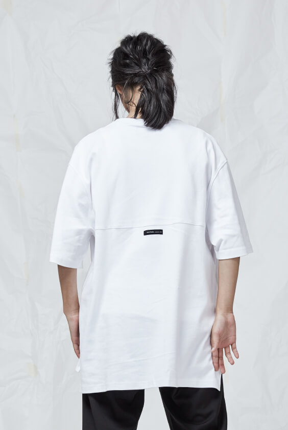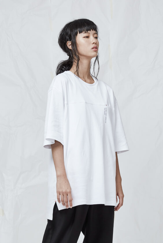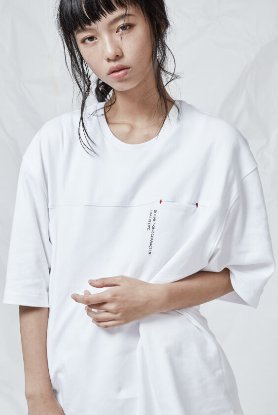 - 左胸標語印花及隱藏袋、右胸斜切裝飾袋。