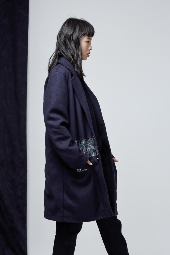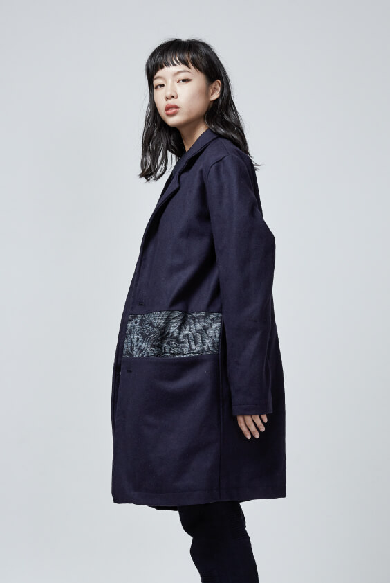 - 厚羊毛長版大衣、中段異材質拼接緹花面料。