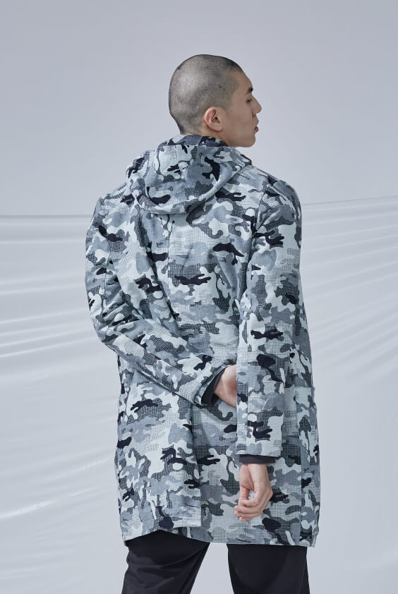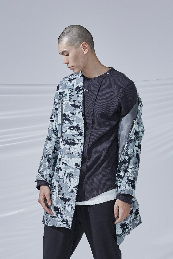 - 大衣拼接中段,在相同面料中展現獨特巧思的視覺風格。