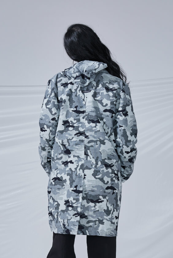 - 大衣拼接中段,在相同面料中展現獨特巧思的視覺風格。