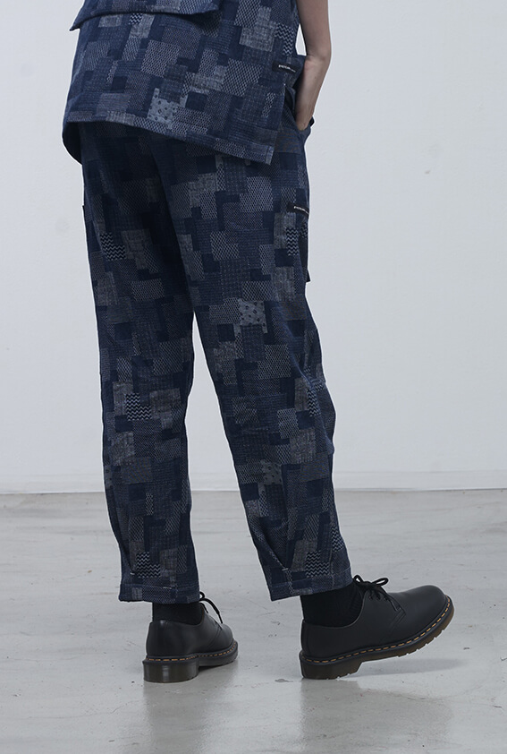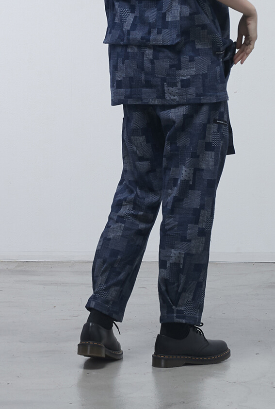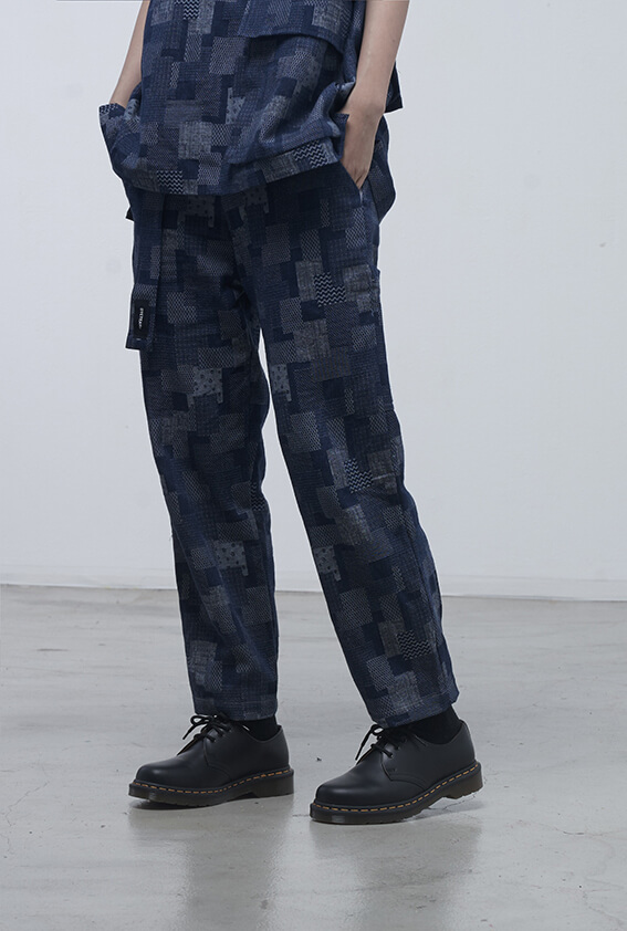 - 褲管後左側貼袋設計、上方為19SS標語印刷。