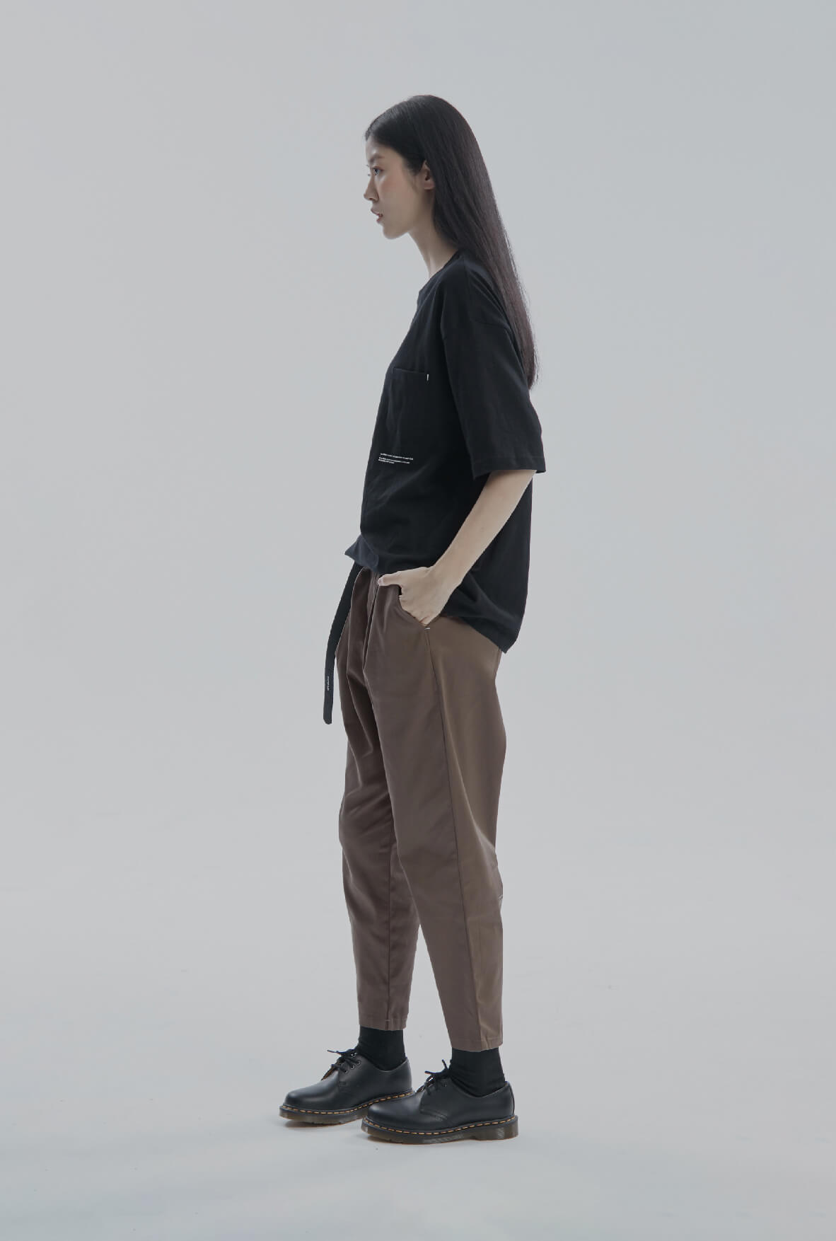 - 整體為修身九分褲版型、褲腰雙打褶剪裁設計。