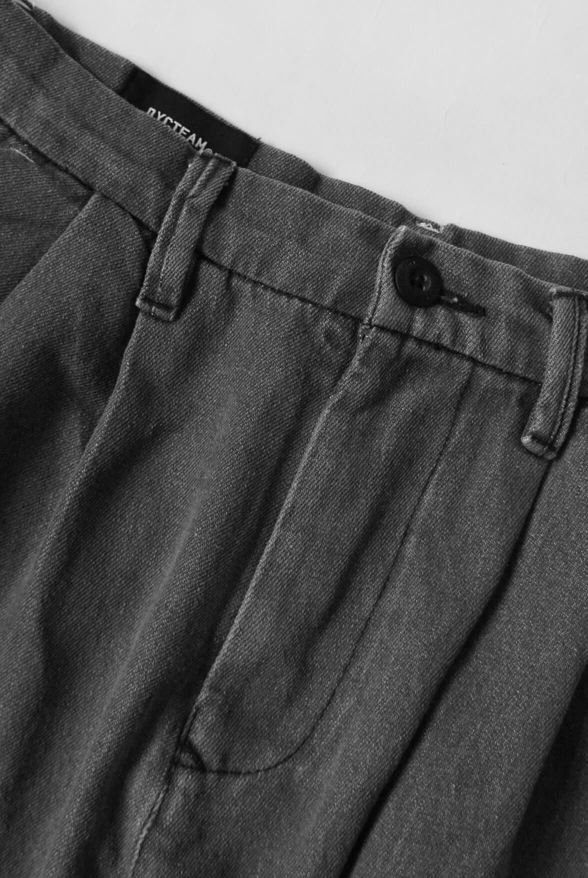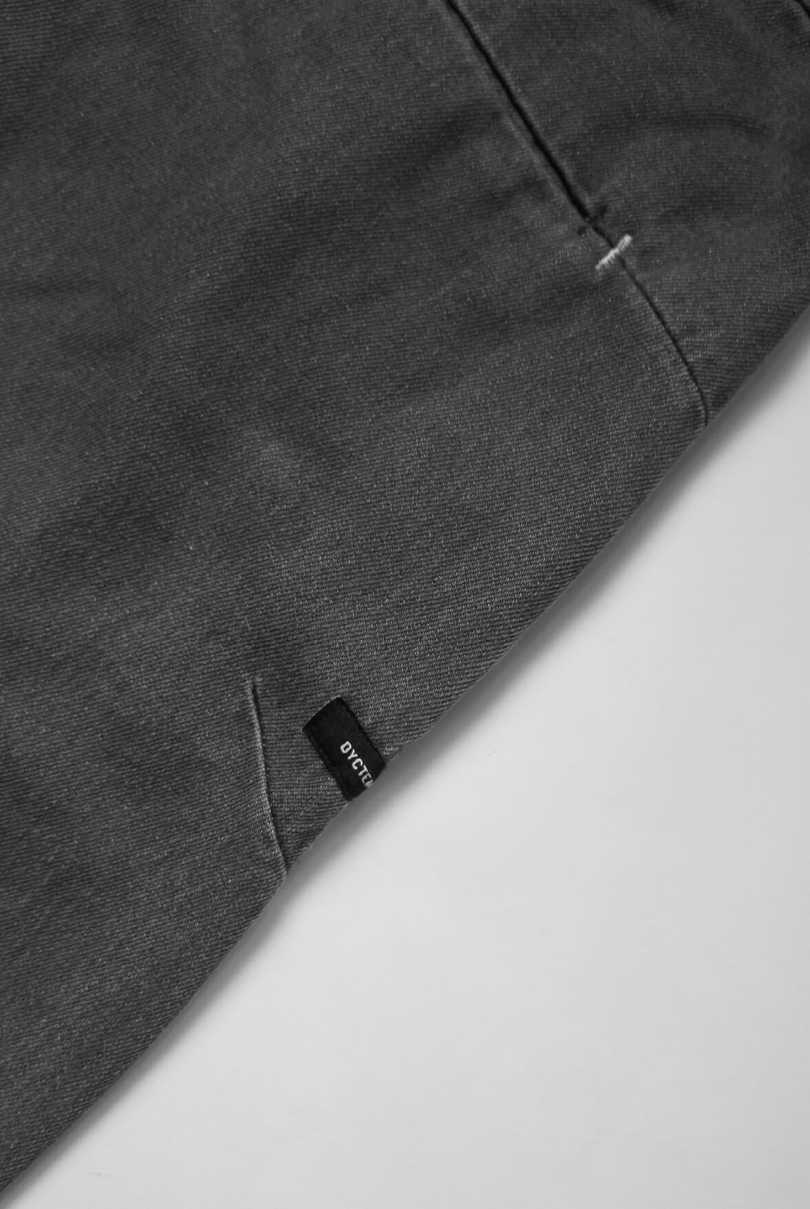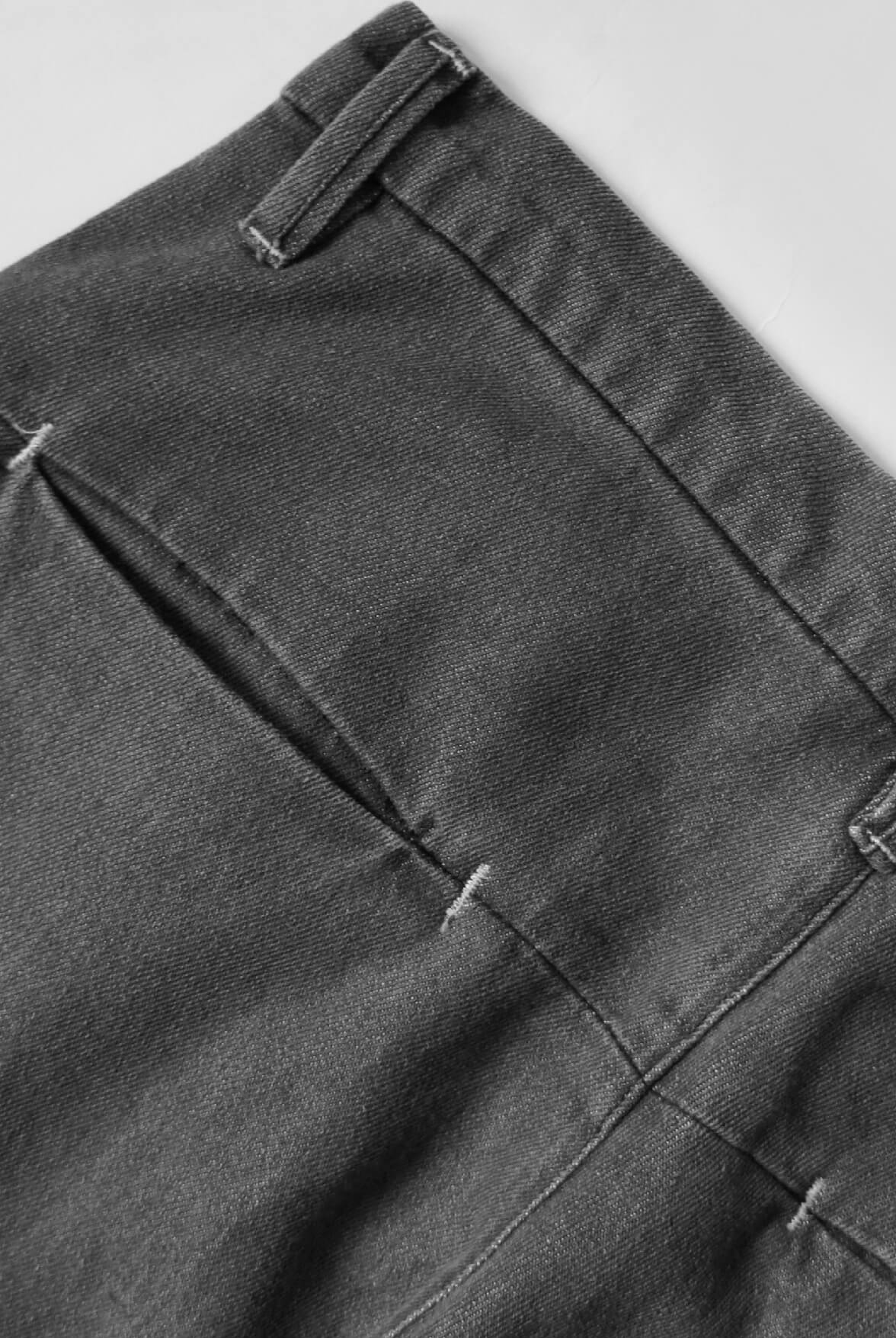 - 使用黑色丹寧水洗面料製成,水洗後呈現自然灰色。
