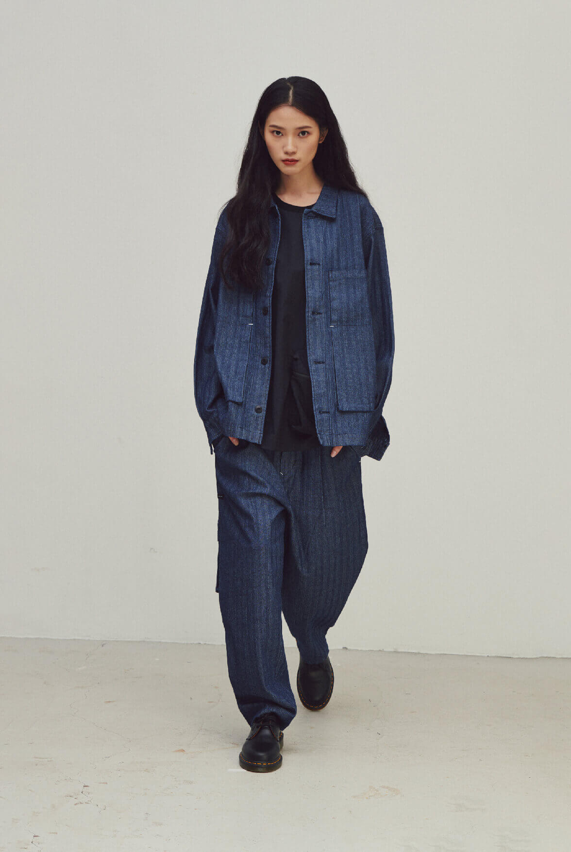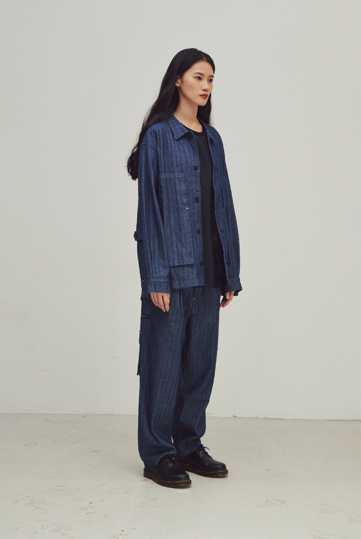 - 寬鬆工裝外套,正面兩側大口袋拼接、四口袋構造。