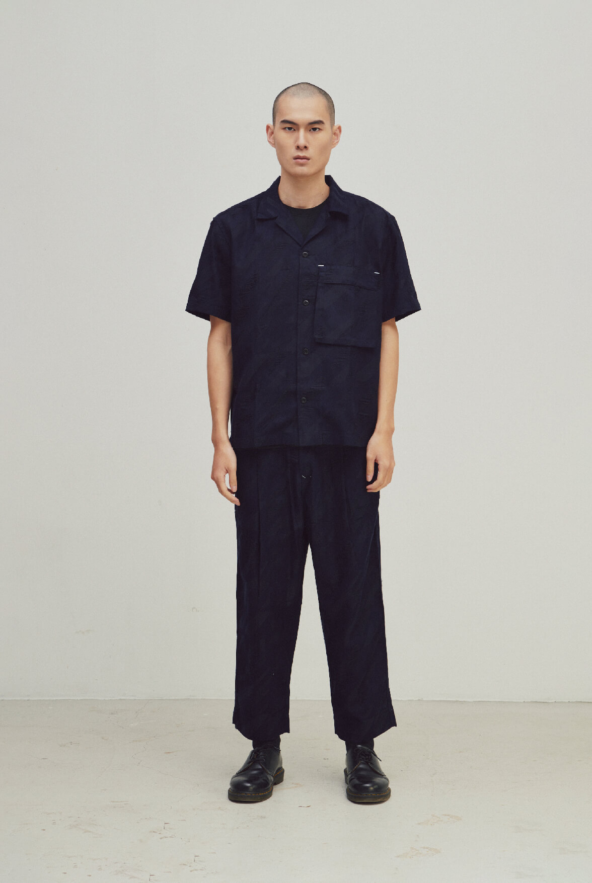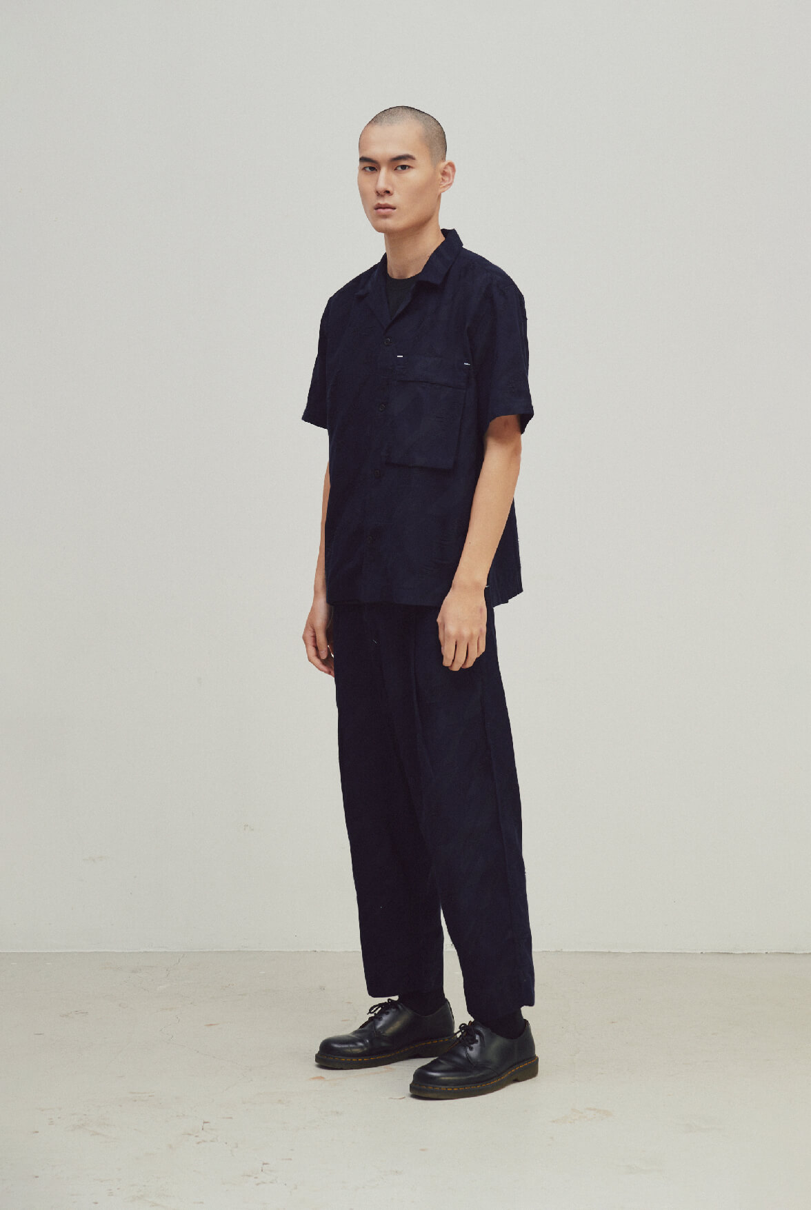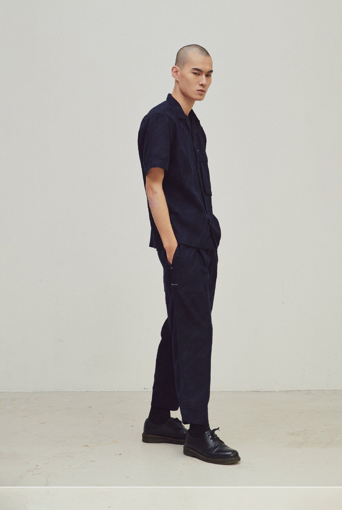 - 整件使用丹寧原料製成,深藍千鳥紋緹花織紋。