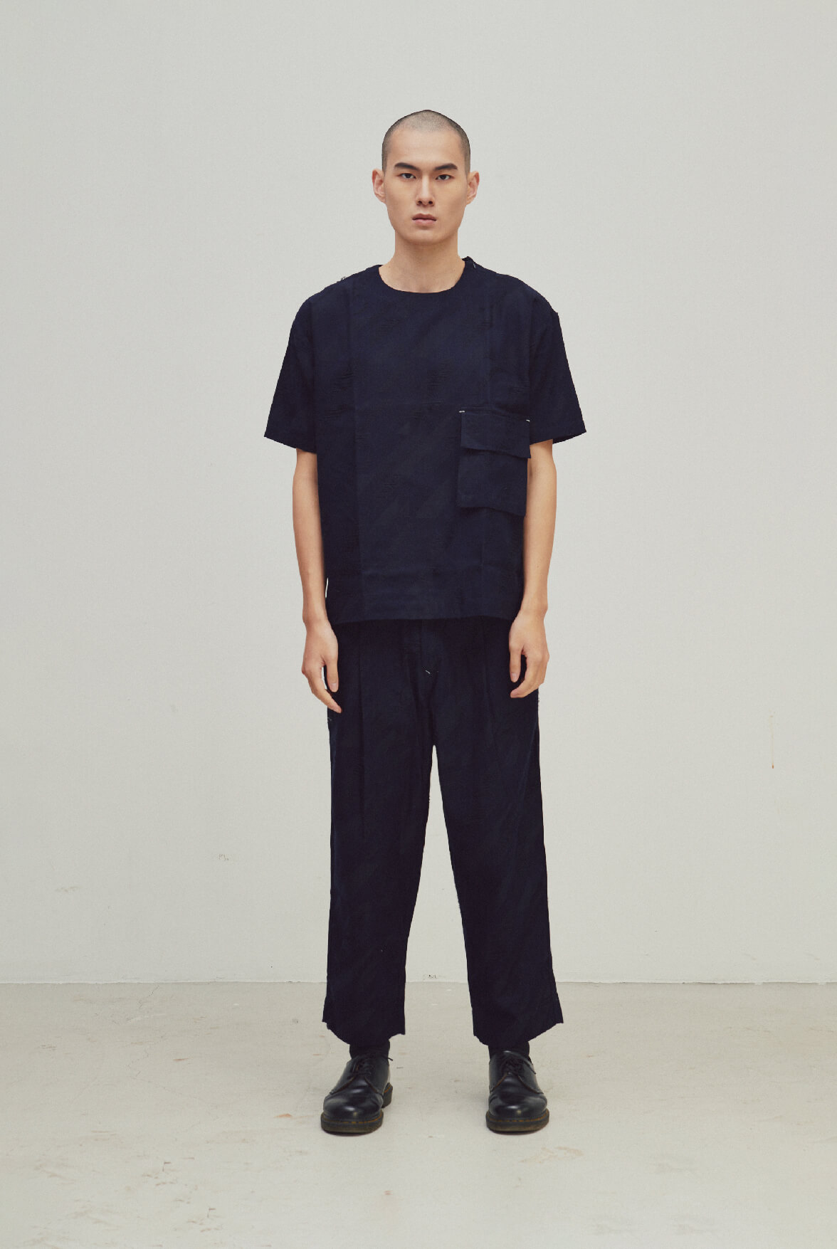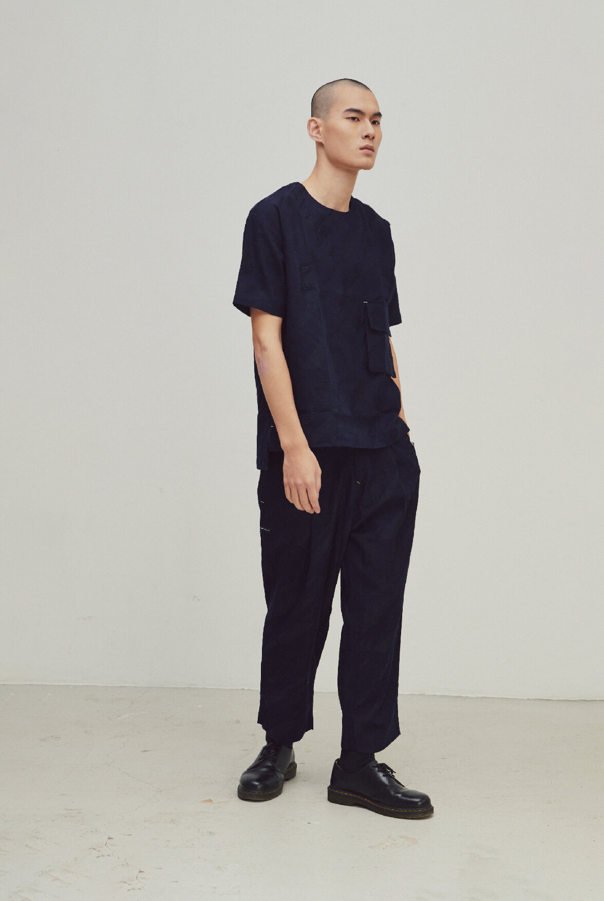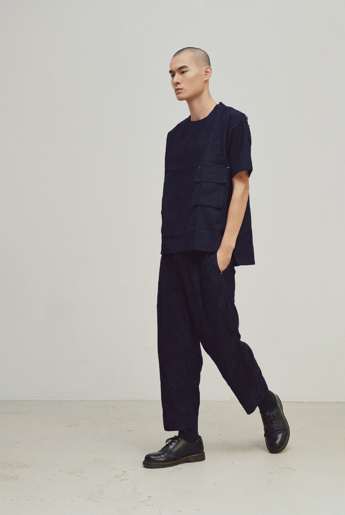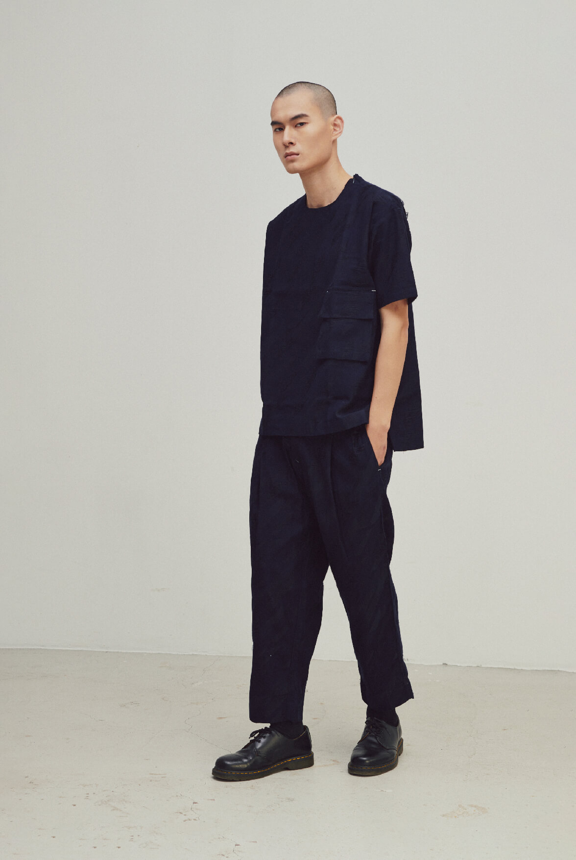 - 整件使用丹寧原料製成,深藍千鳥紋緹花織紋。