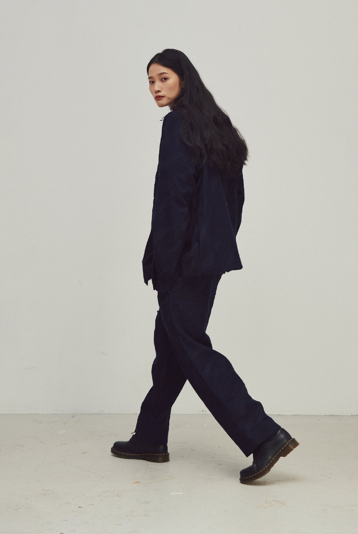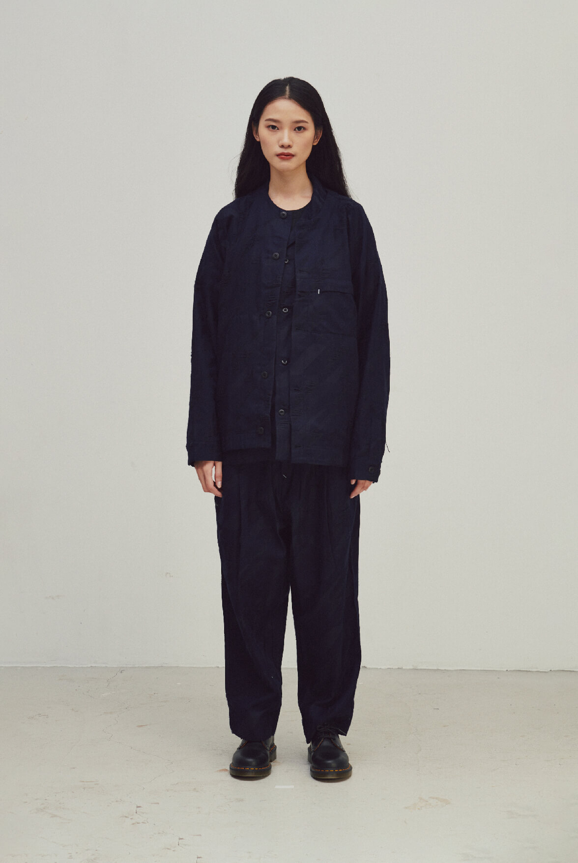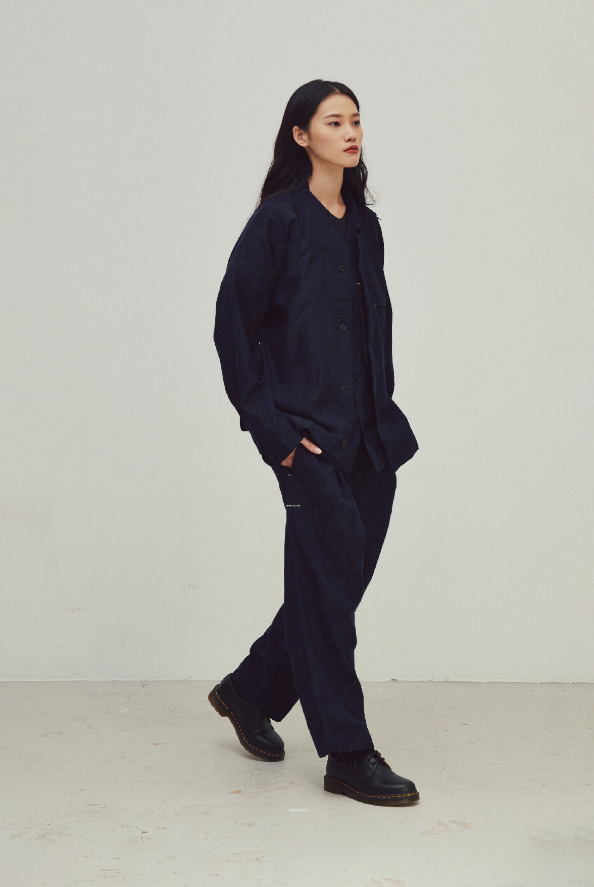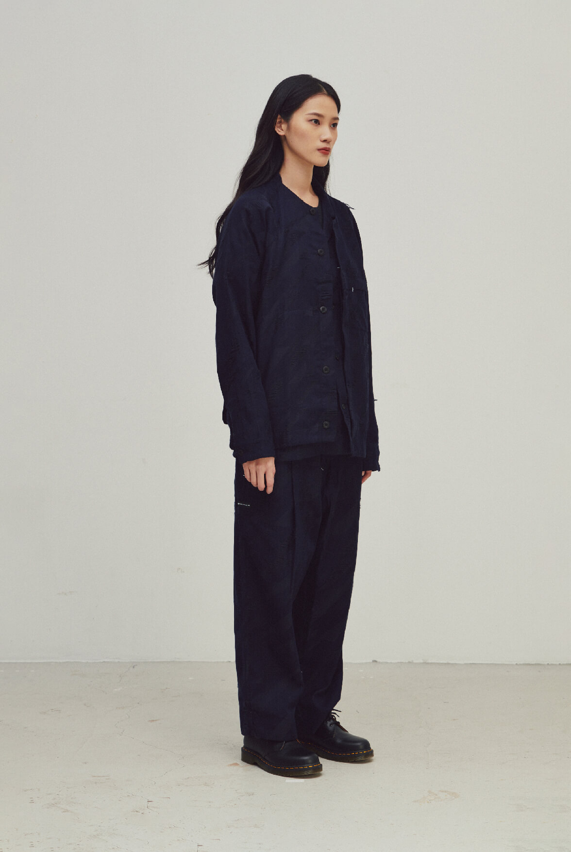 - 整件使用丹寧原料製成,深藍千鳥紋緹花織紋。