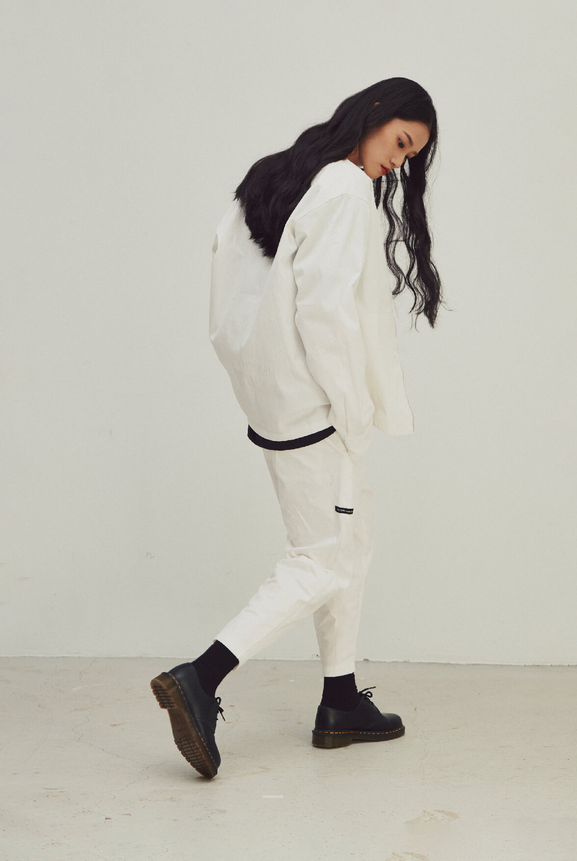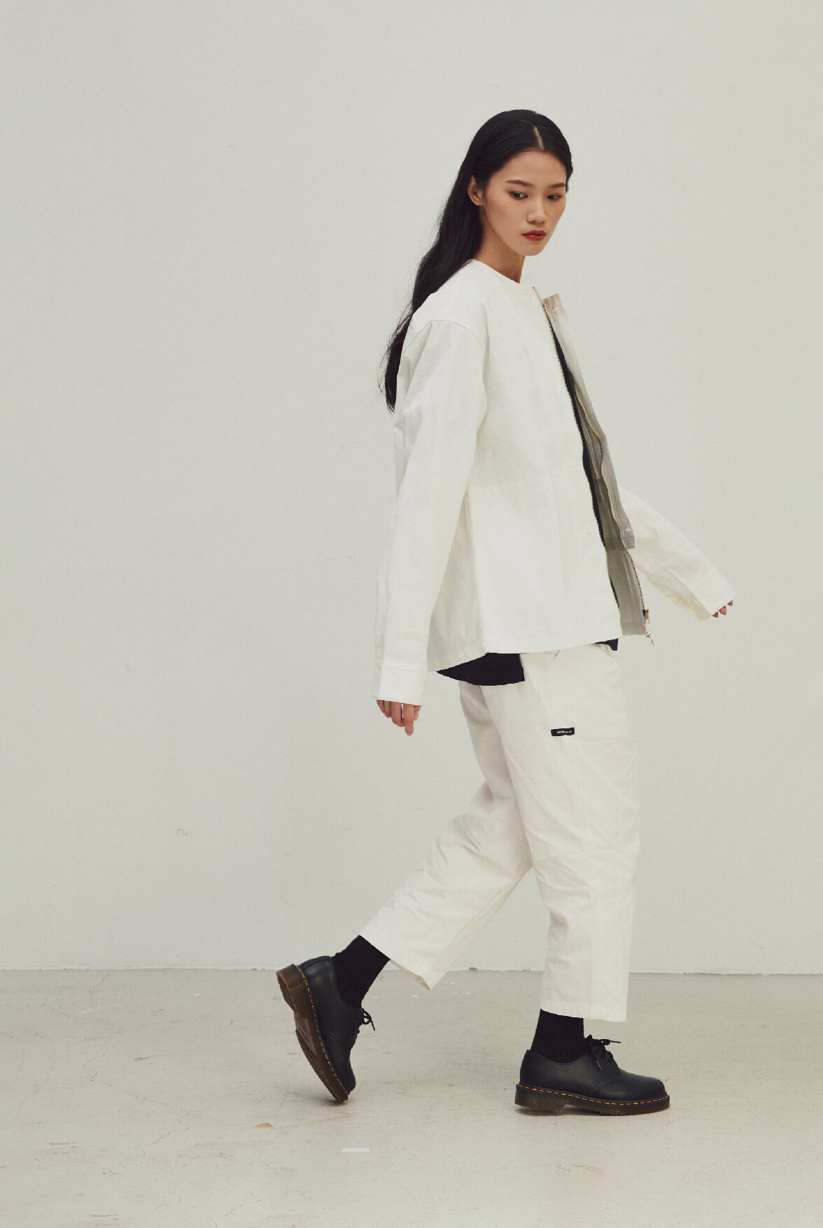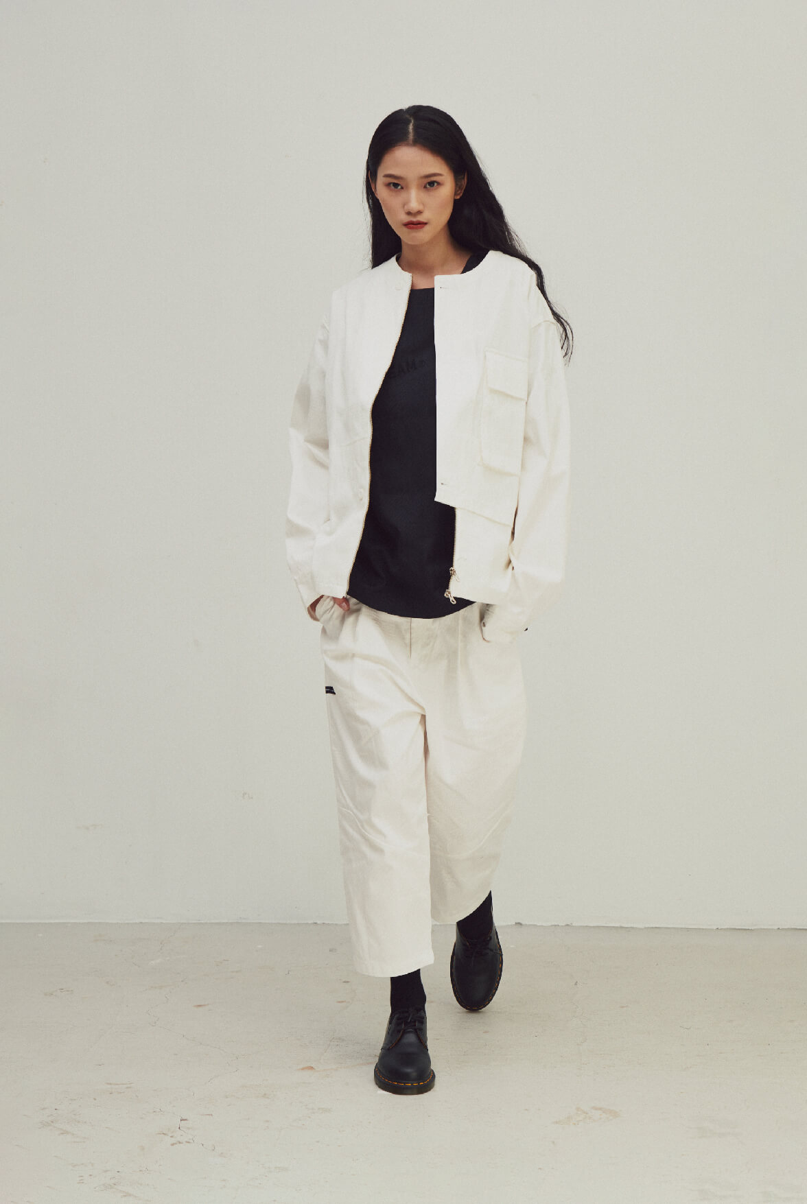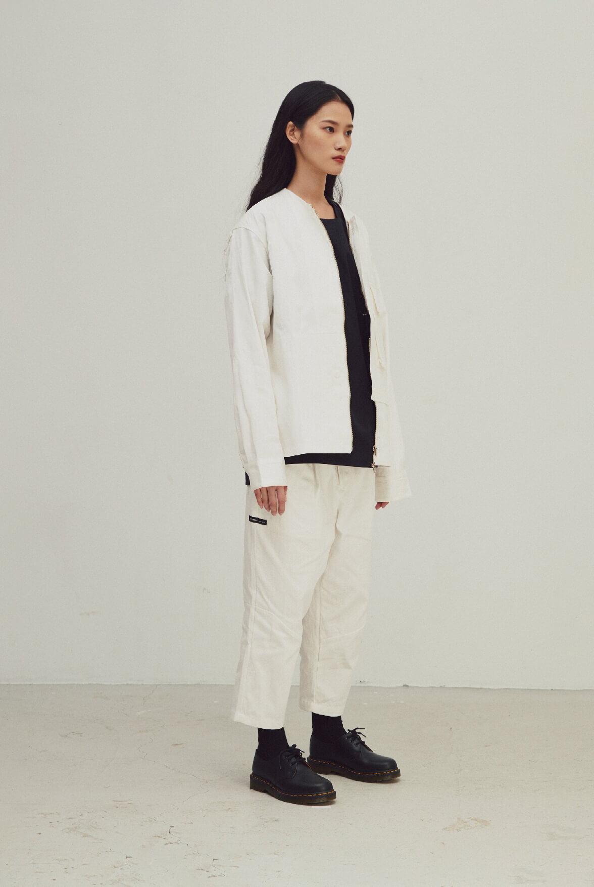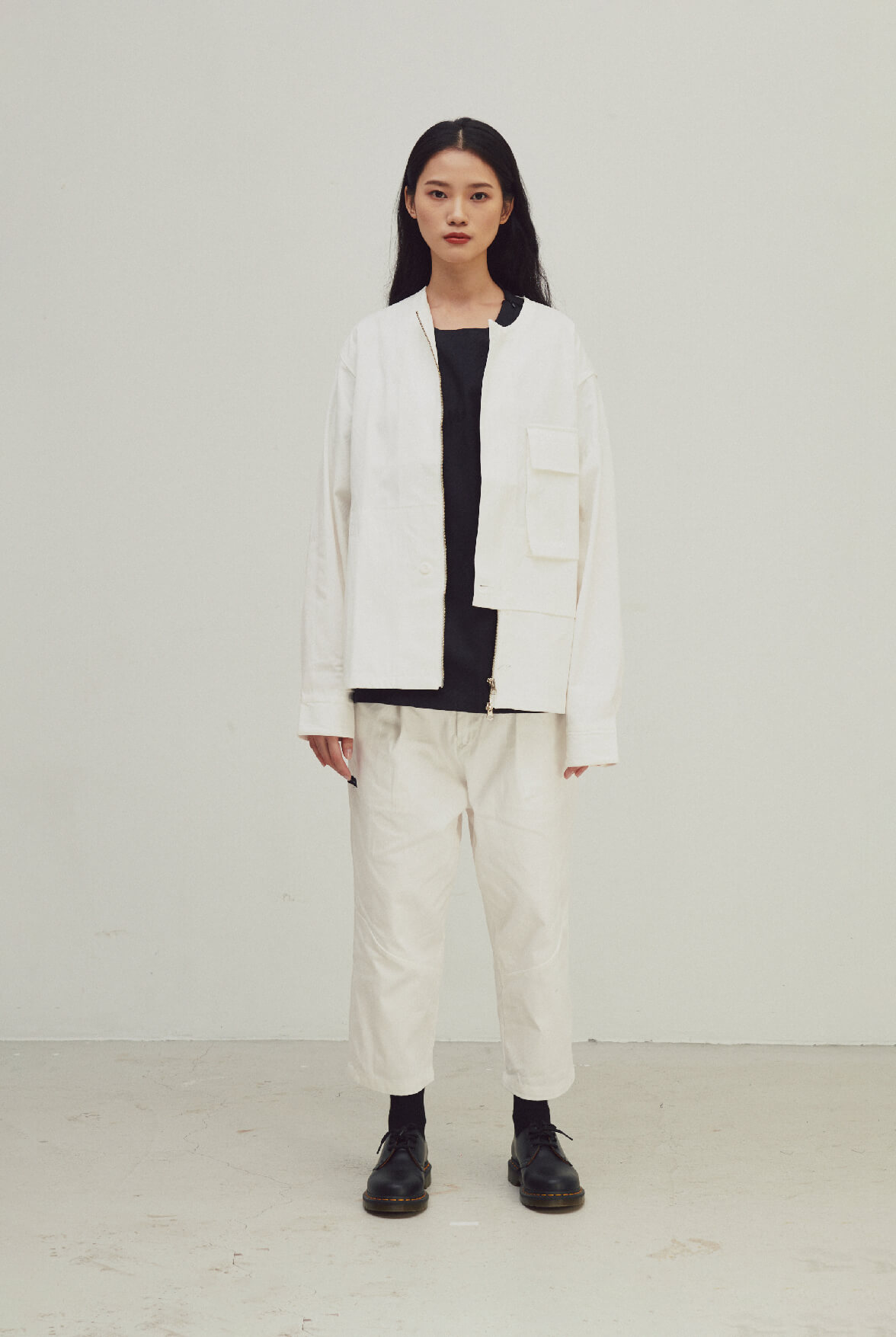 - 鬆身不對稱無領拉鍊外套,左胸貼袋設計。