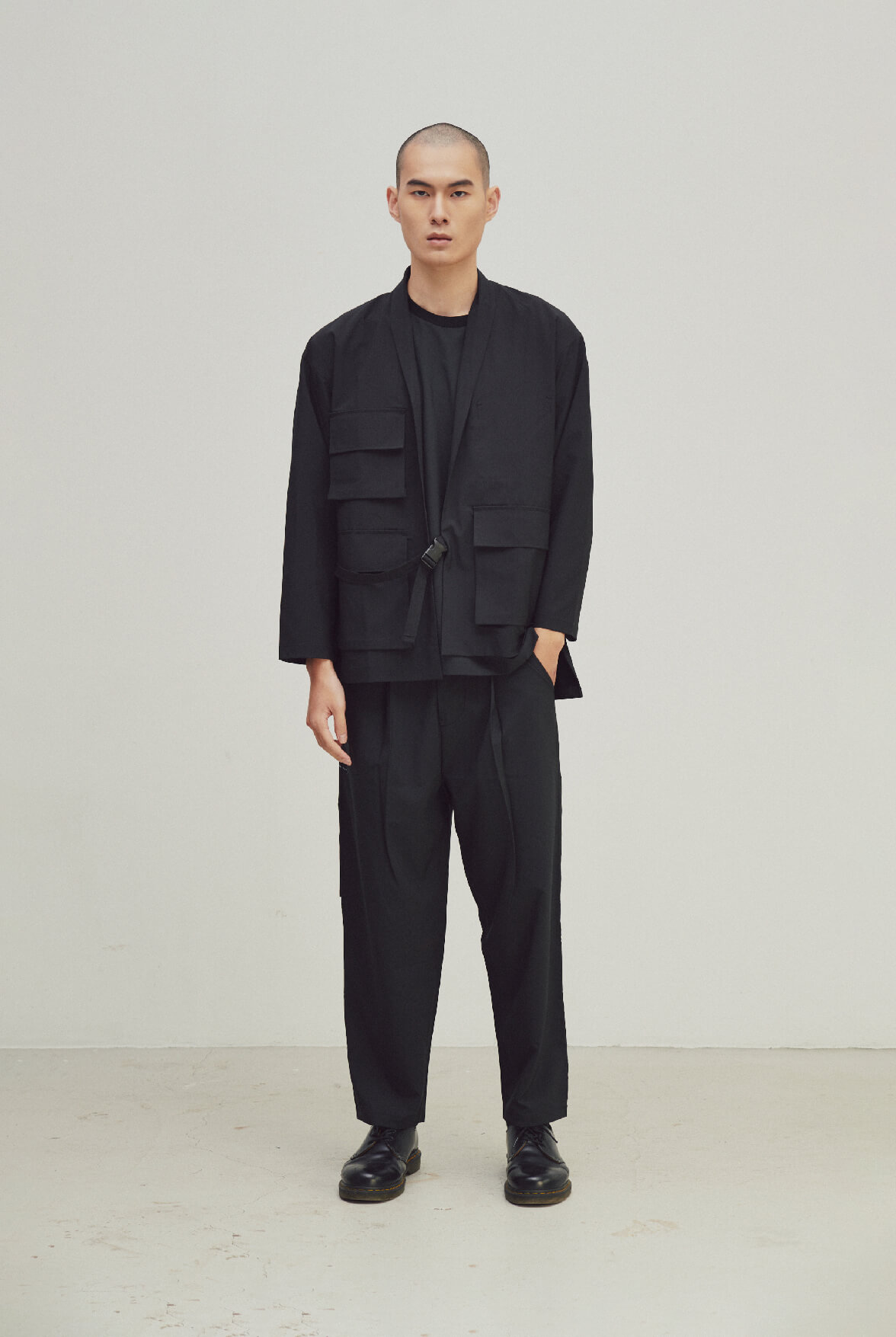 - 寬鬆版和式罩衫,扣具開合調節。