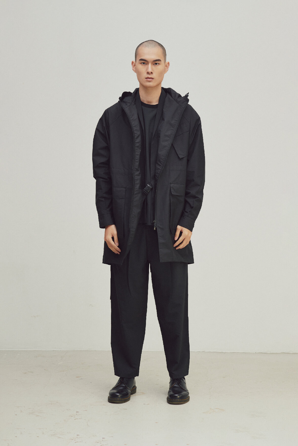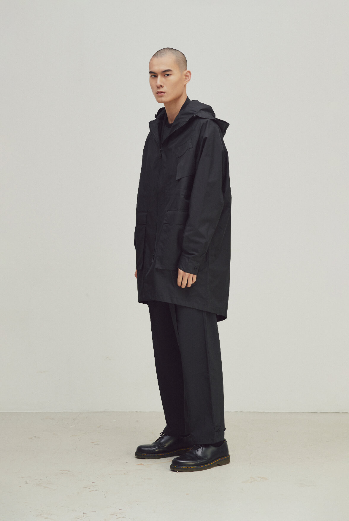 - 寬鬆落肩斗篷外套,正面多貼袋收納便利。