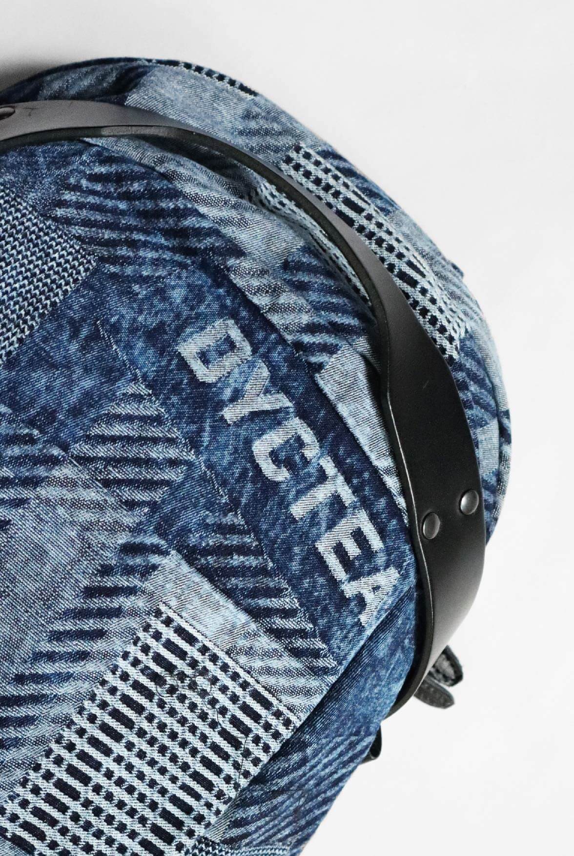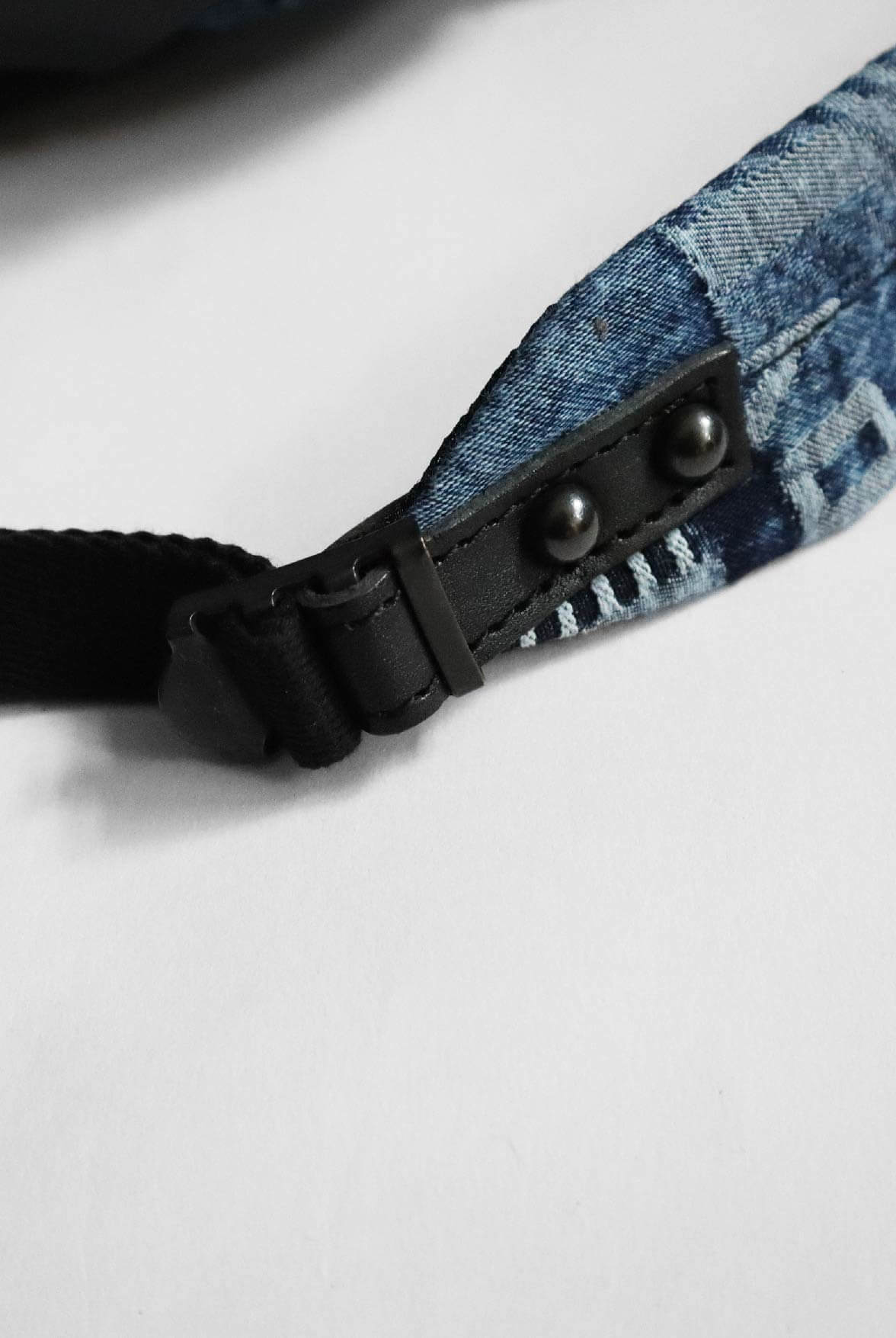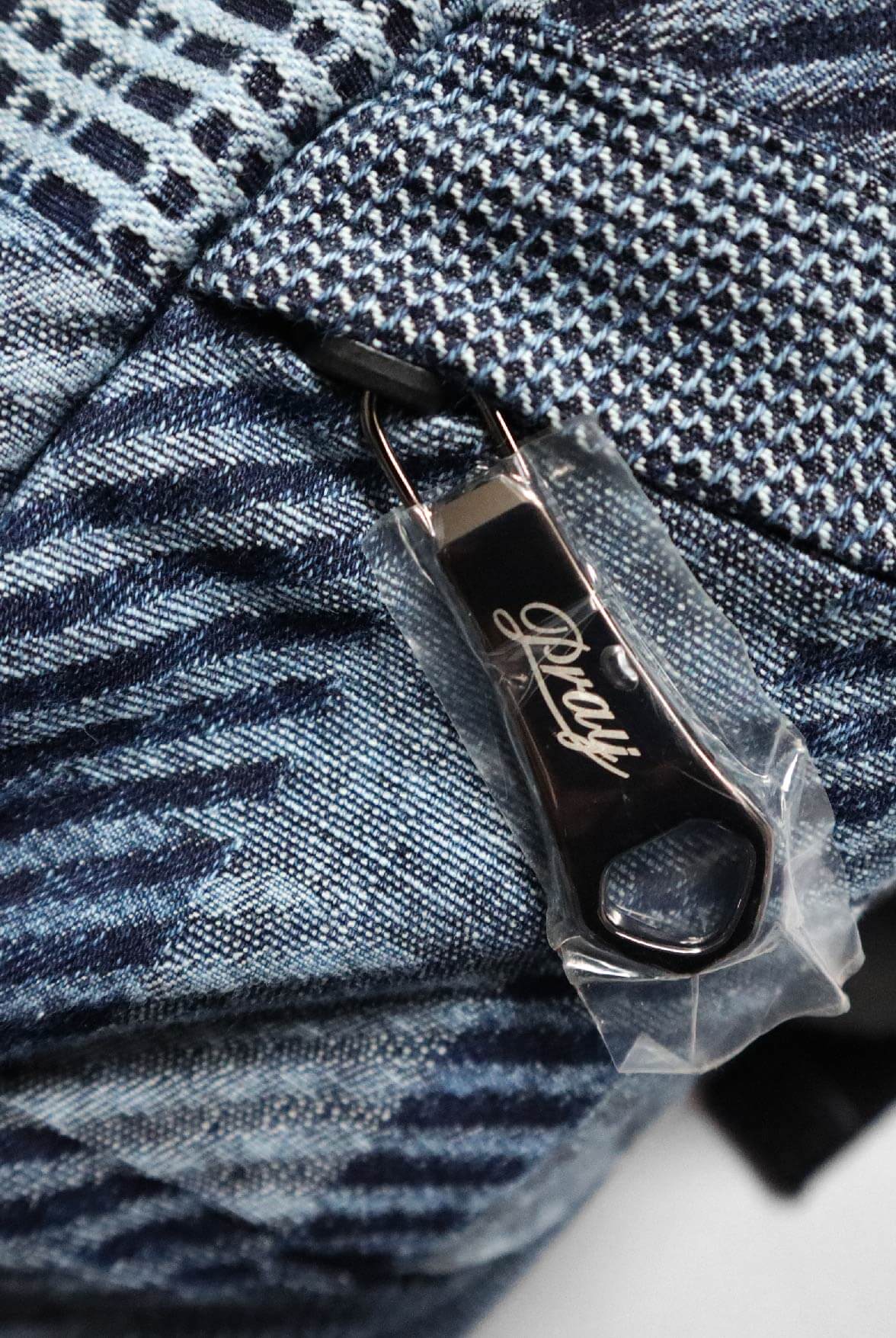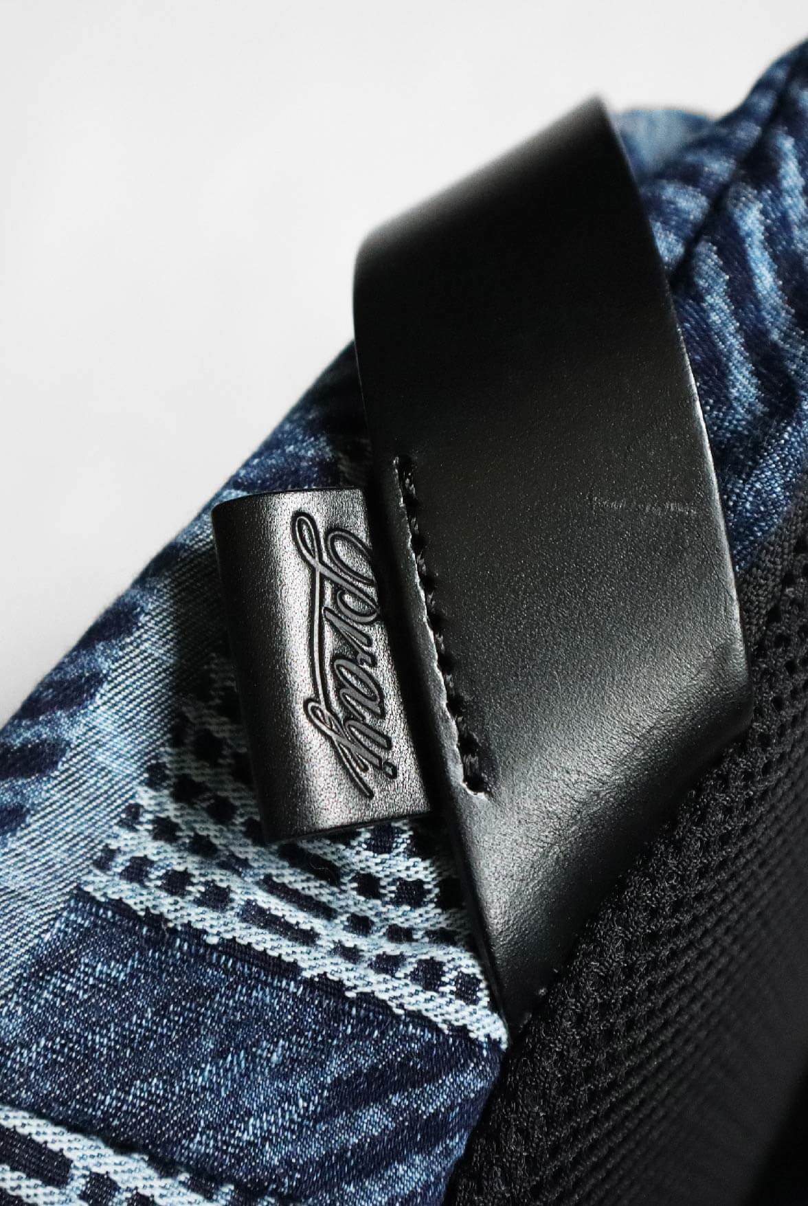 - 淺藍LOGO緹花丹寧面料。