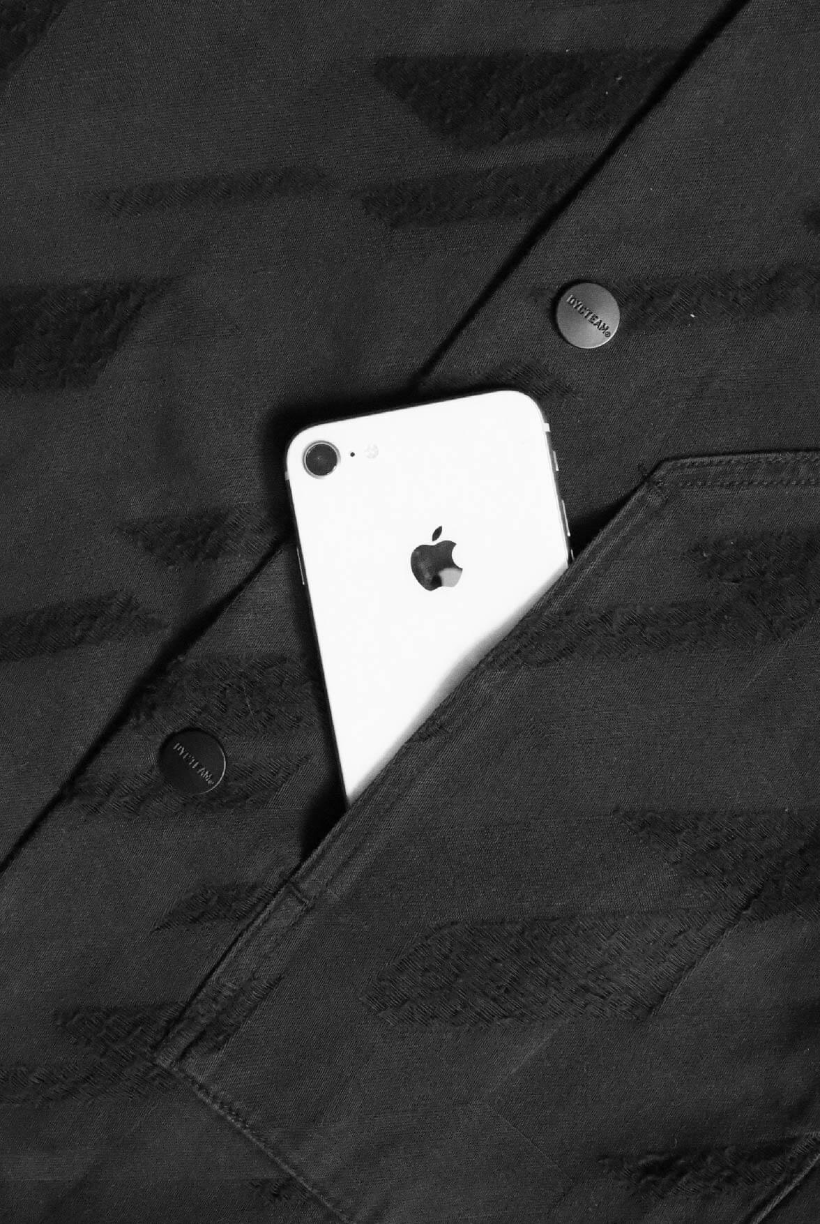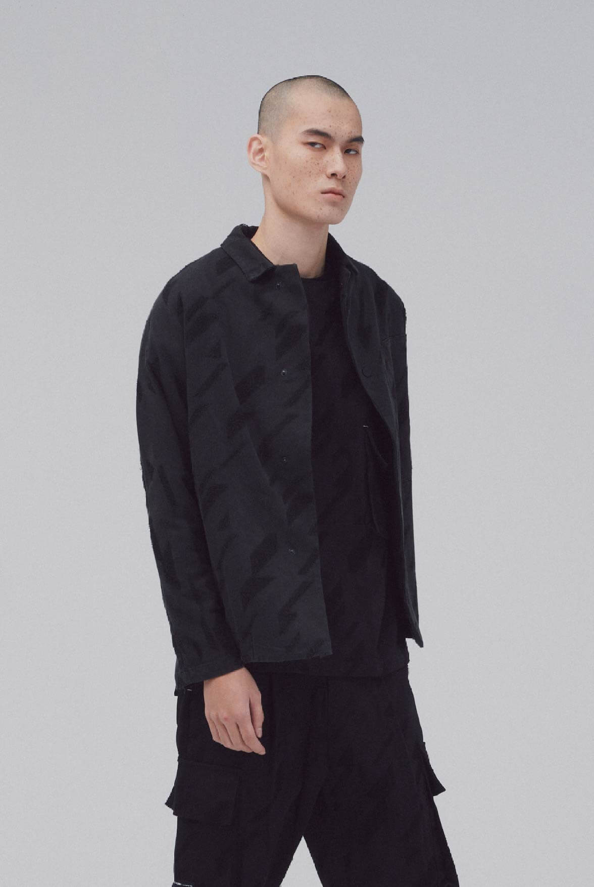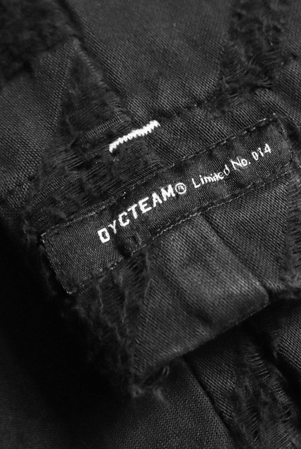 - 黑色千鳥緹花面料、特殊水洗仿舊效果。