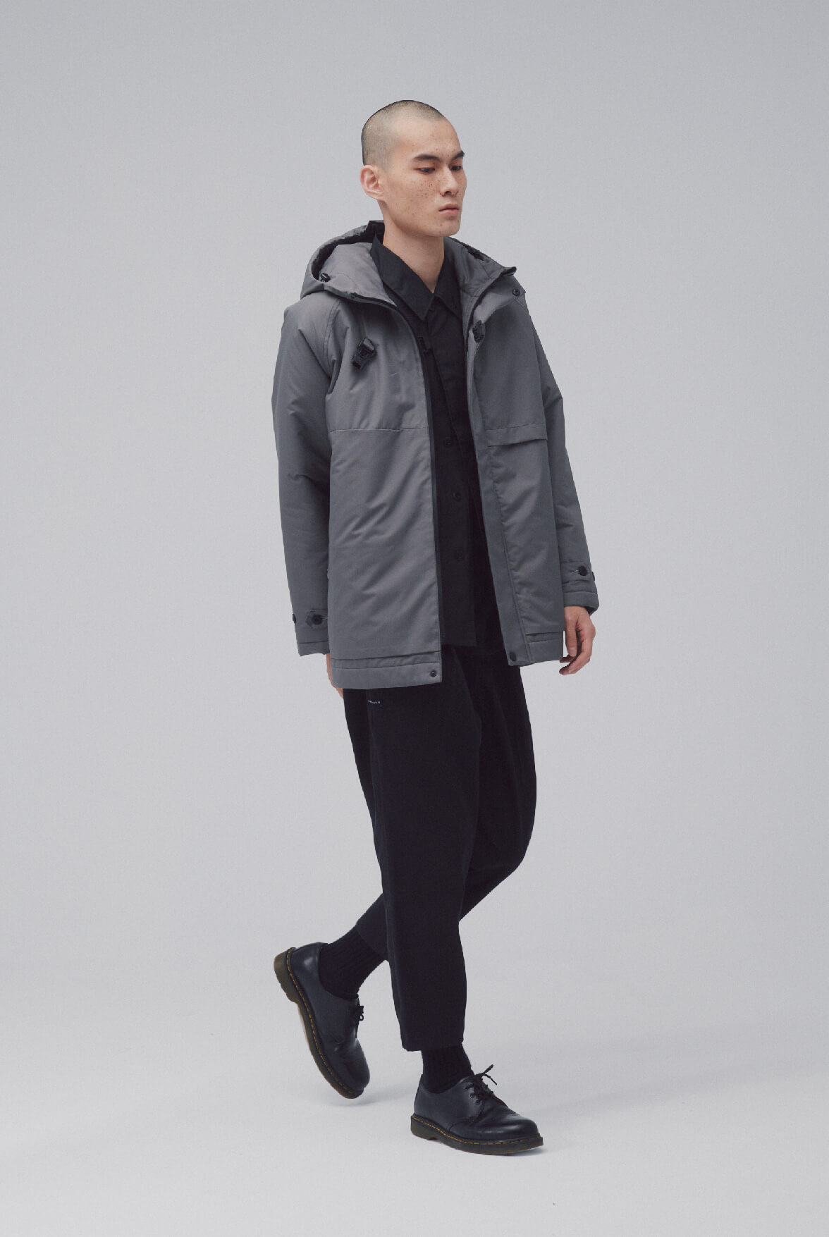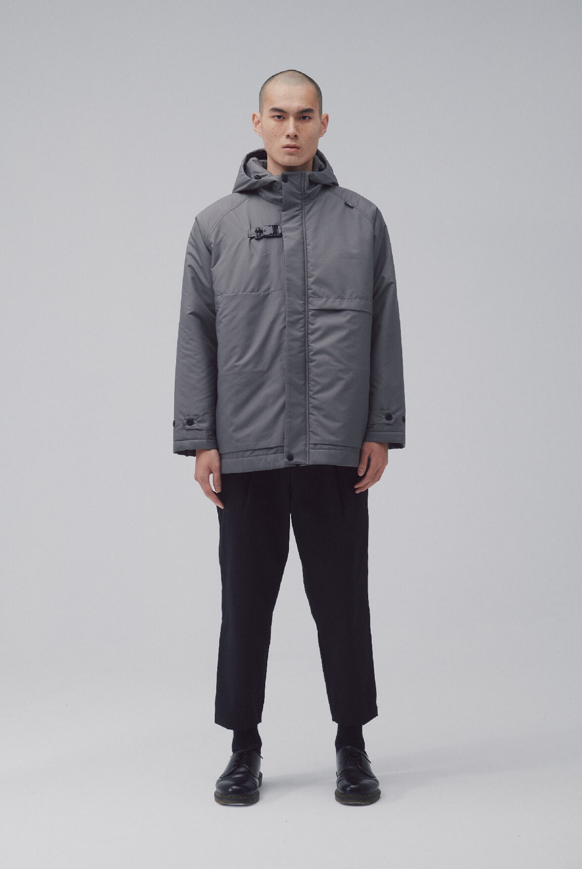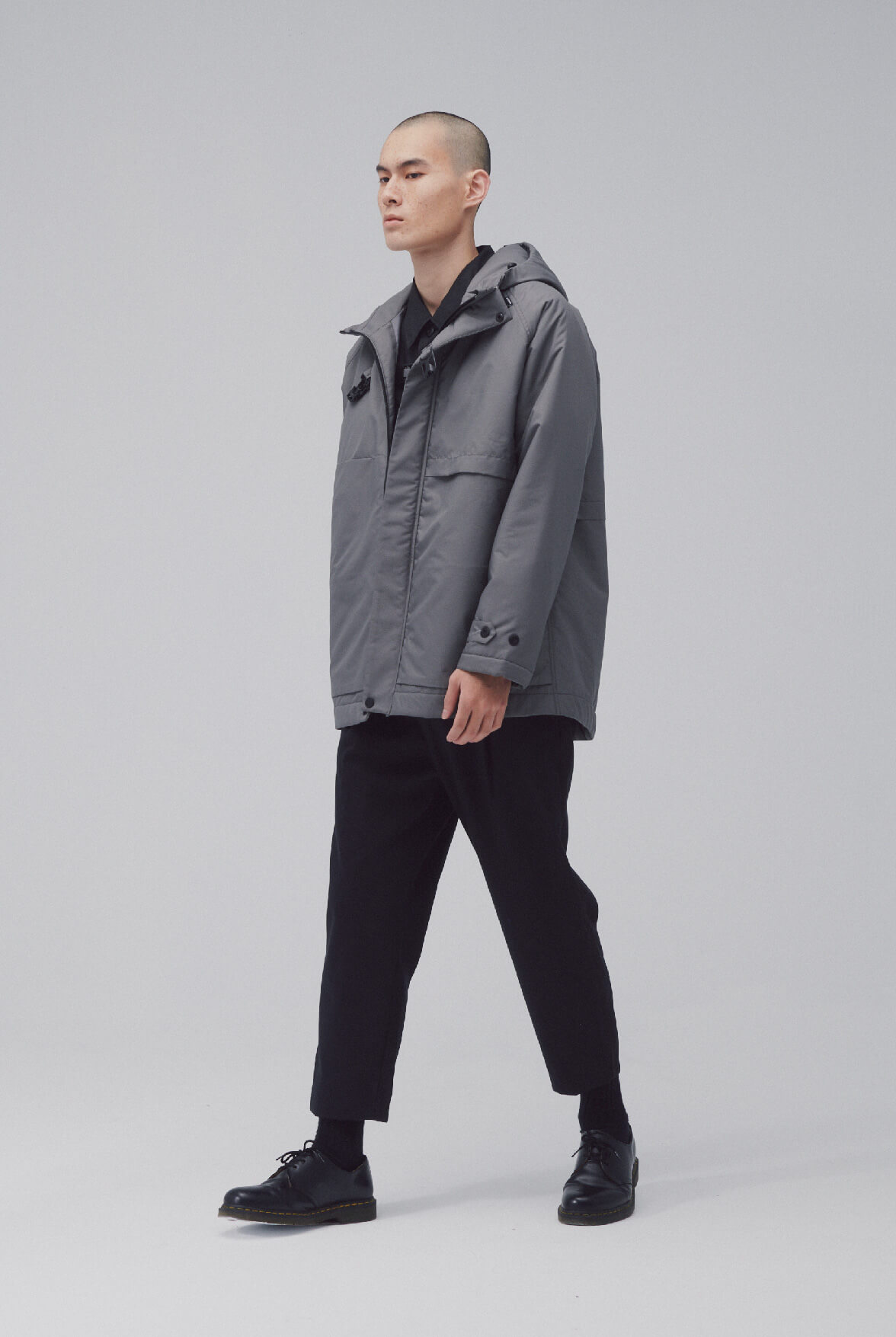 - 防潑水連帽鋪棉外套,夾層內裡使用替代生物羽絨可分解可持續性的PP保暖棉科技素材。