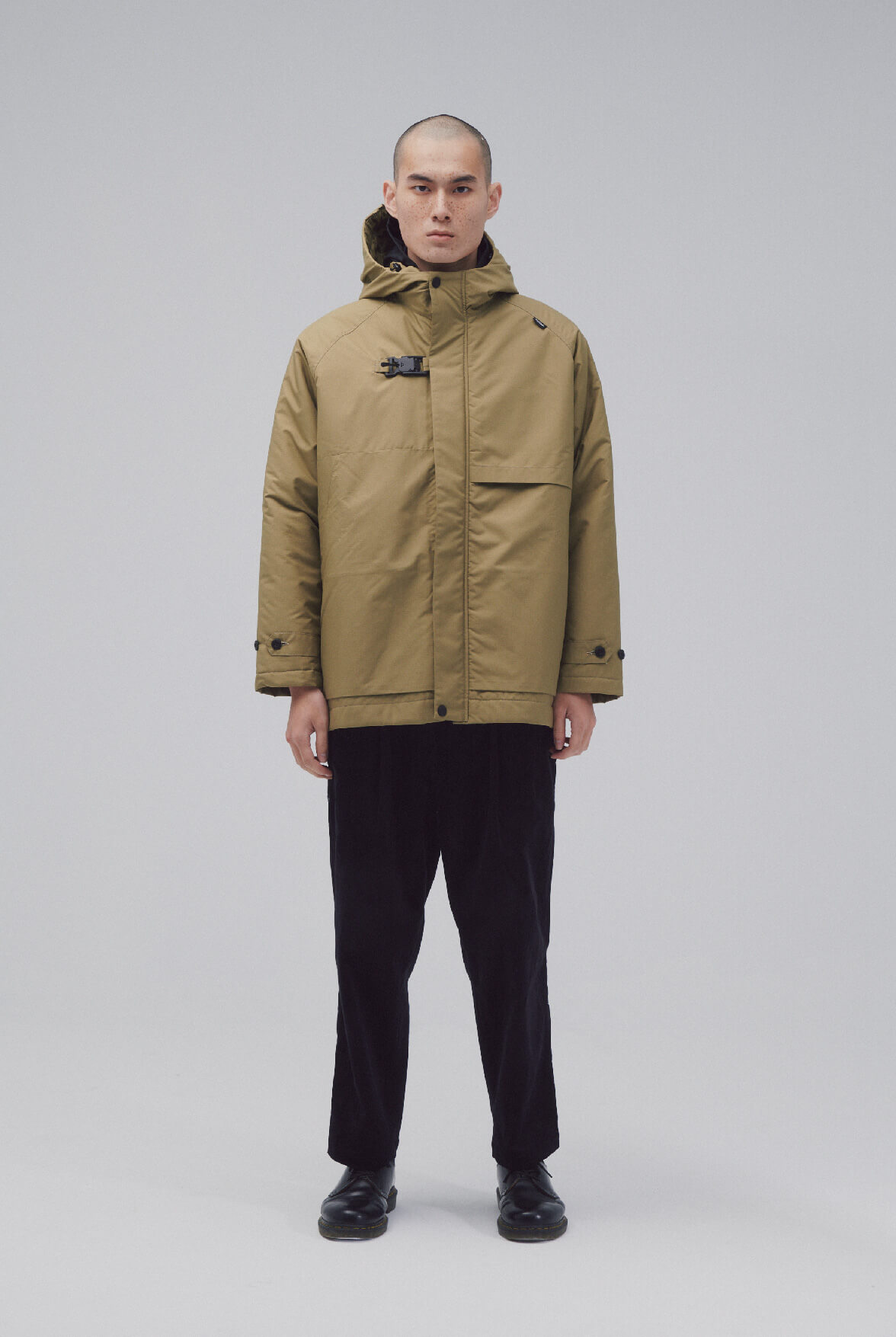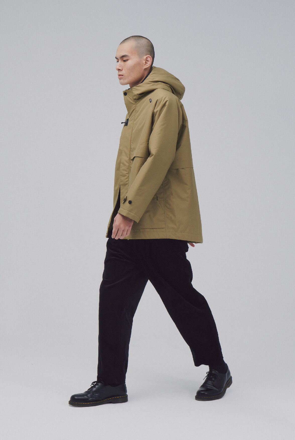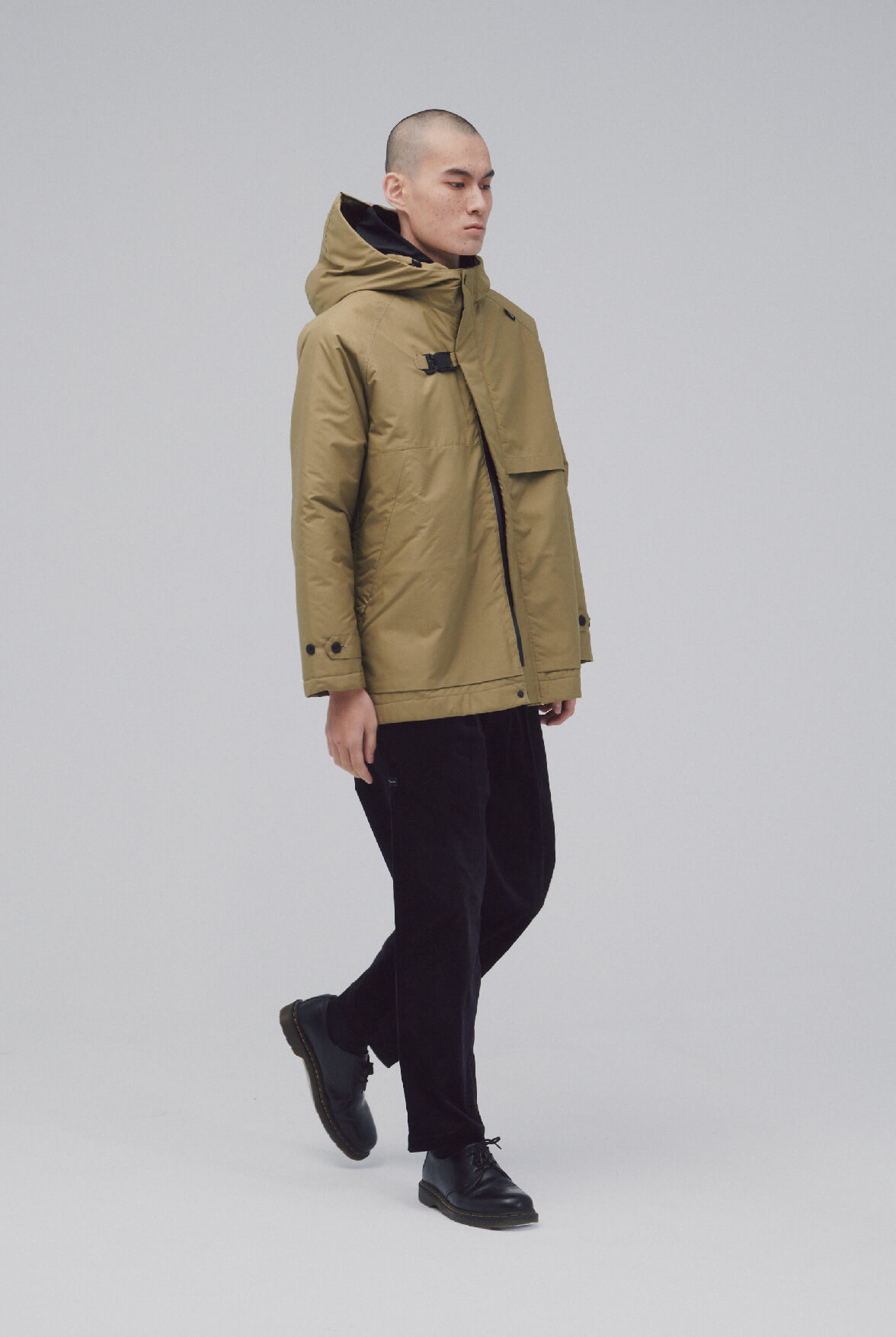 - 防潑水連帽鋪棉外套,夾層內裡使用替代生物羽絨可分解可持續性的PP保暖棉科技素材。