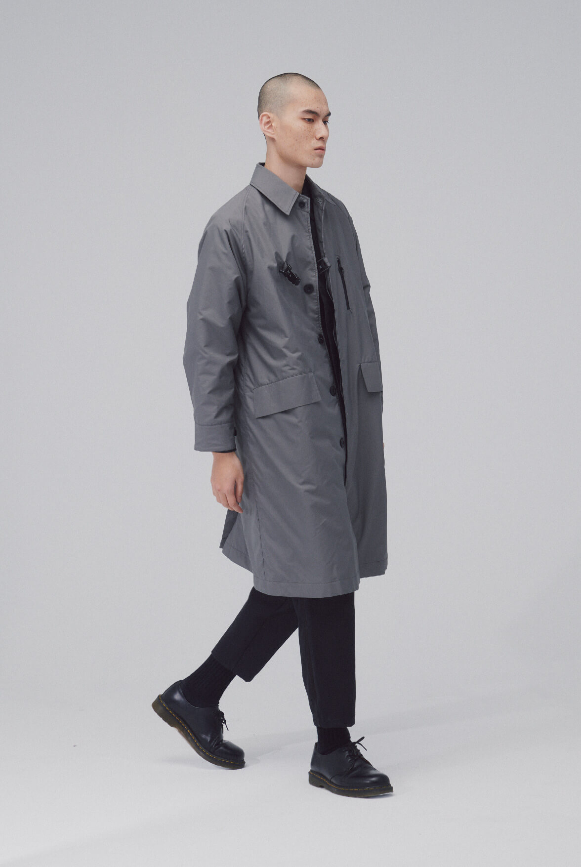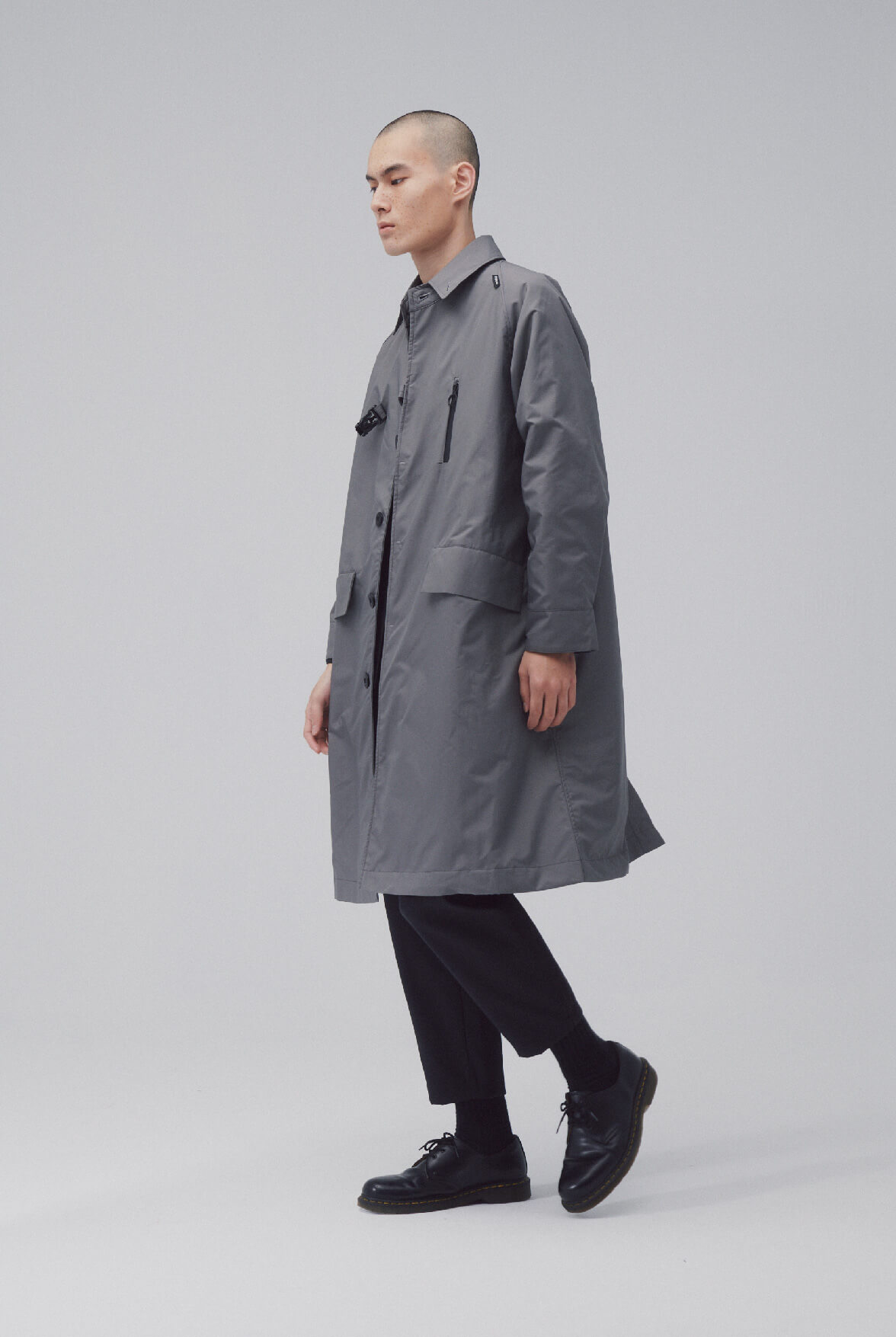- 防潑水長版扣具外套。