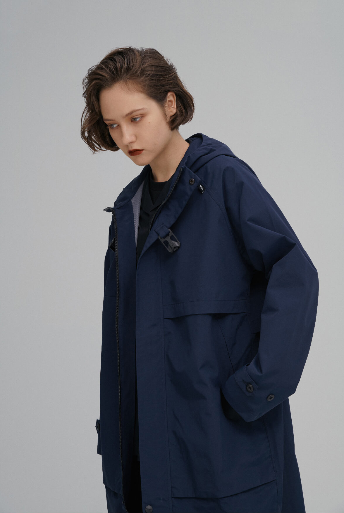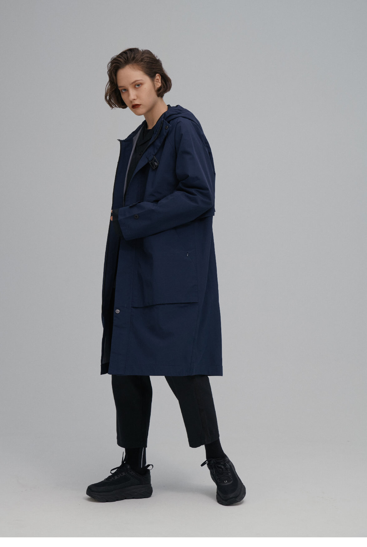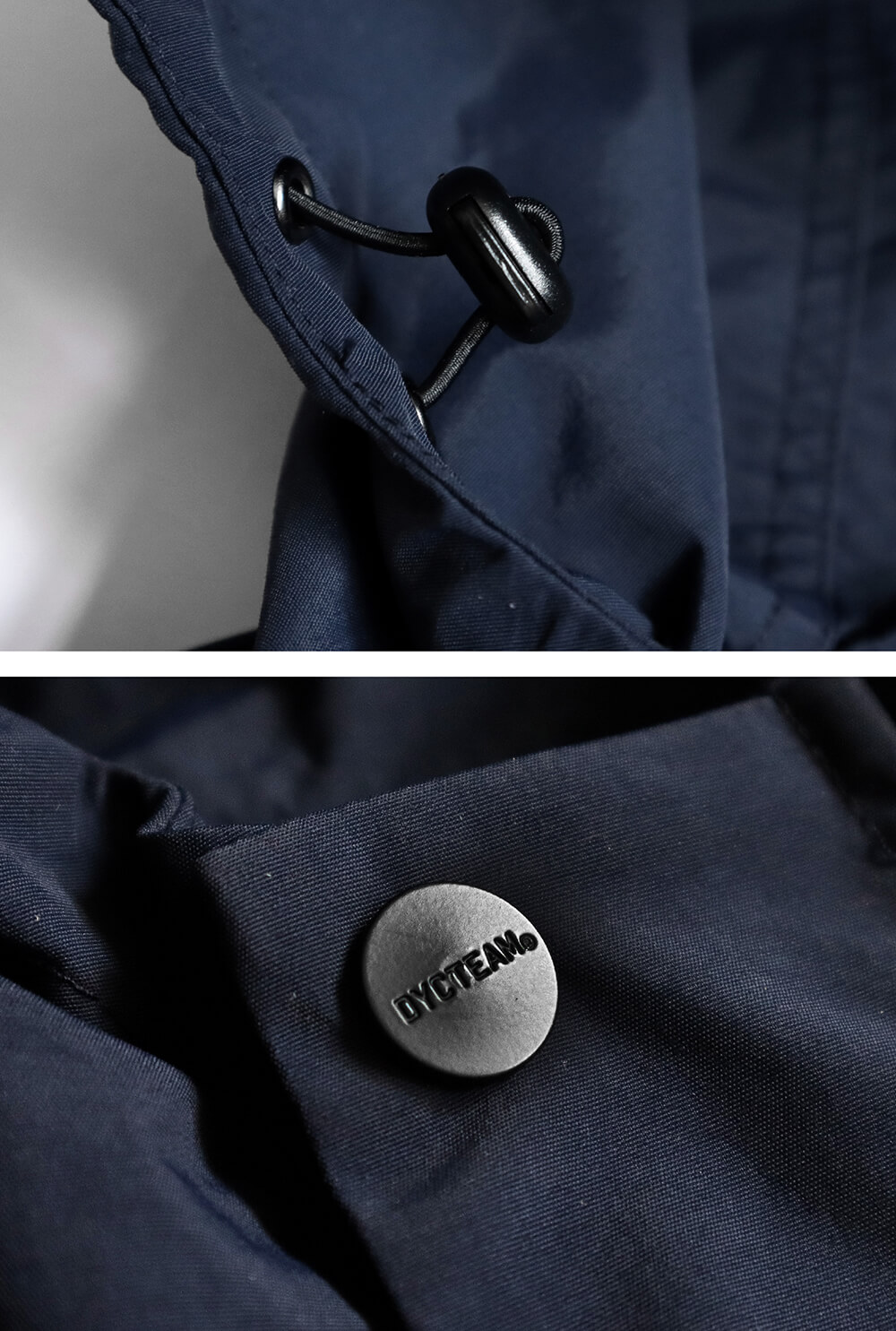 - 連帽兩側束繩拉伸,門襟扣具、拉鍊開合,袖口鈕扣調節。