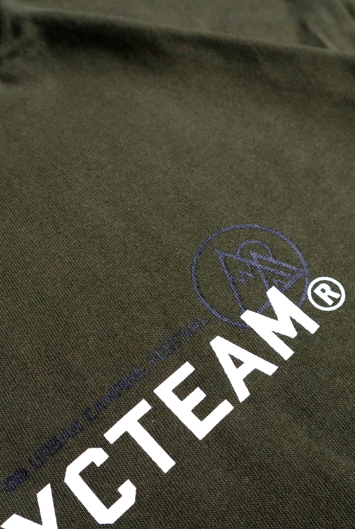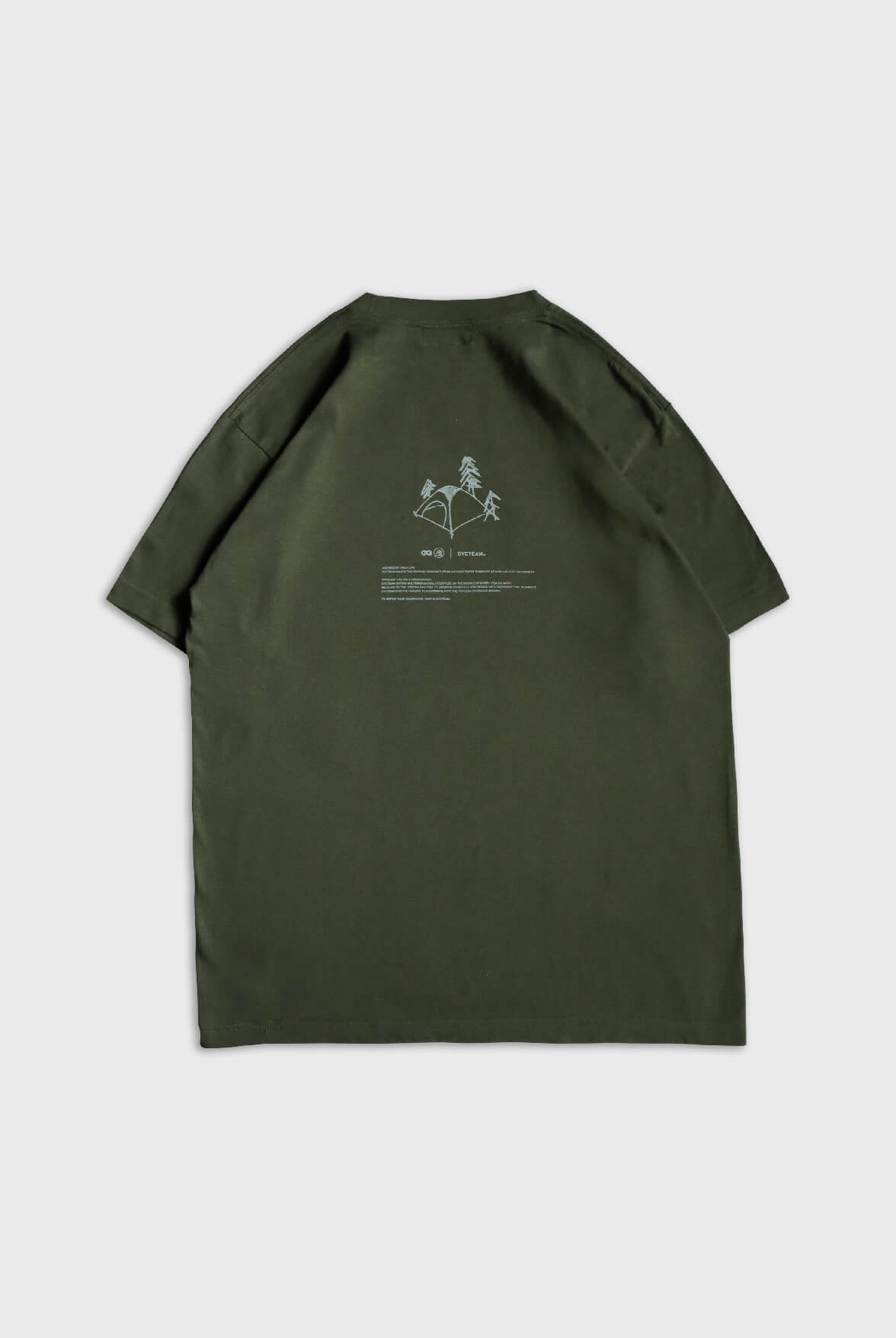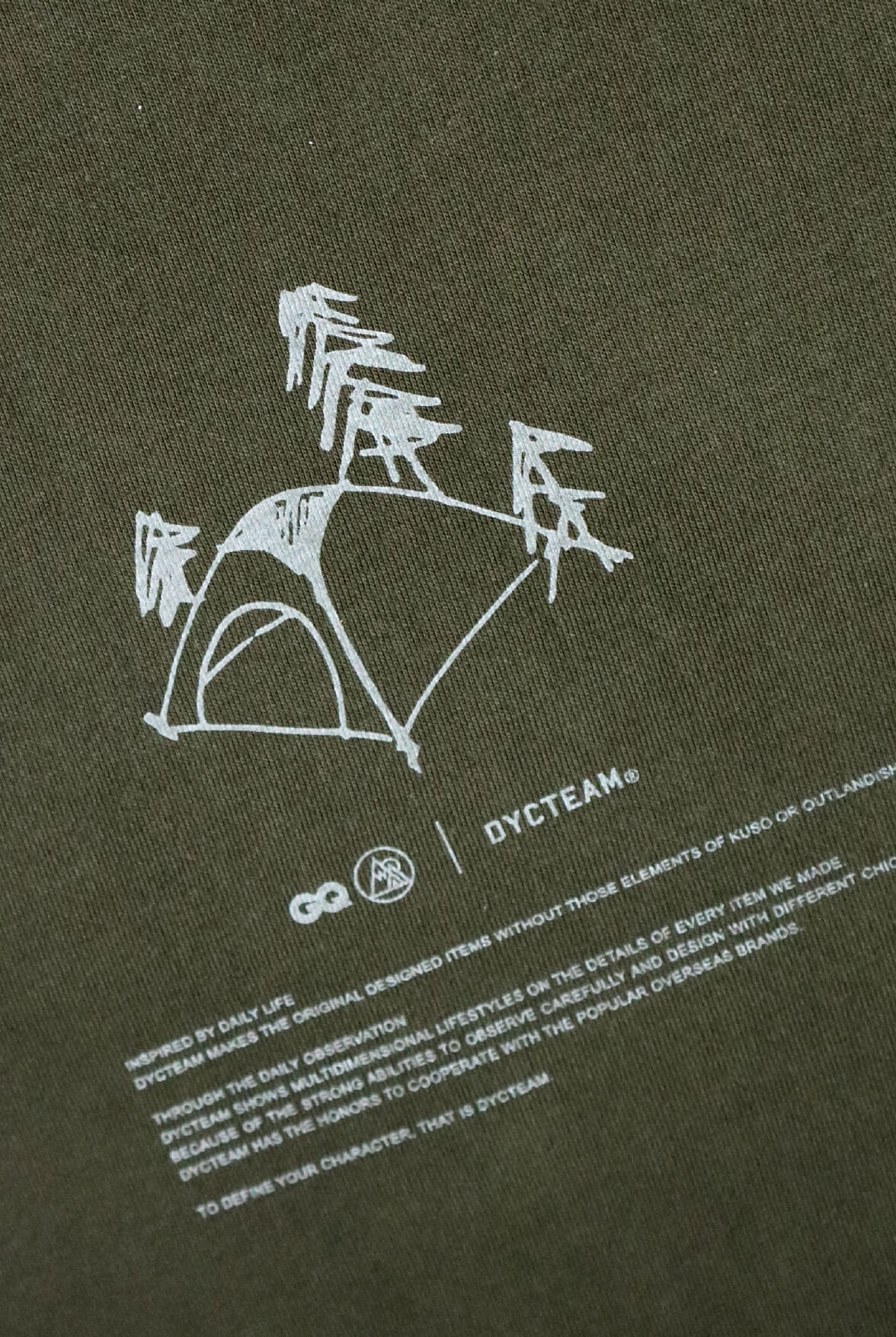 DYCTEAM X GQ城市野營攜手聯名,正面結合雙品牌logo,以印刷呈現層次感設計。背面以手繪感描繪城市露營的圖像主視覺,展現輕鬆簡約的穿搭風格,整體以具強烈戶外感的軍綠色,渲染戶外城市野營氛圍。