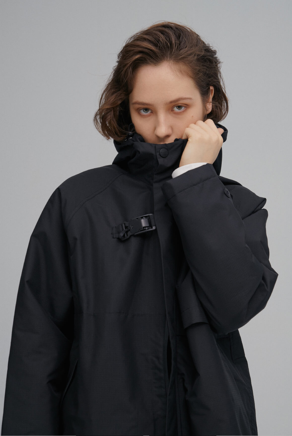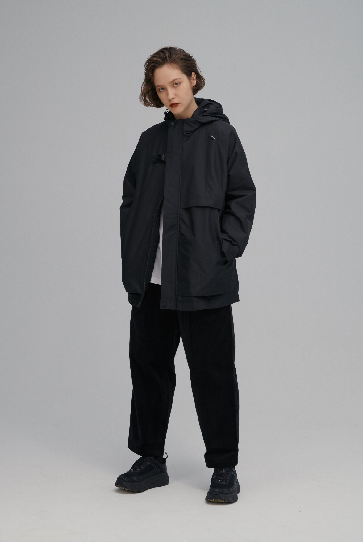 - 防潑水連帽鋪棉外套,夾層內裡使用替代生物羽絨可分解可持續性的PP保暖棉科技素材。