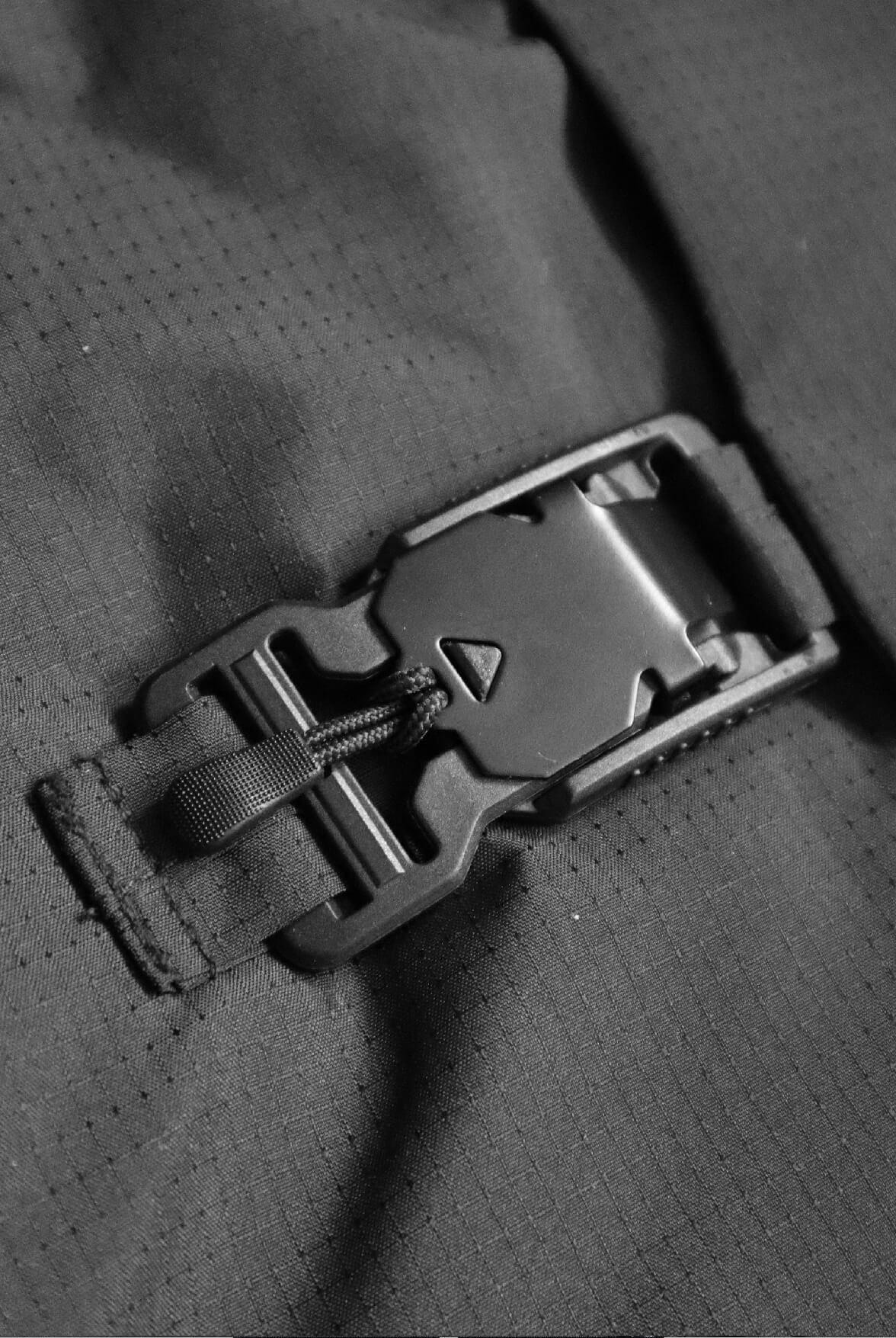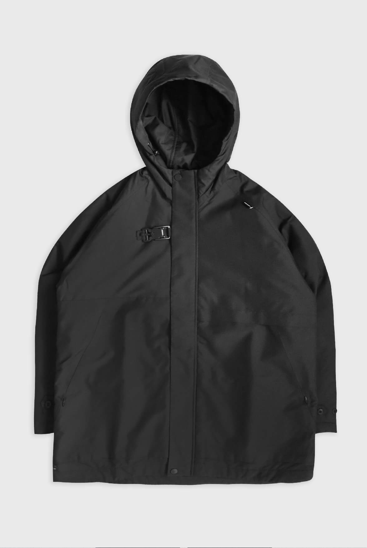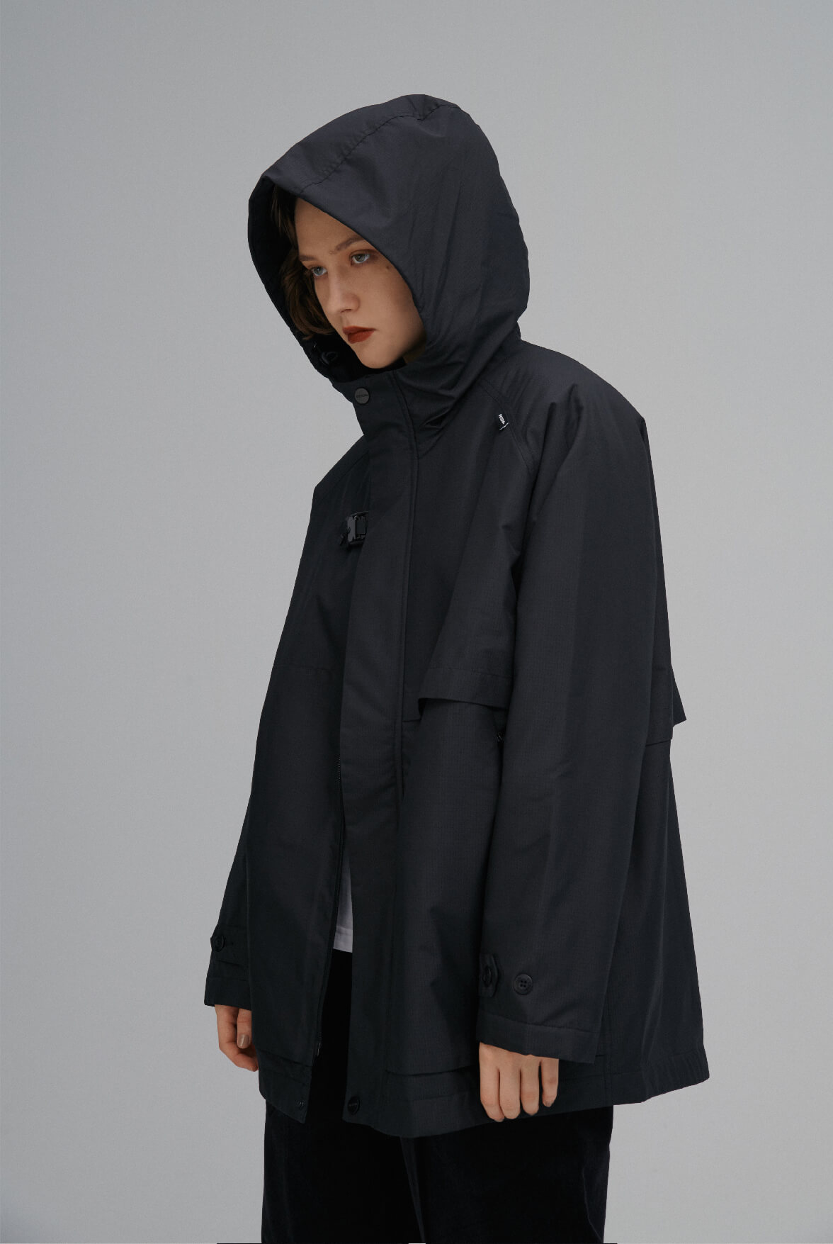 - 連帽兩側束繩拉伸,門襟扣具、拉鍊開合,袖口鈕扣調節。