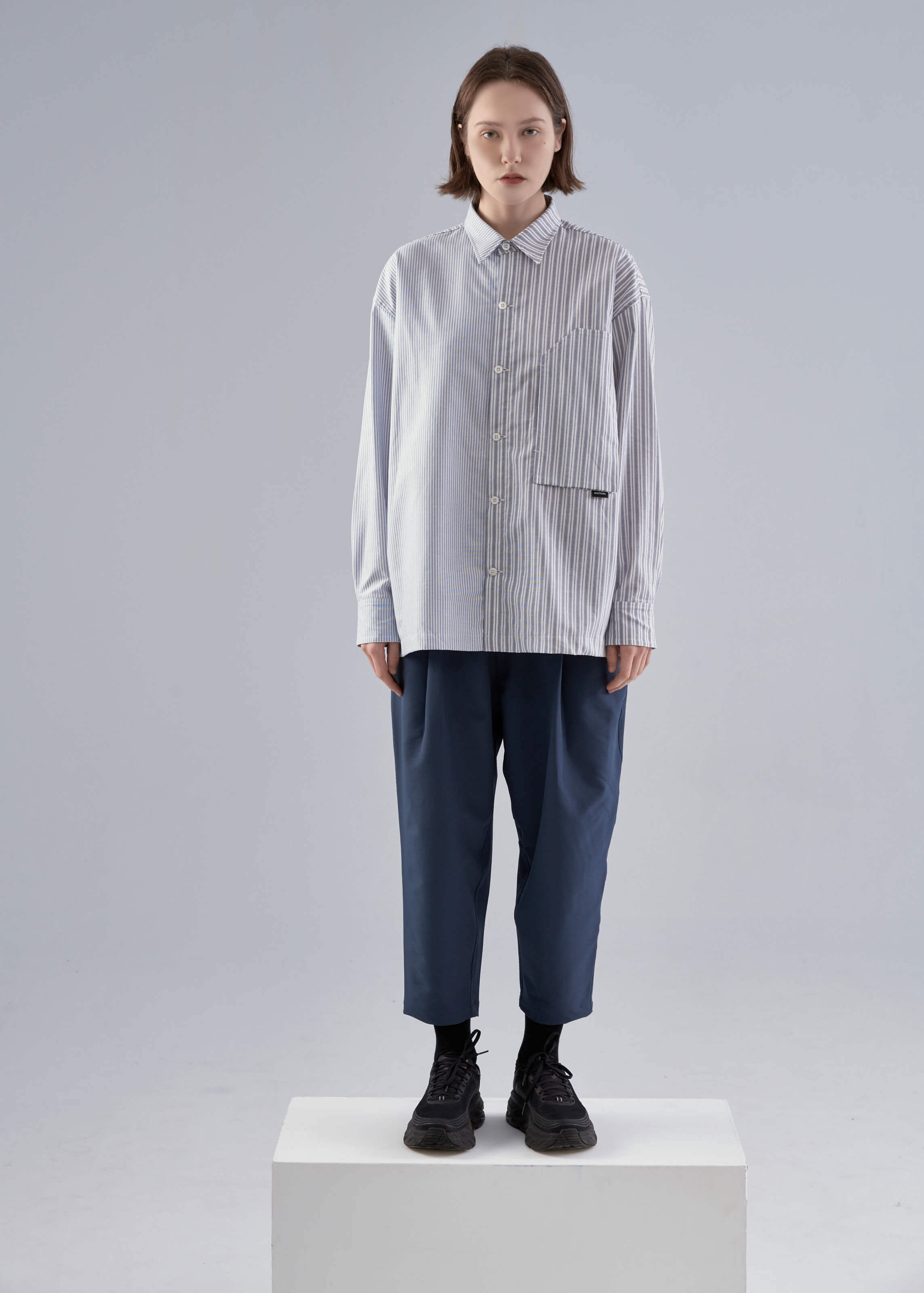 - 左胸斜角å´é–‹å£å¤§å£è¢‹è¨è¨ˆã€ä¸‹æ–¹é»‘色LOGOå°æ¨™ã€‚