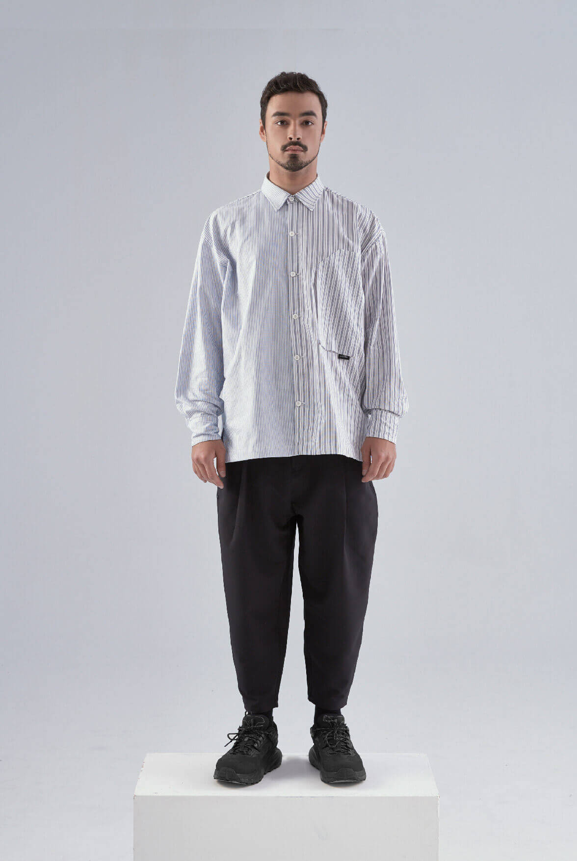 - 左胸斜角å´é–‹å£å¤§å£è¢‹è¨è¨ˆã€ä¸‹æ–¹é»‘色LOGOå°æ¨™ã€‚