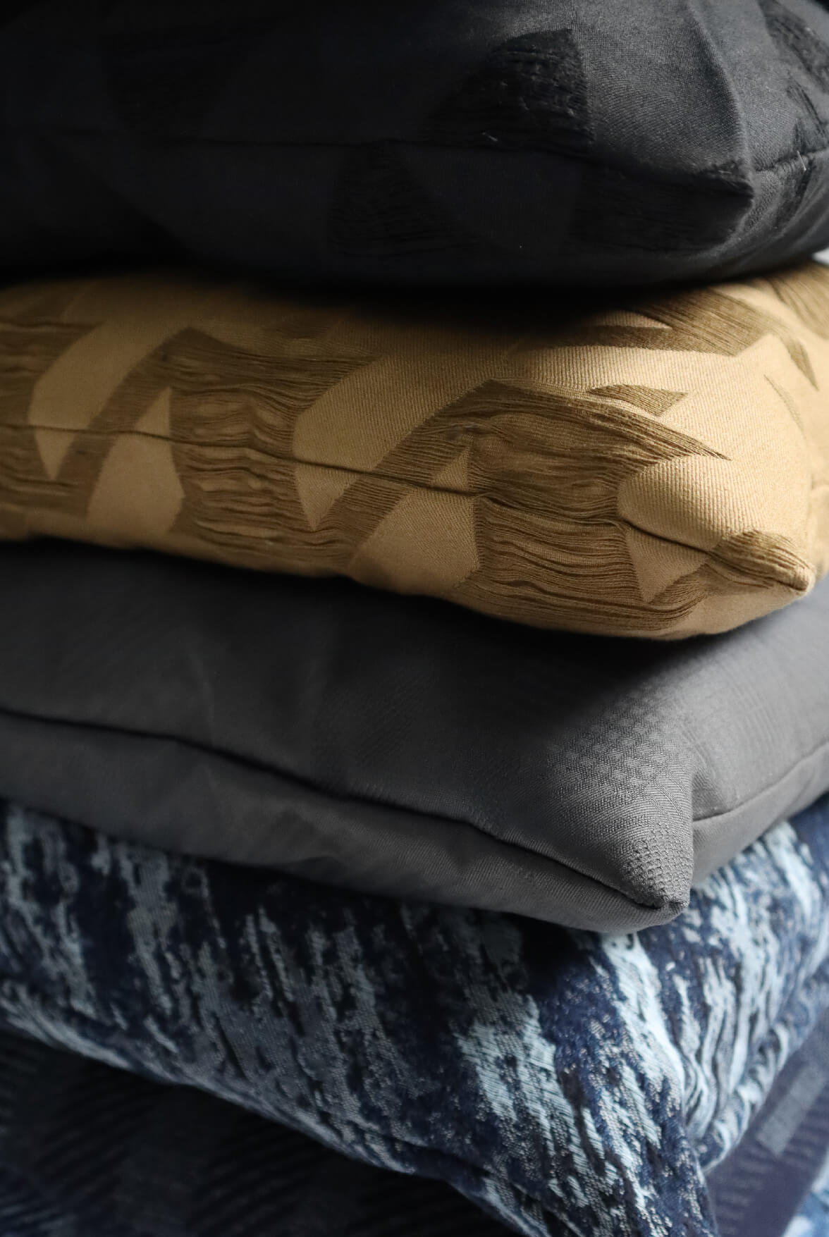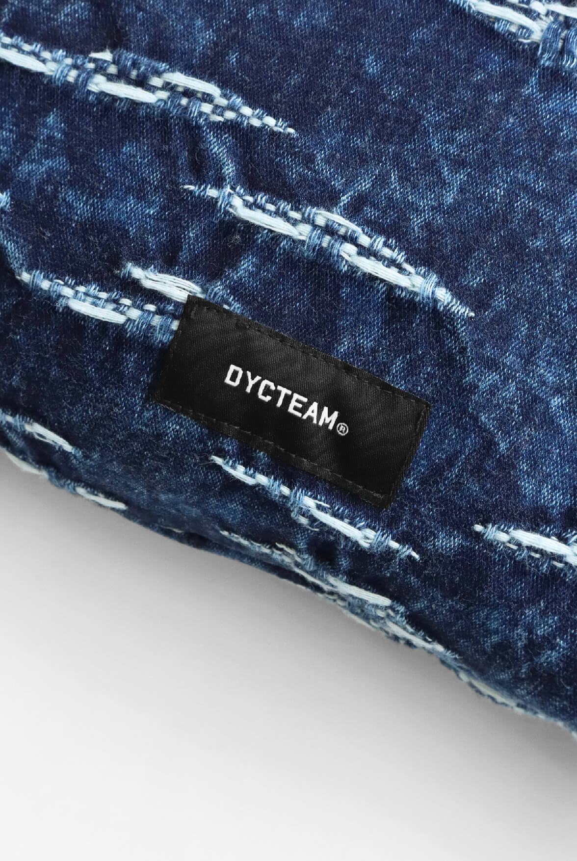 在每一件服裝的製作過程中,大部分都會產生非常大量裁剩的面料,這些布塊若沒有其他的用途最後都會成為垃圾,丟至回收場甚至被焚燒掉;為減少不必要的浪費,DYCTEAM將這些裁剩的布塊發展出其他用途,「RE NEW : made with leftover fabric」利用製作剩下的布料、邊角再製成新單品,賦予其新生命。這些再製成的新生命都是獨一無二的,必須花費更多的時間及精力找出合適的大小,並用拼接的方式將較碎的邊角車縫成面,再產出新的單品;雖然費工,但是在這個過程中我們也不斷的反思,在這個資源便利的環境下,是否在無形之中浪費了許多、失去了許多,並時刻的提醒著地球資源帶來的便利,不能再隨意的浪費下去。