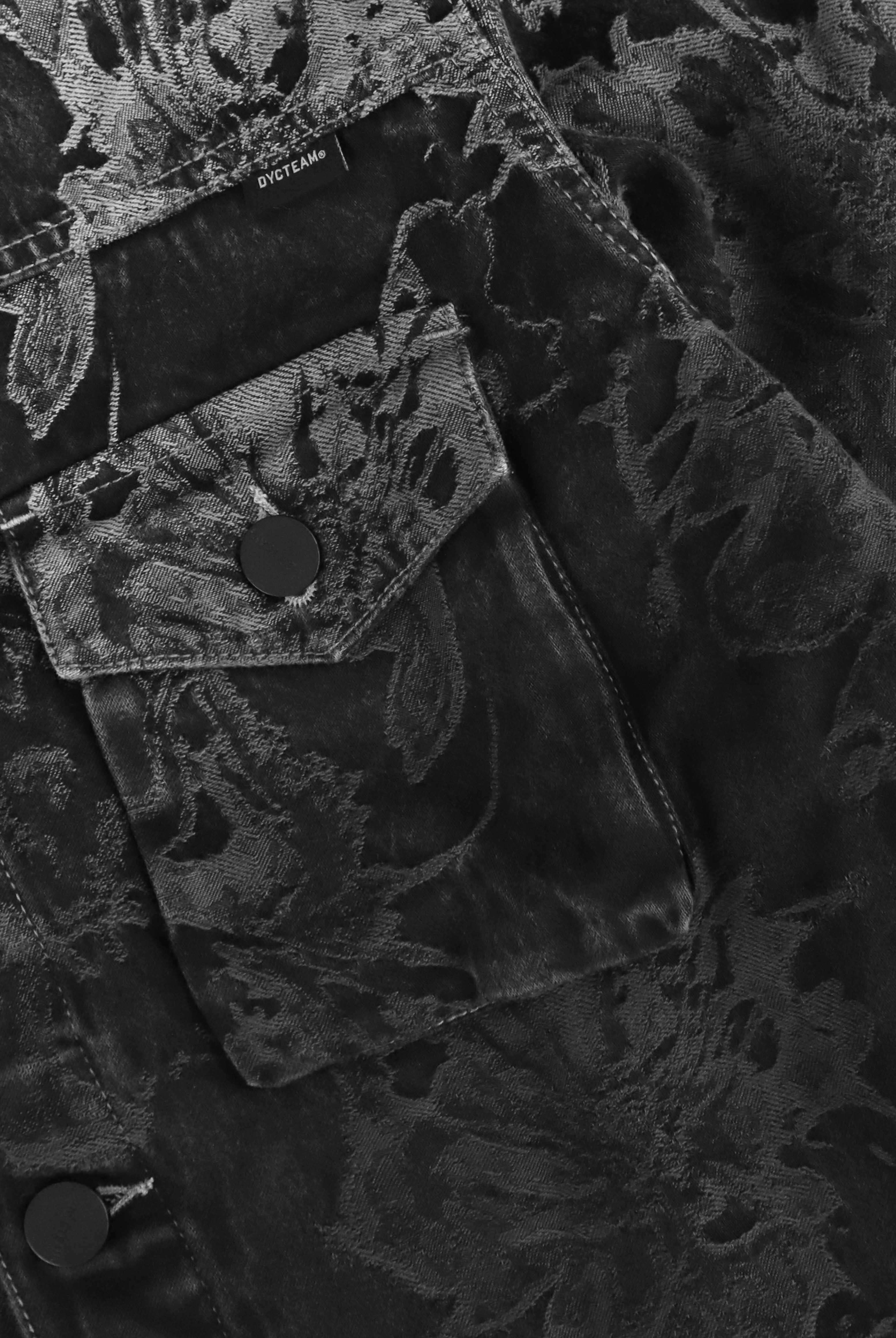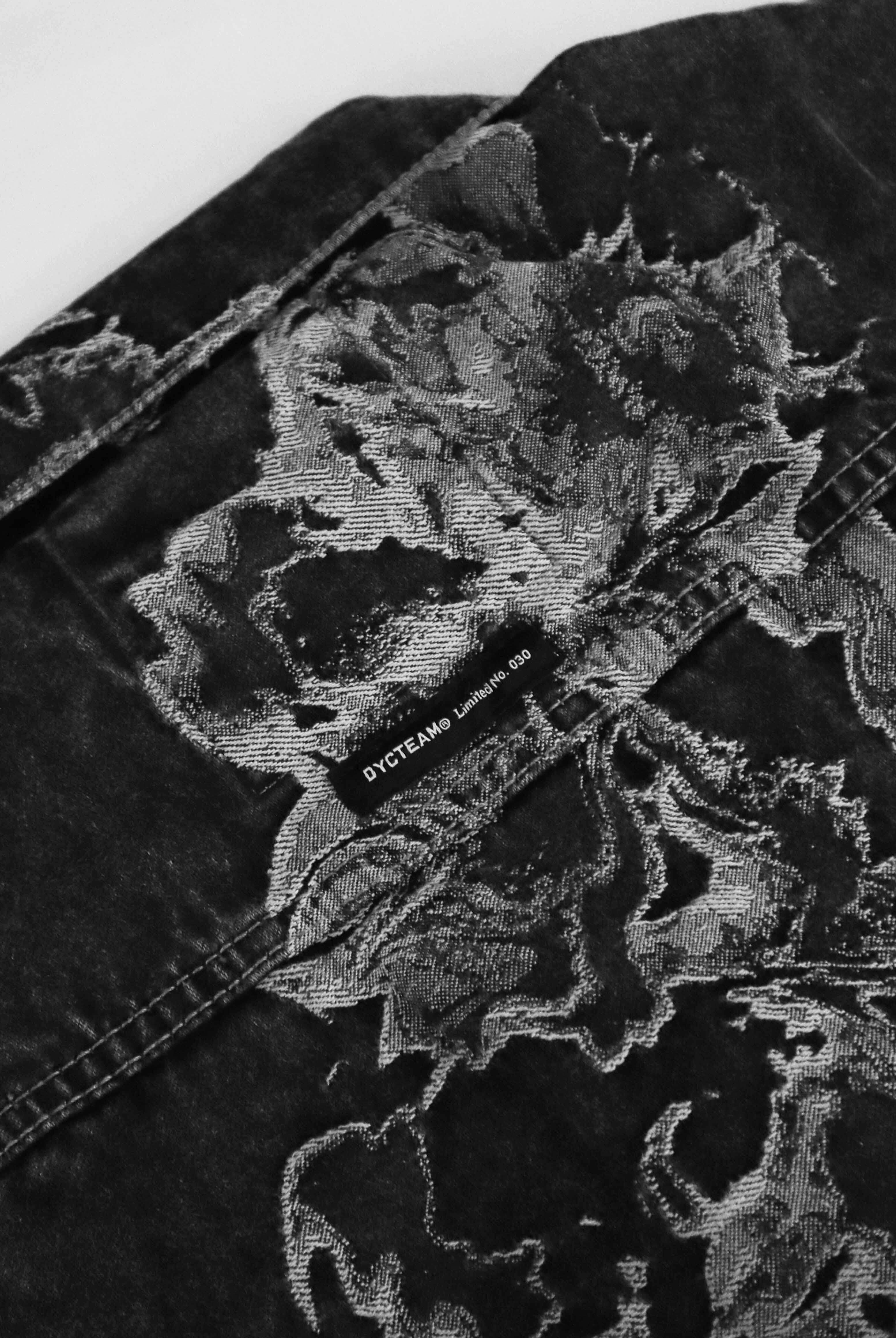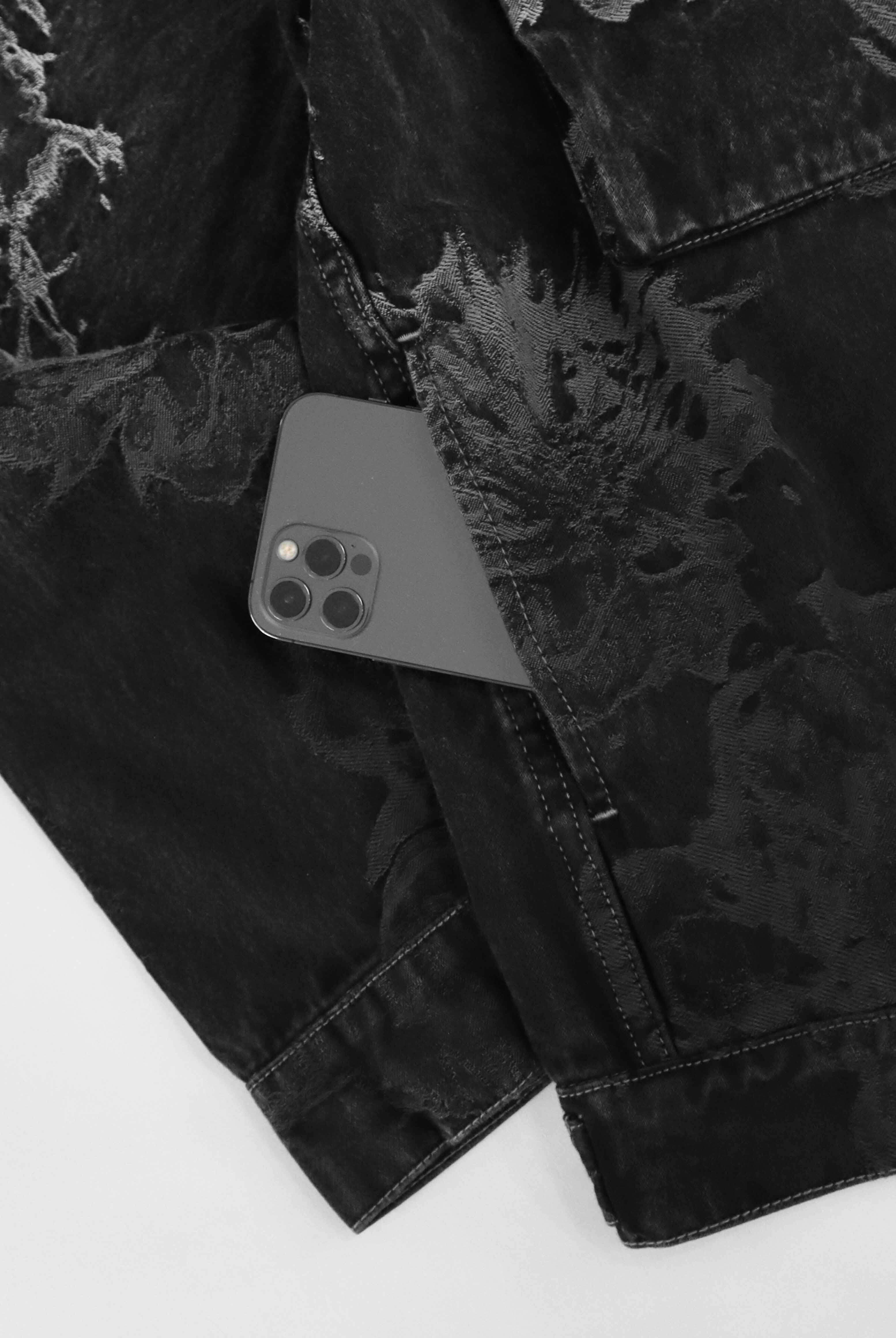 - 花朵紋緹花丹寧面料,特殊黑色漸層套染。