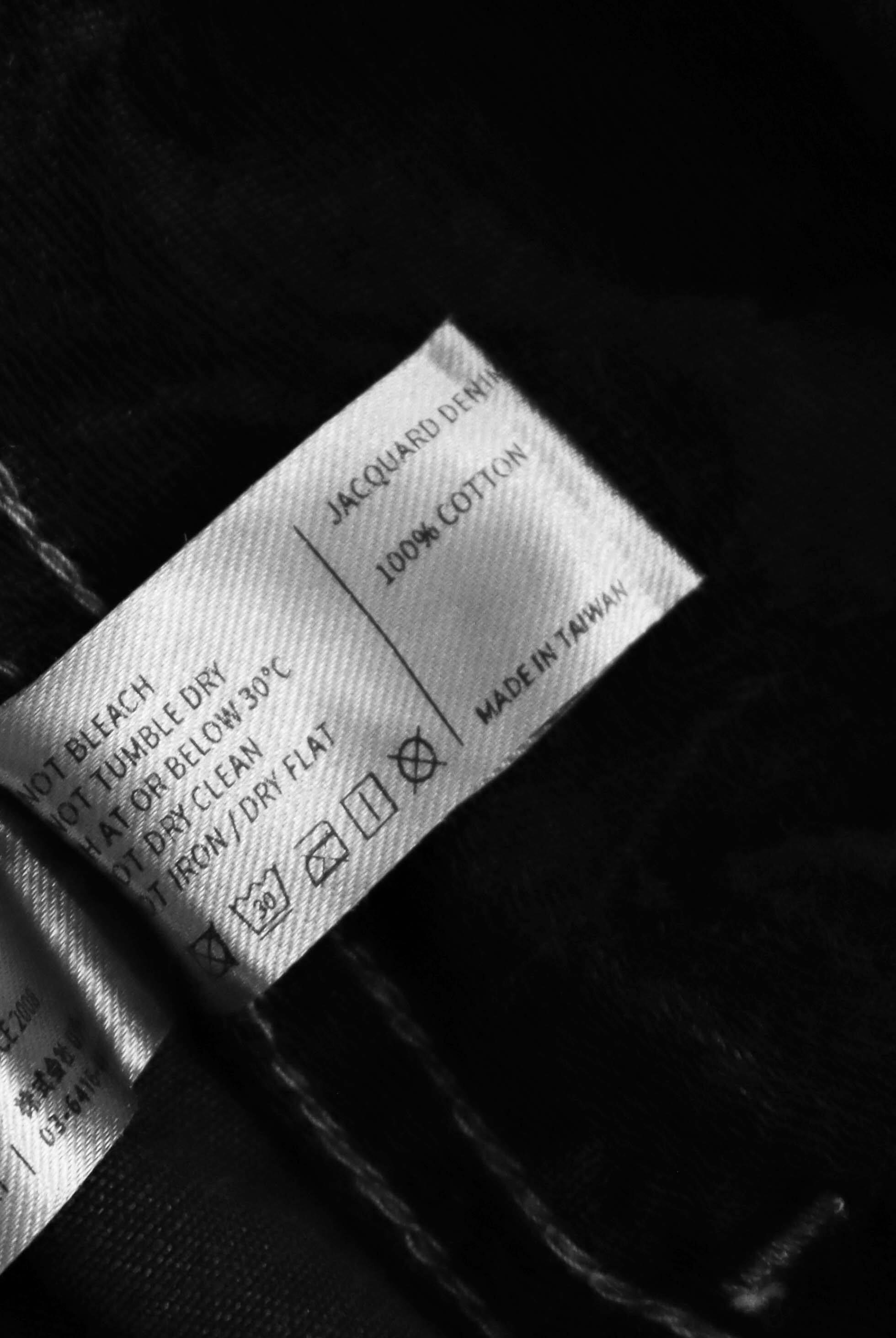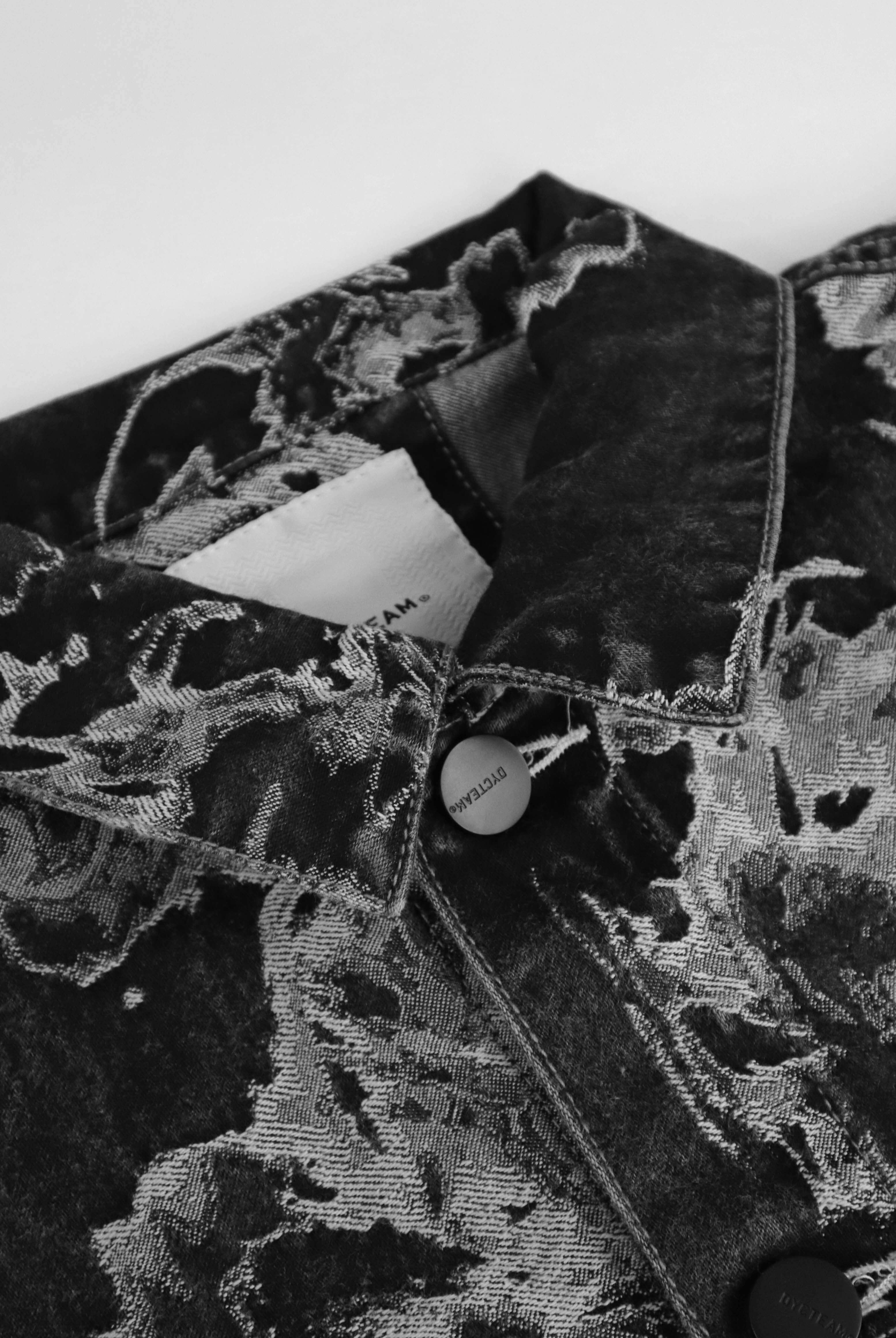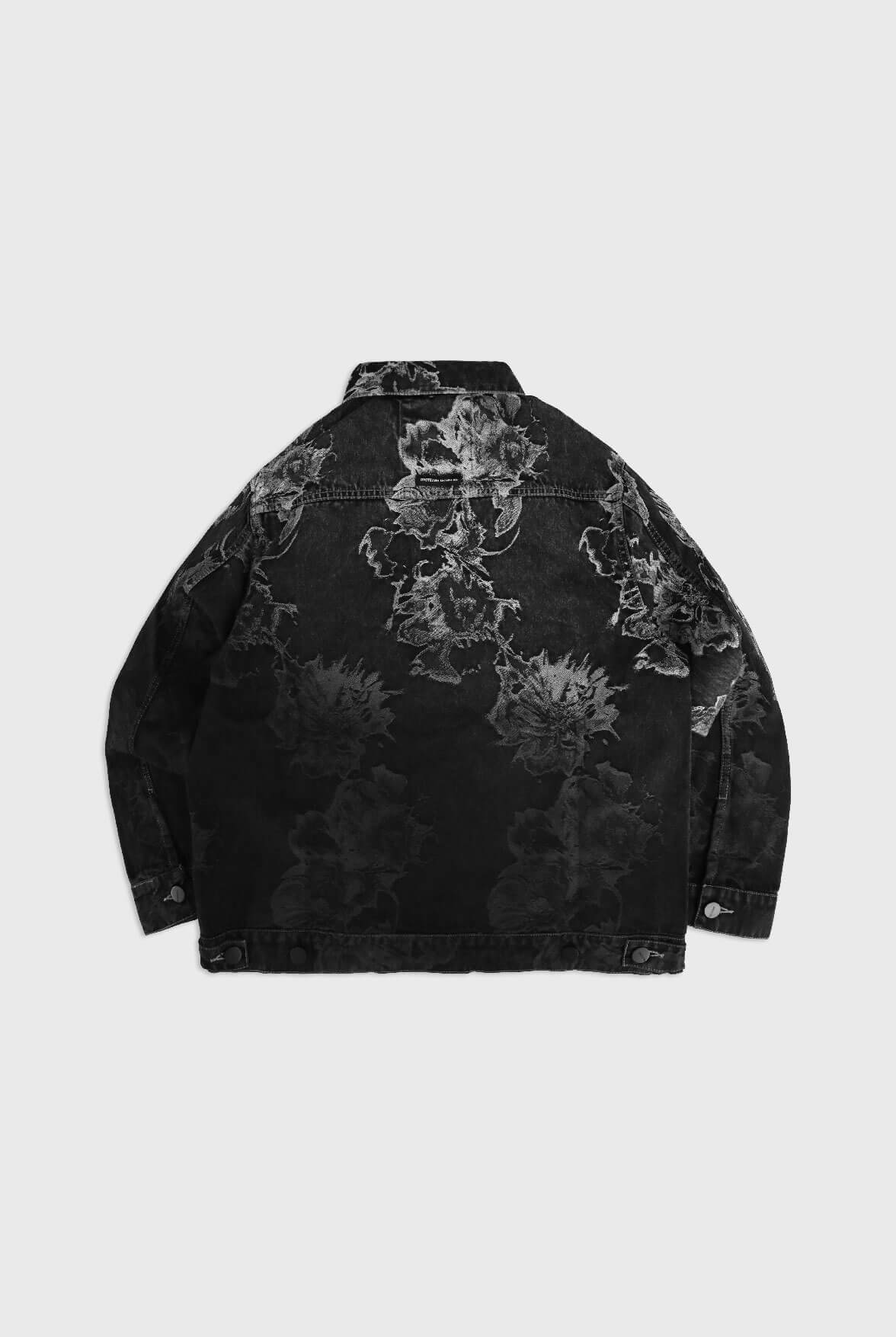 - 花朵紋緹花丹寧面料,特殊黑色漸層套染。