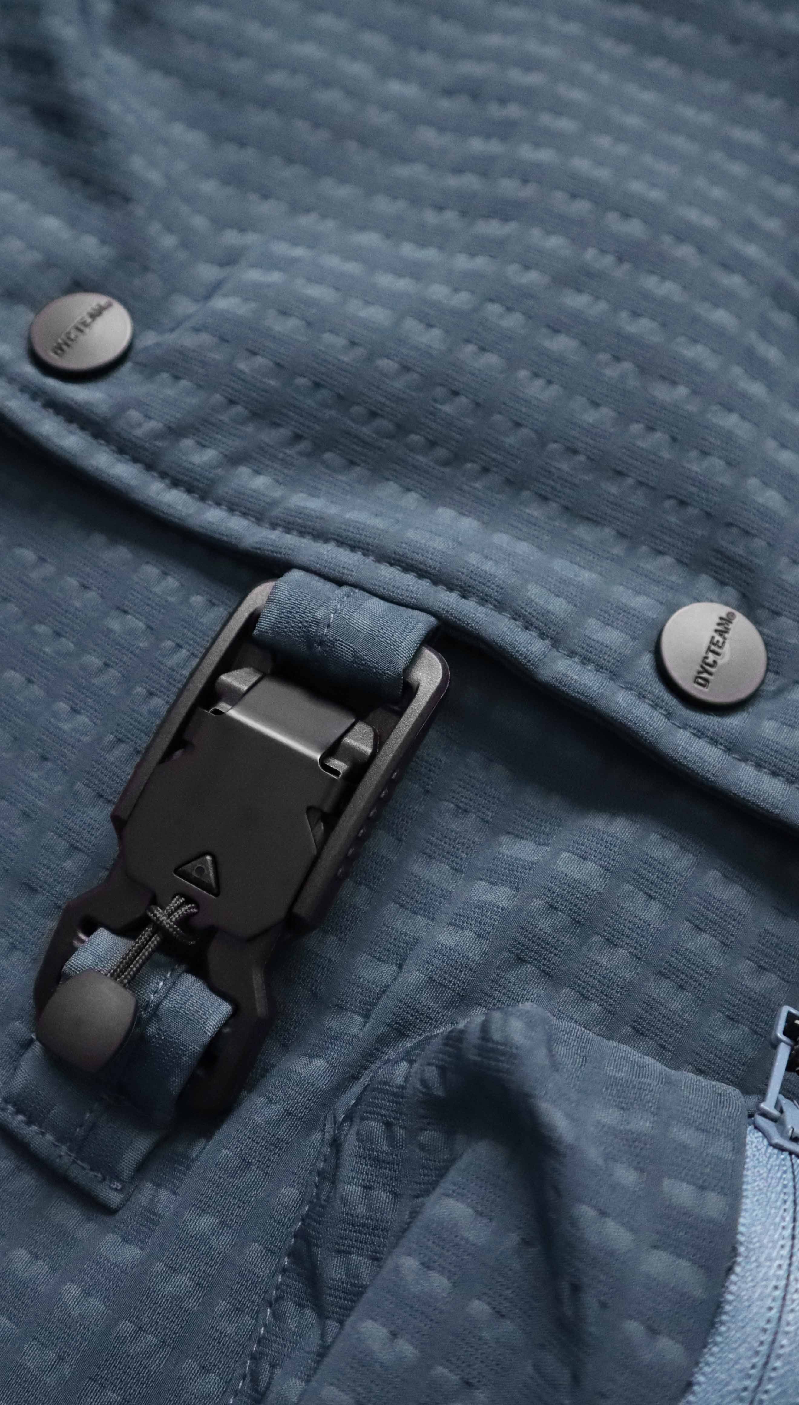 - 微寬鬆扣具西裝外套、面料具防潑水效果、FIDLOCK快拆扣具開合。
