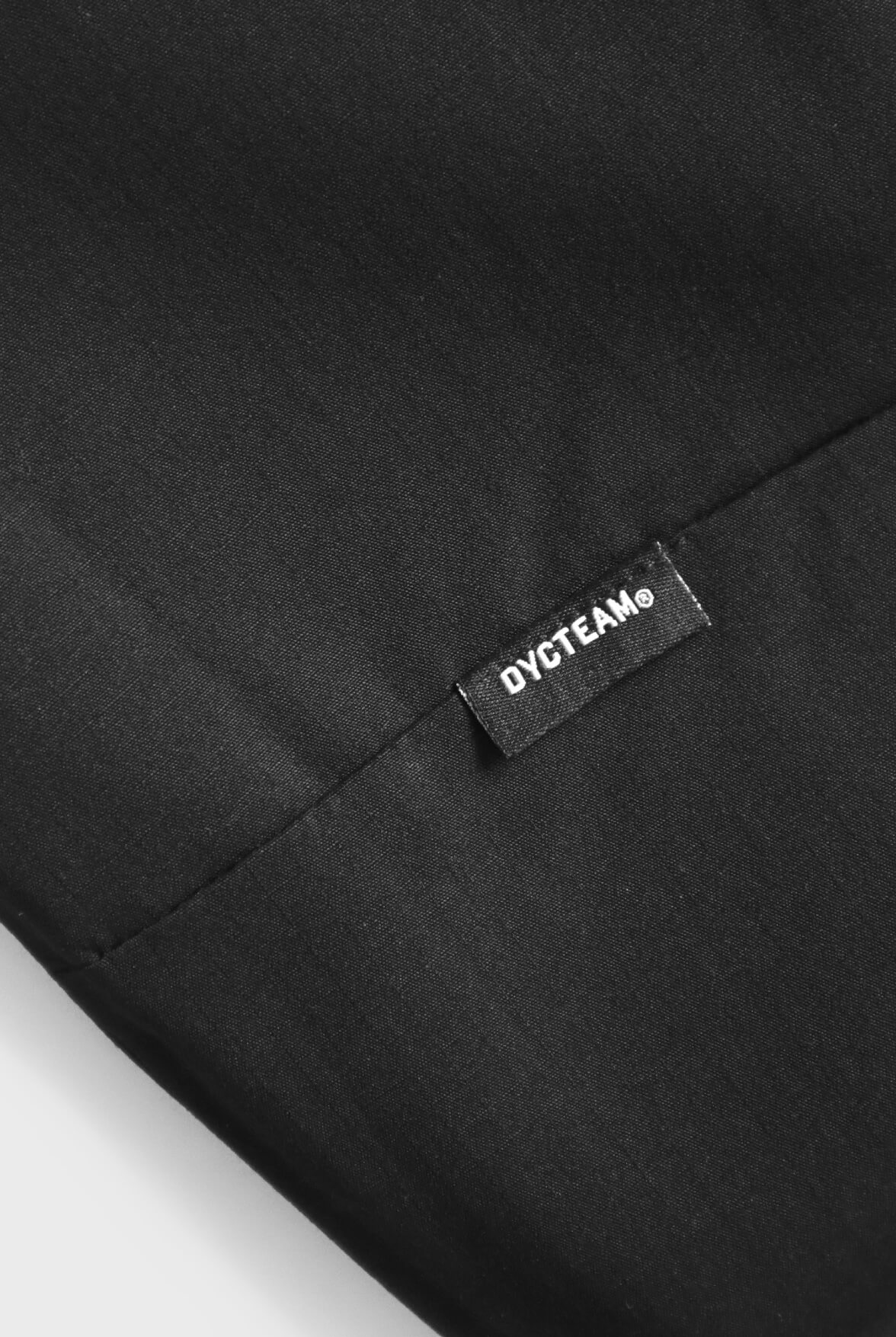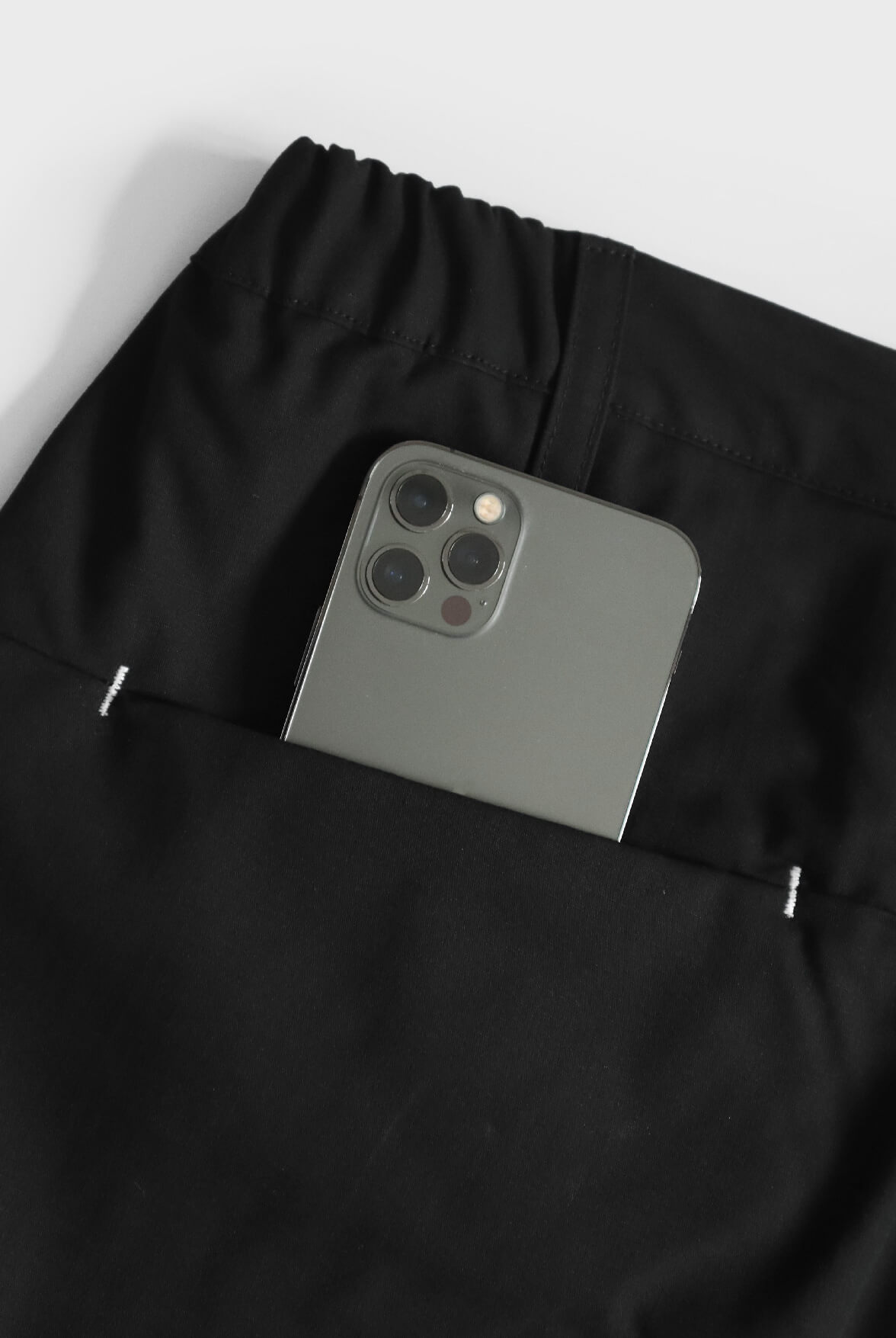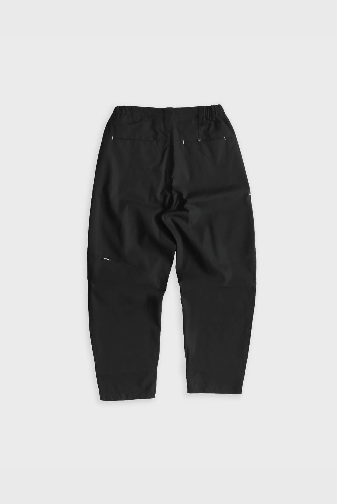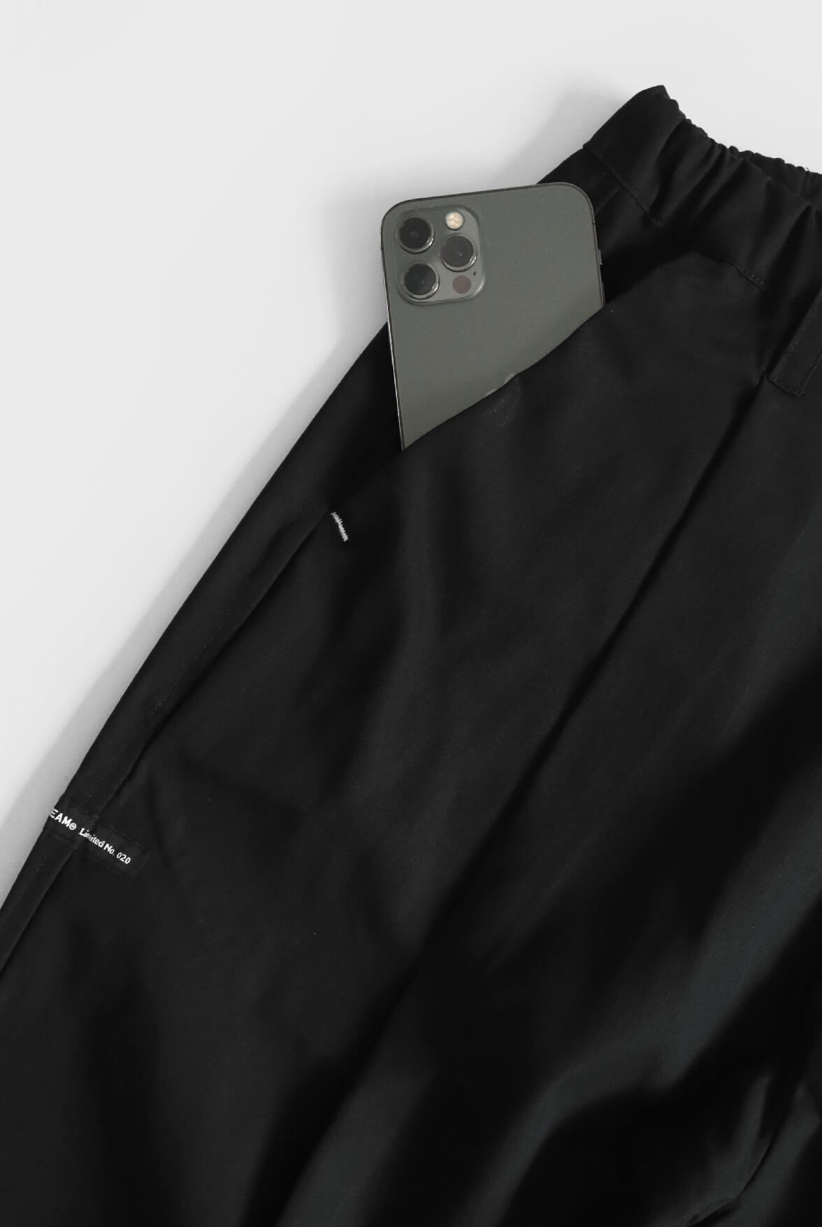 - 細小格紋防潑面料、寬鬆版錐形長褲。