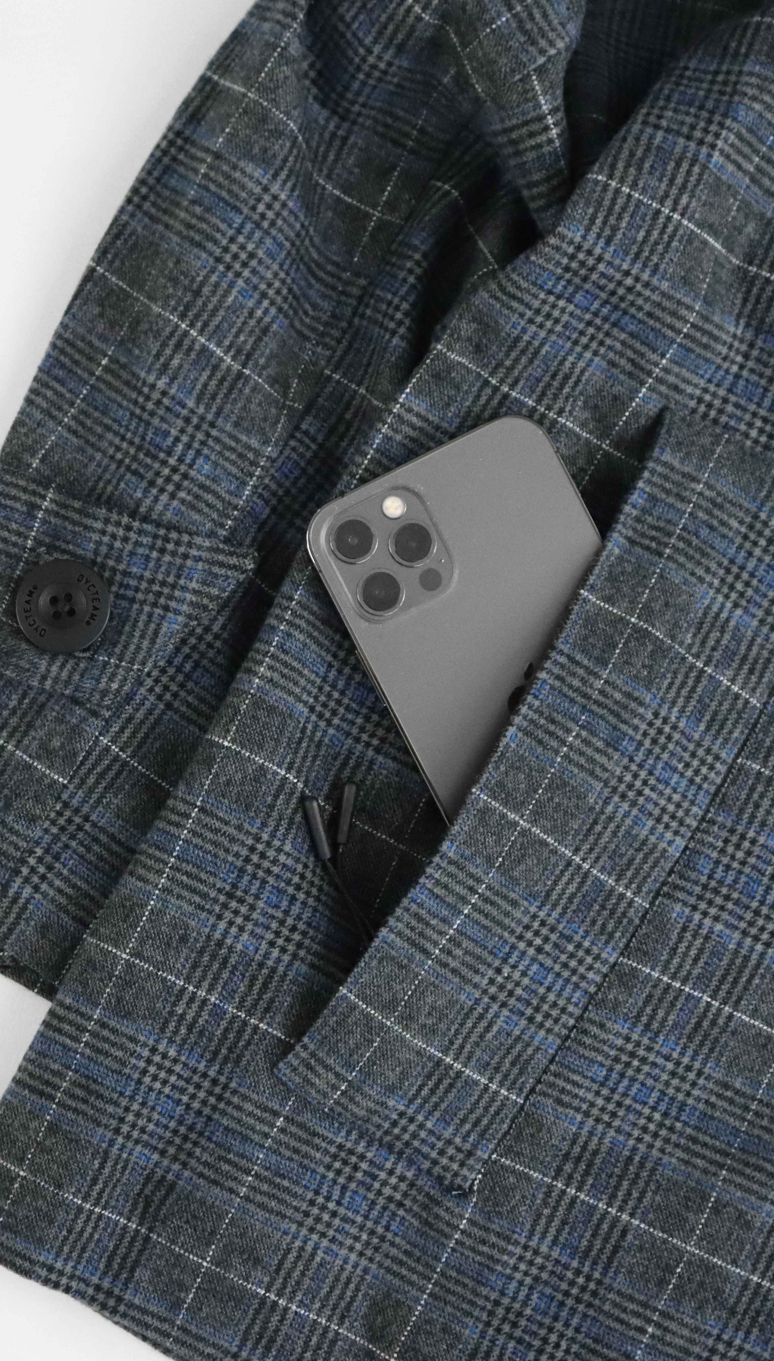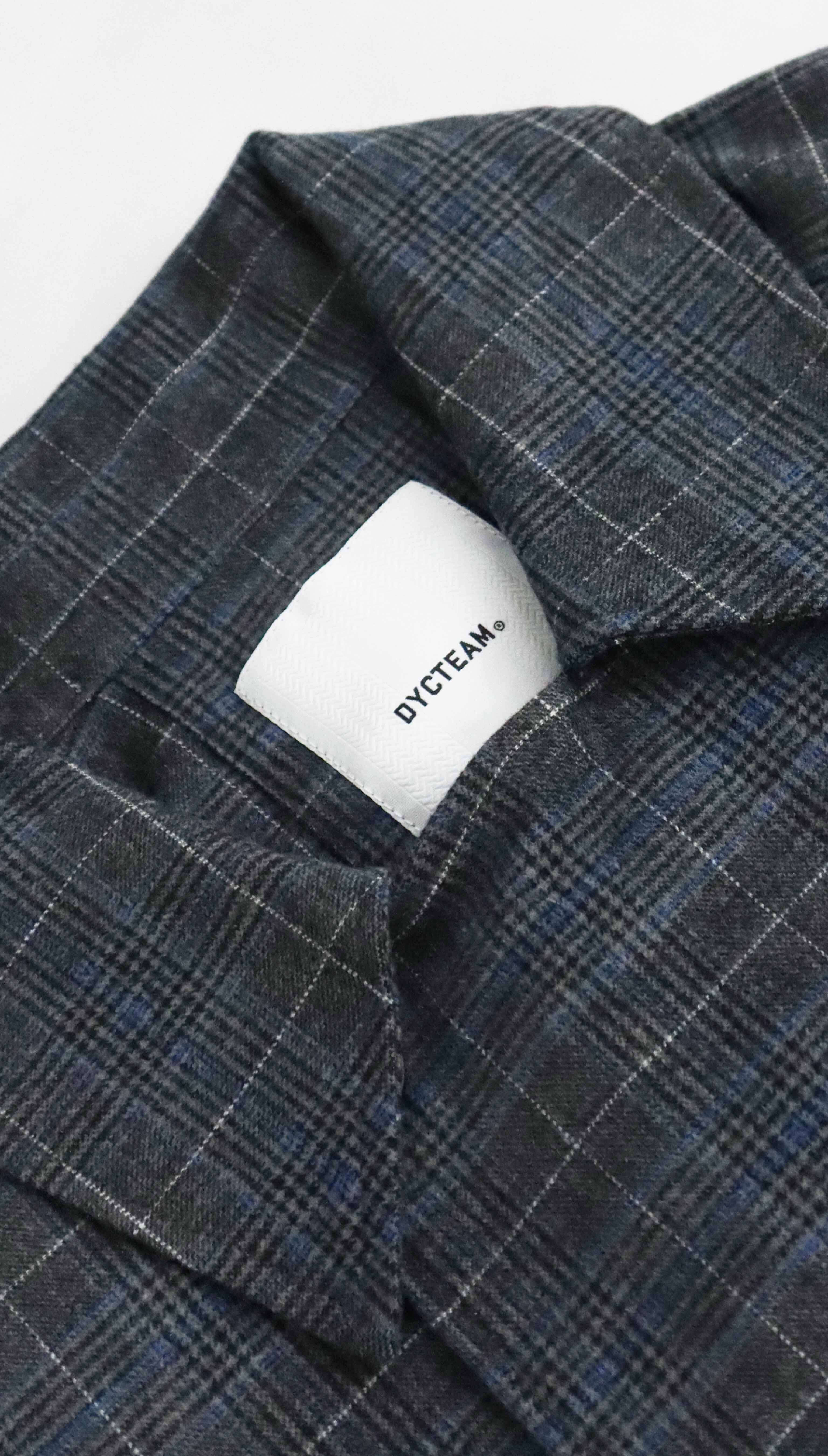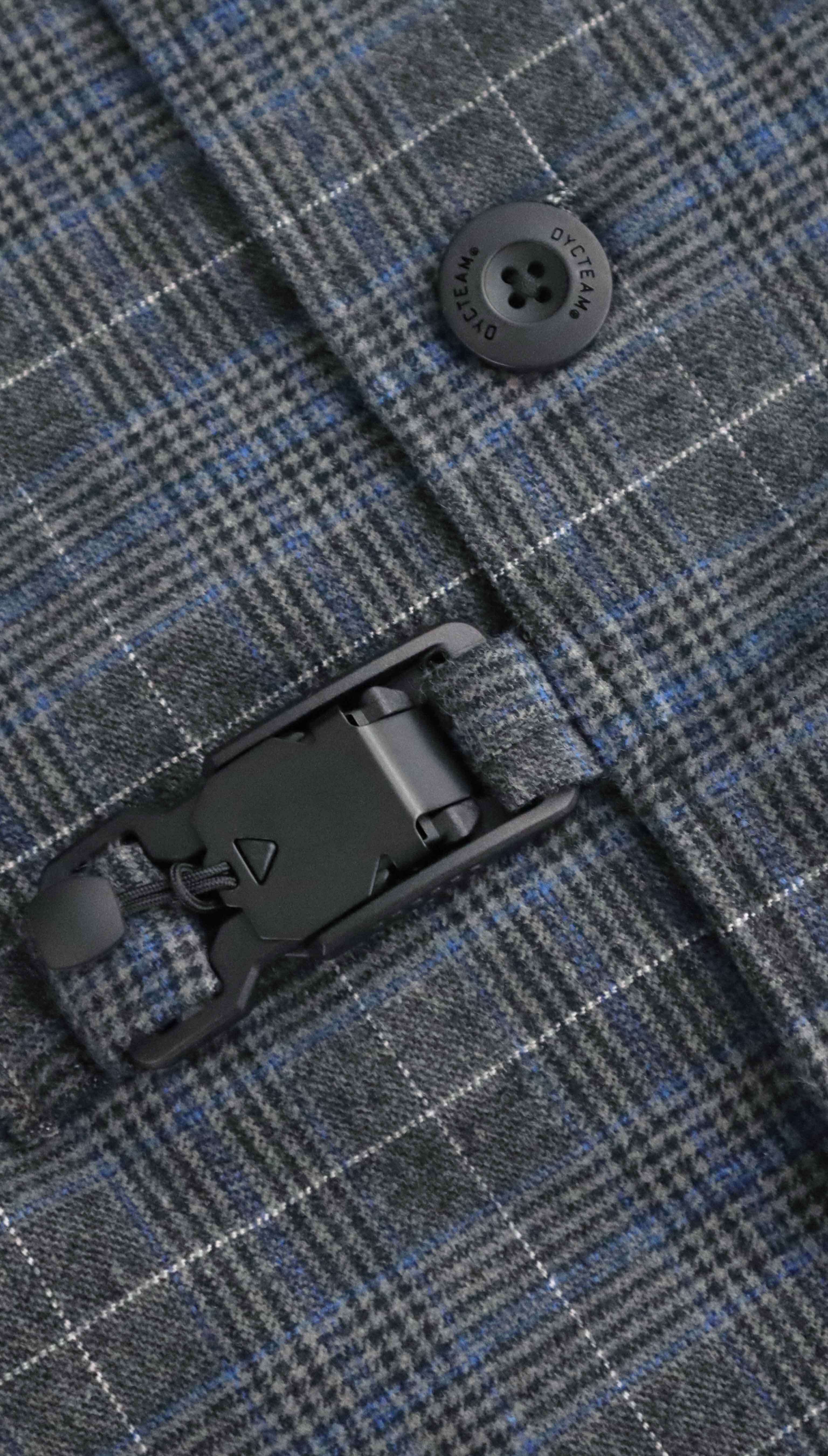 - 灰藍格紋磨毛觸感,表面做3M防潑處理,微機能呈現。