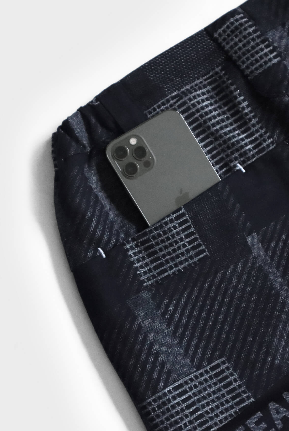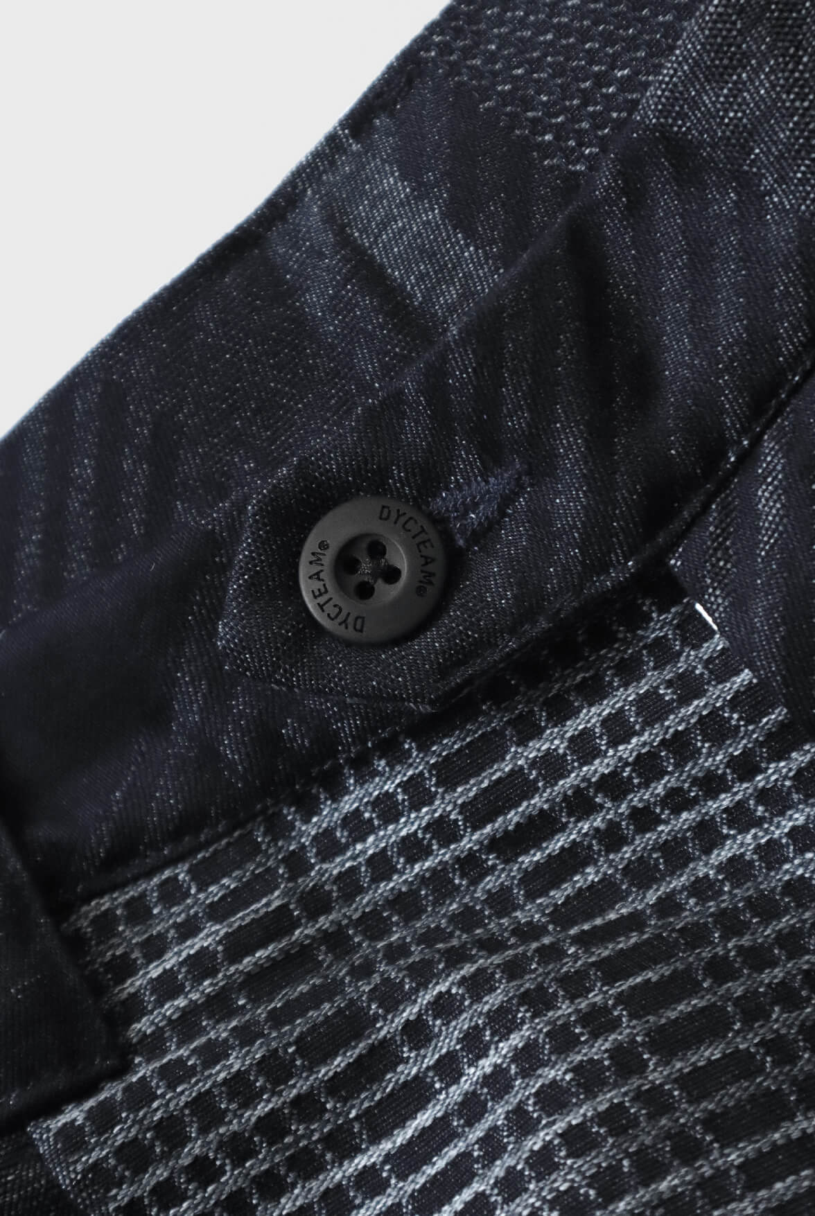 - 鬆緊褲頭,多處白色打結線綴飾。