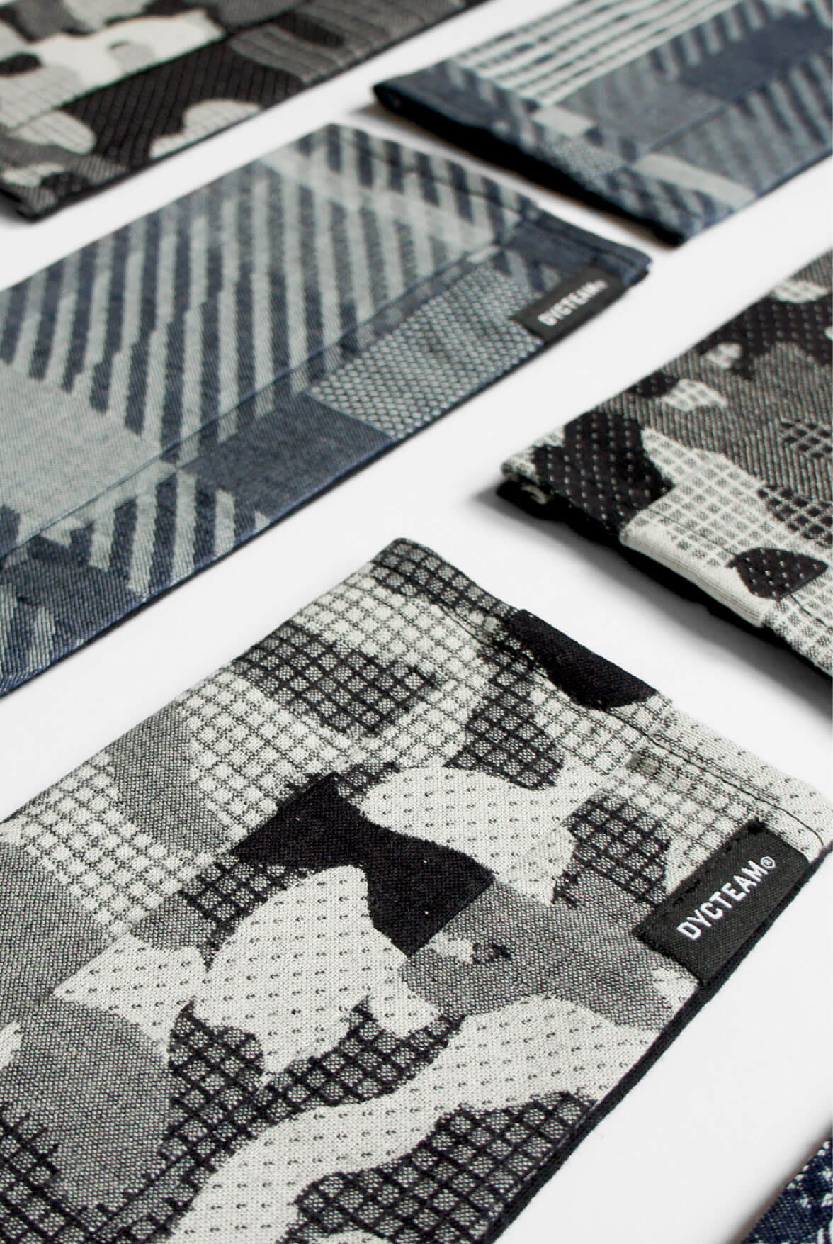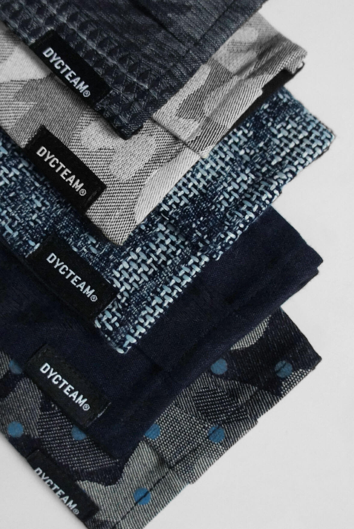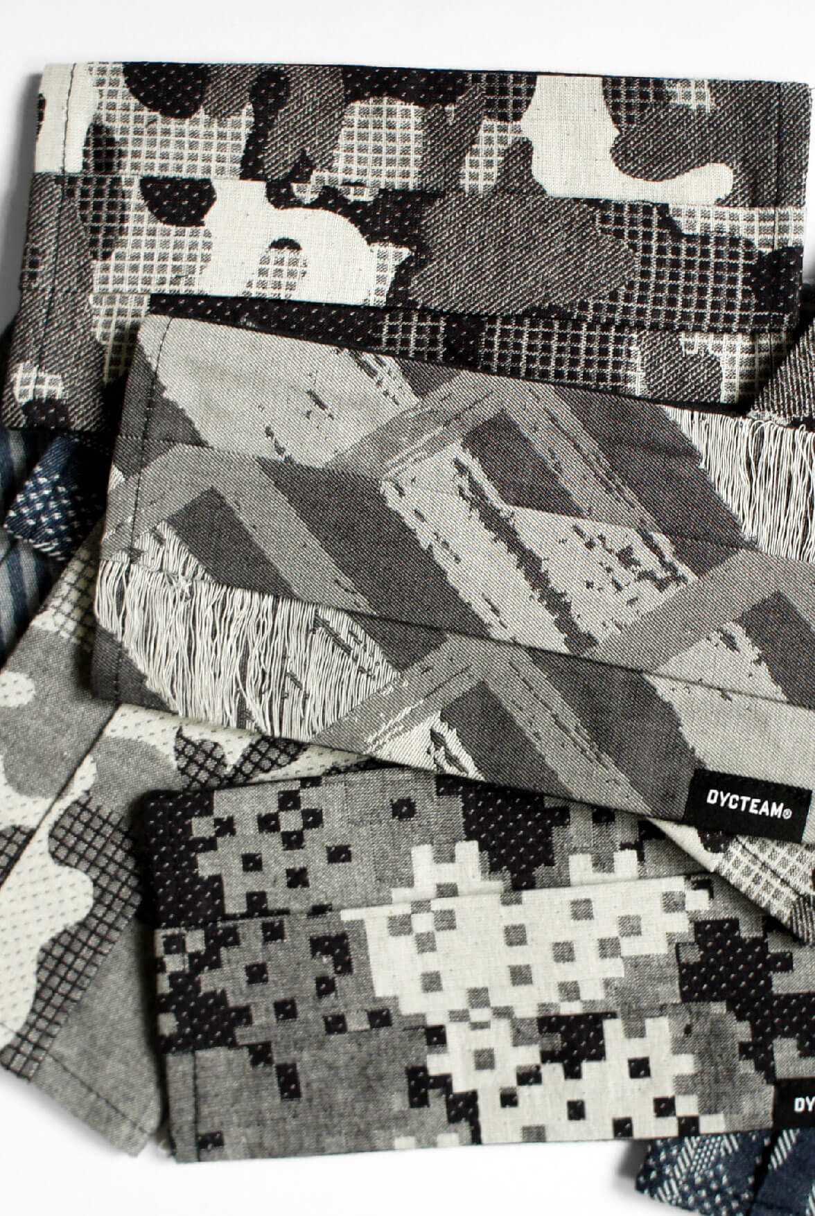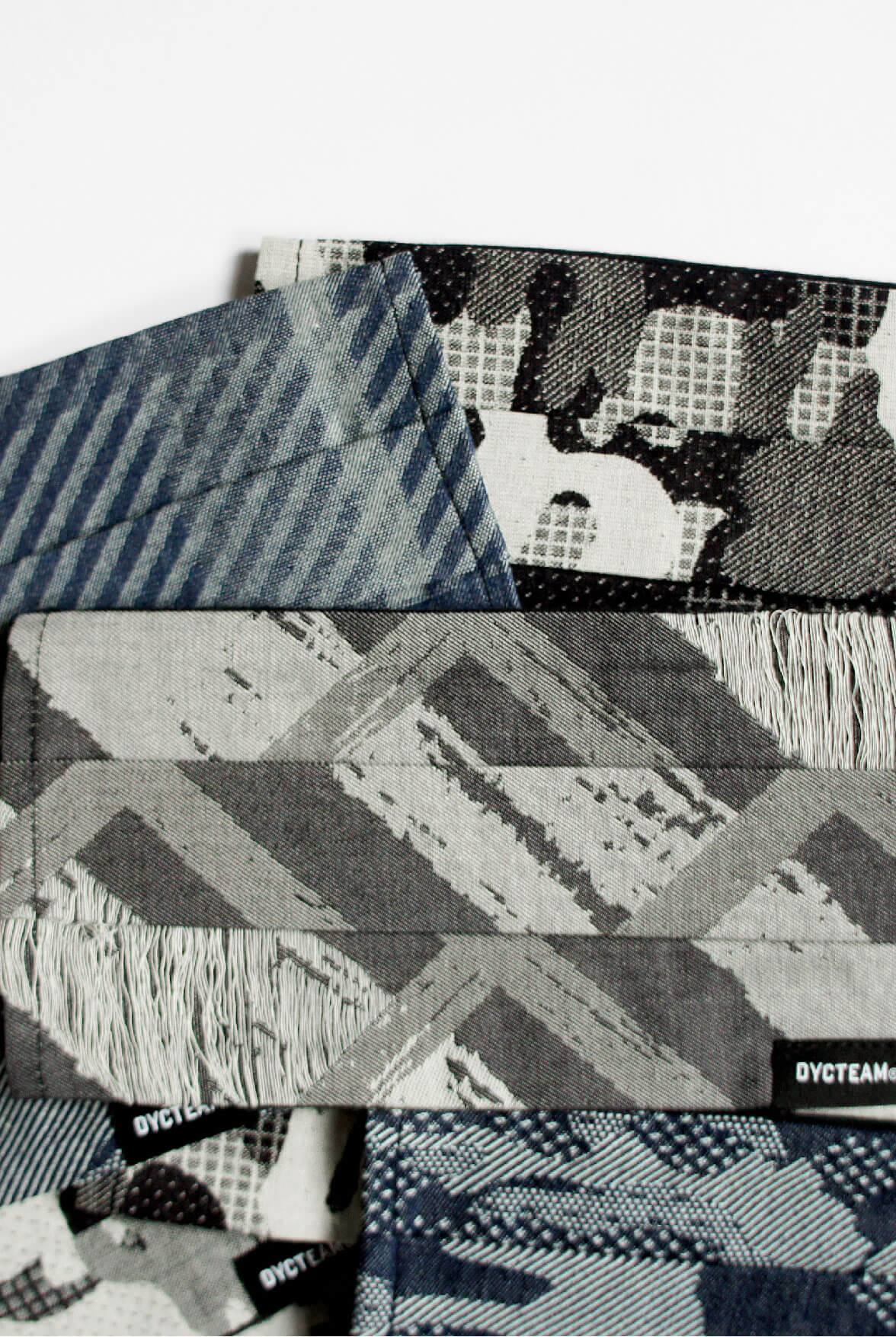 在每一件服裝的製作過程中,大部分都會產生非常大量裁剩的面料,這些布塊若沒有其他的用途最後都會成為垃圾,丟至回收場甚至被焚燒掉;為減少不必要的浪費,DYCTEAM將這些裁剩的布塊發展出其他用途,「RE NEW : made with leftover fabric」利用製作剩下的布料、邊角再製成新單品,賦予其新生命。這些再製成的新生命都是獨一無二的,必須花費更多的時間及精力找出合適的大小,並用拼接的方式將較碎的邊角車縫成面,再產出新的單品;雖然費工,但是在這個過程中我們也不斷的反思,在這個資源便利的環境下,是否在無形之中浪費了許多、失去了許多,並時刻的提醒著地球資源帶來的便利,不能再隨意的浪費下去。