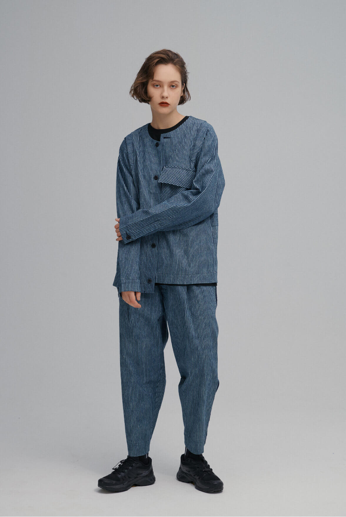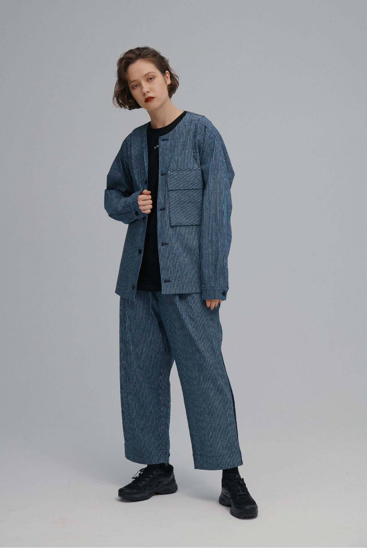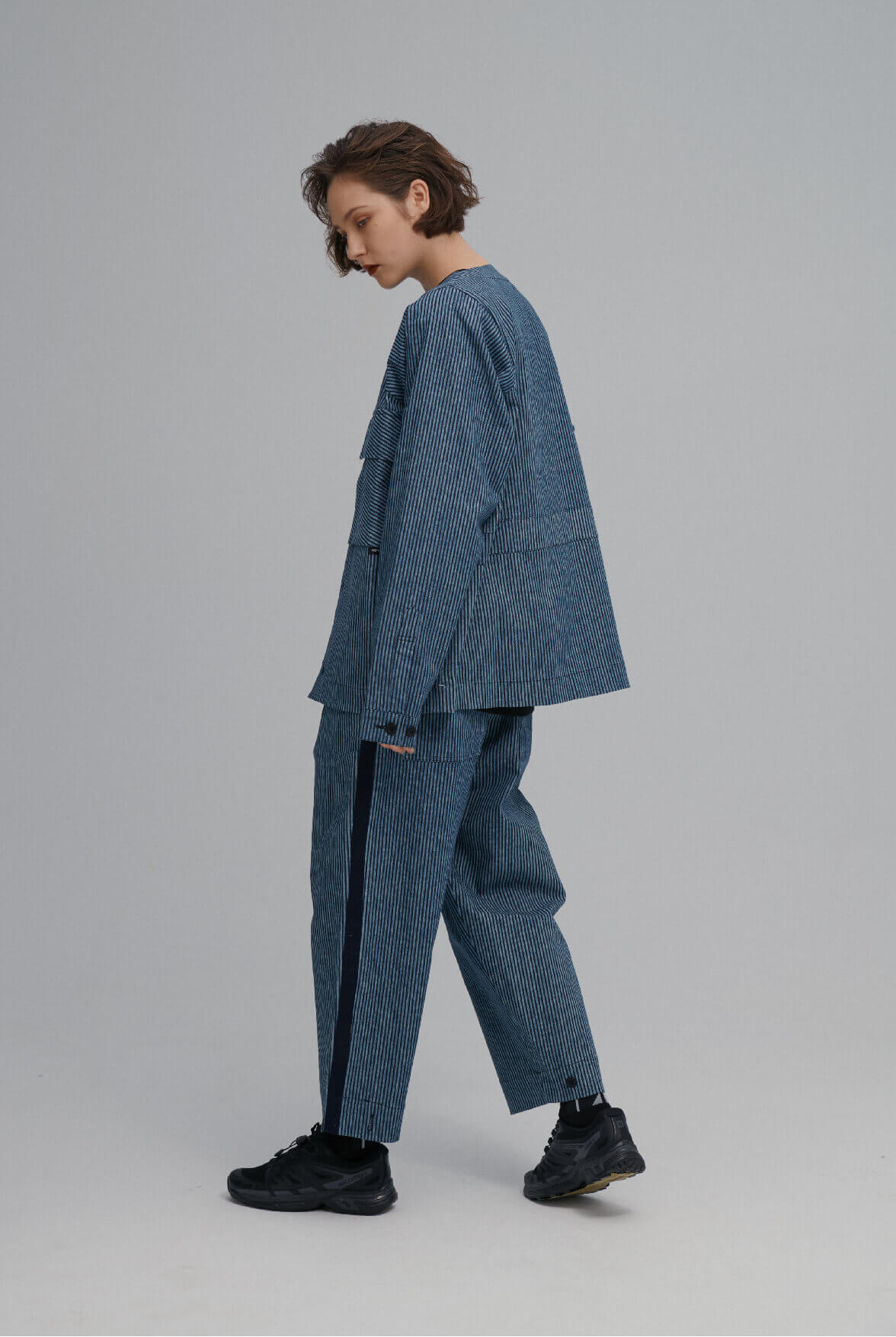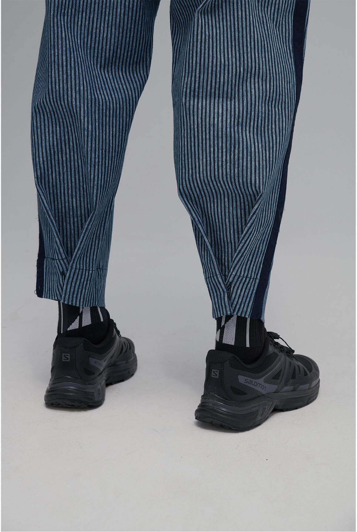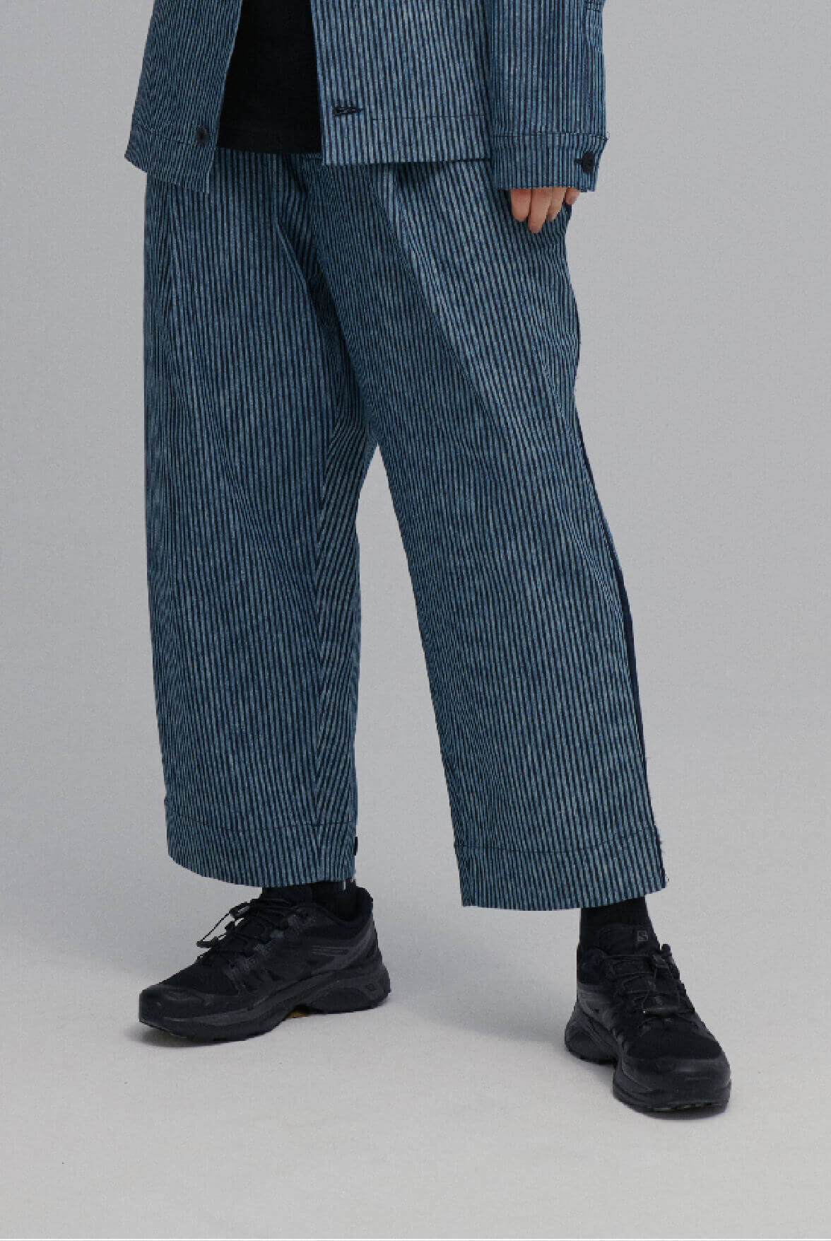- 條紋寬版長褲。
